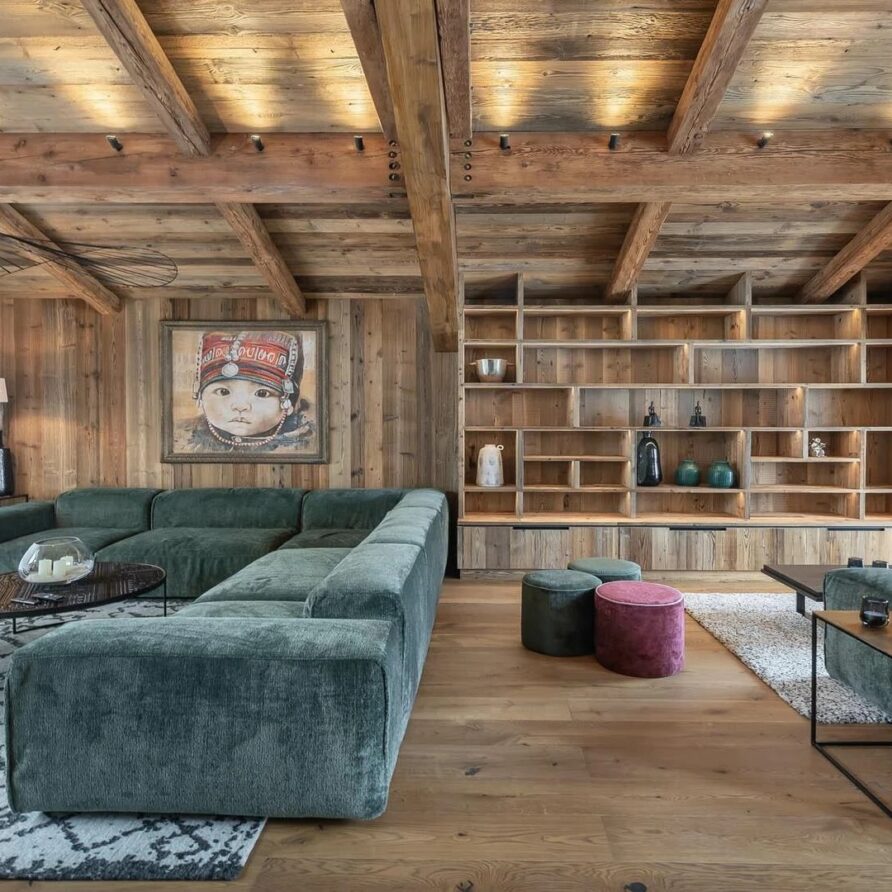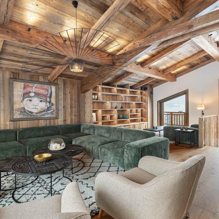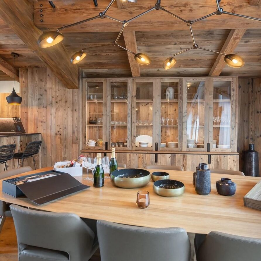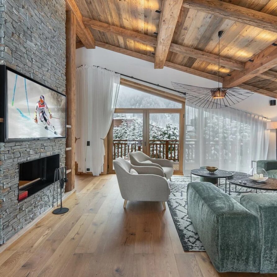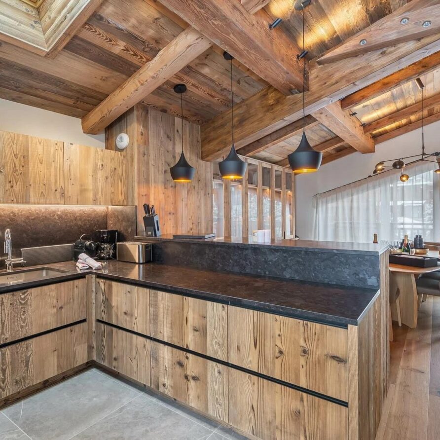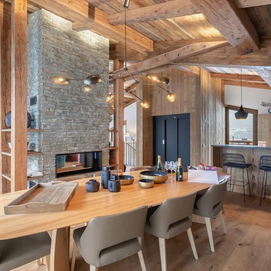 The chalet presents itself as an elegant five-bedroom accommodation with a maximum capacity of 10 guests and top-notch amenities. At the holiday chalet’s peak, the spacious open-plan living area shows off stunning modern design mixing natural stone and wood to create a classy yet welcoming feel. A comfy lounge area gives plenty of room to relax, with plush furniture and an eye-catching fireplace in the middle adding warmth and appeal to the room. To find a quieter spot, a snug reading nook offers the ideal place to snuggle up with a book or the daily papers while still soaking in the lively vibe of the chalet.