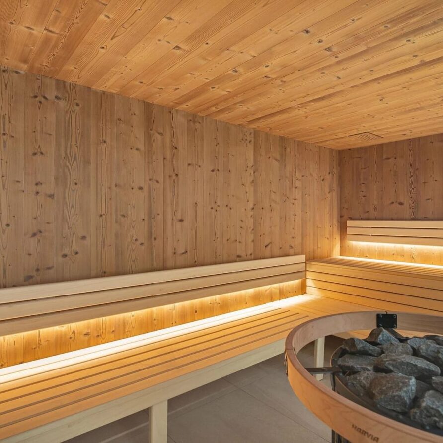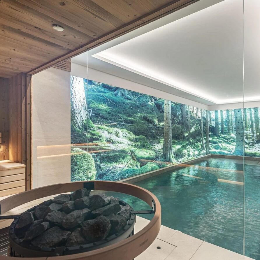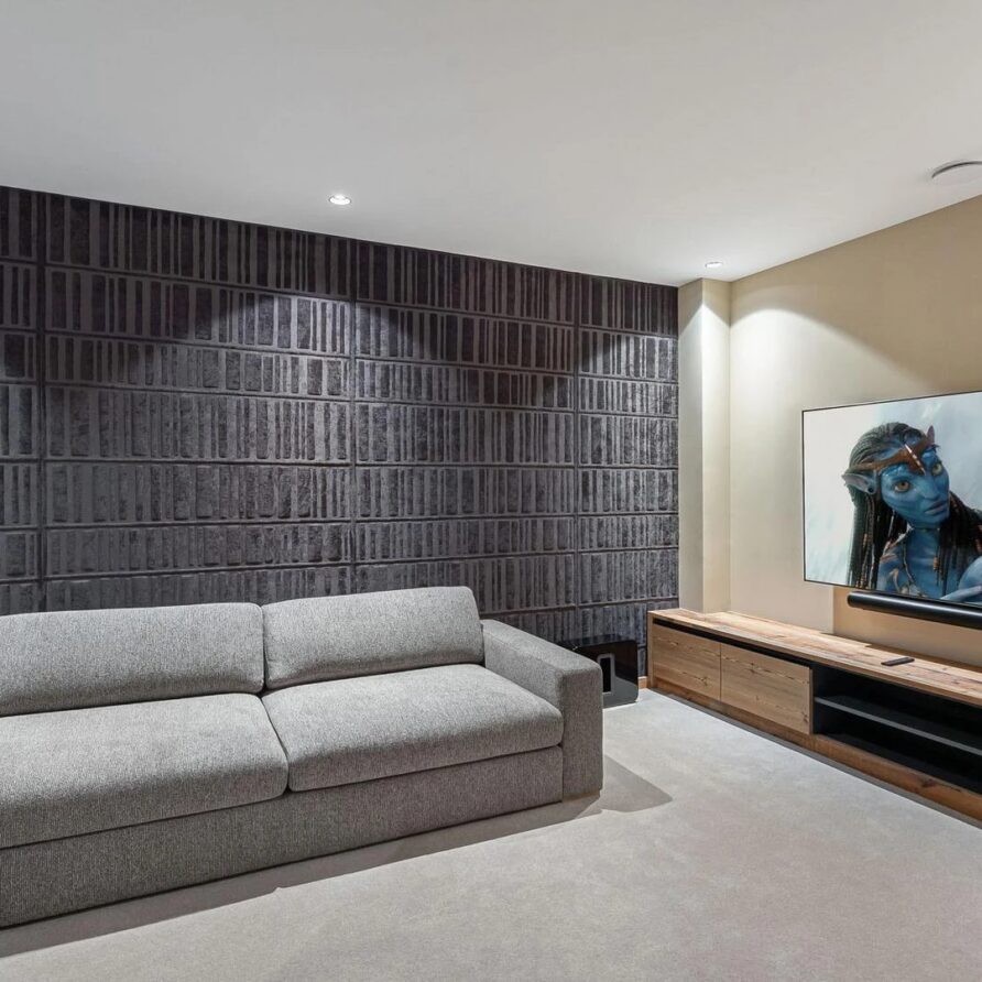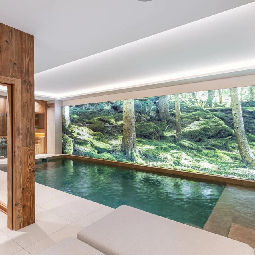 The true showstopper of the chalet sits on the lower level where you will find a private spa retreat built to help you unwind. A heated pool, sauna, and quiet rest area offer a peaceful getaway after a day on the pistes surrounding you with calm. One floor down, guests find the chalet’s movie room, a cozy space with comfortable couches and immersive surround sound perfect for watching films together.