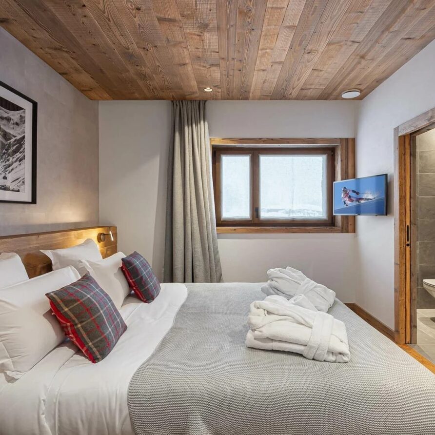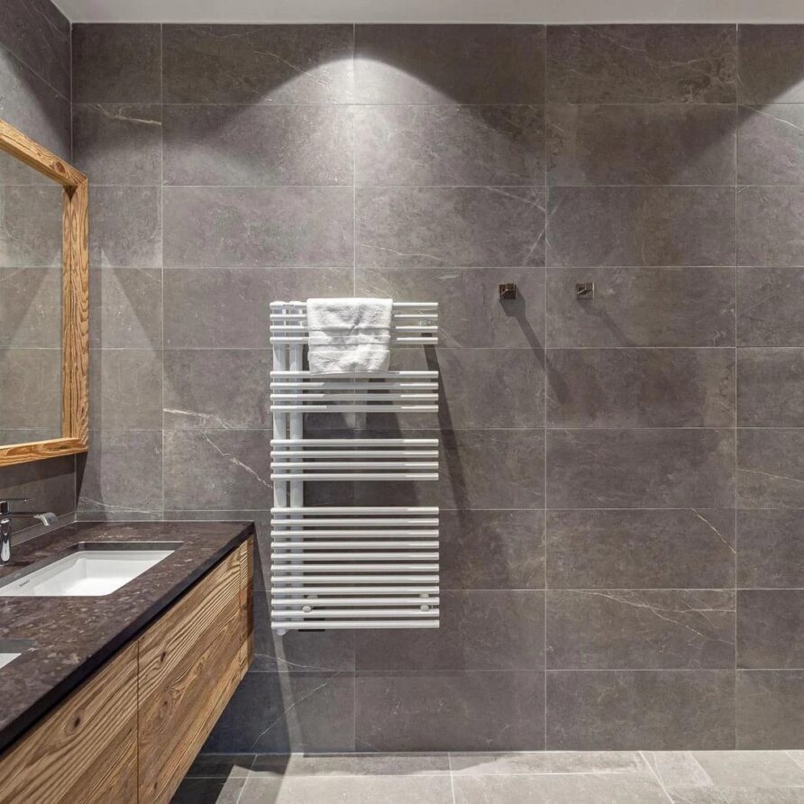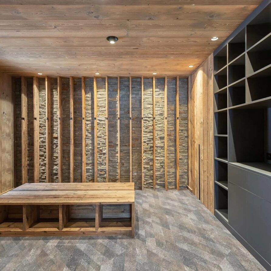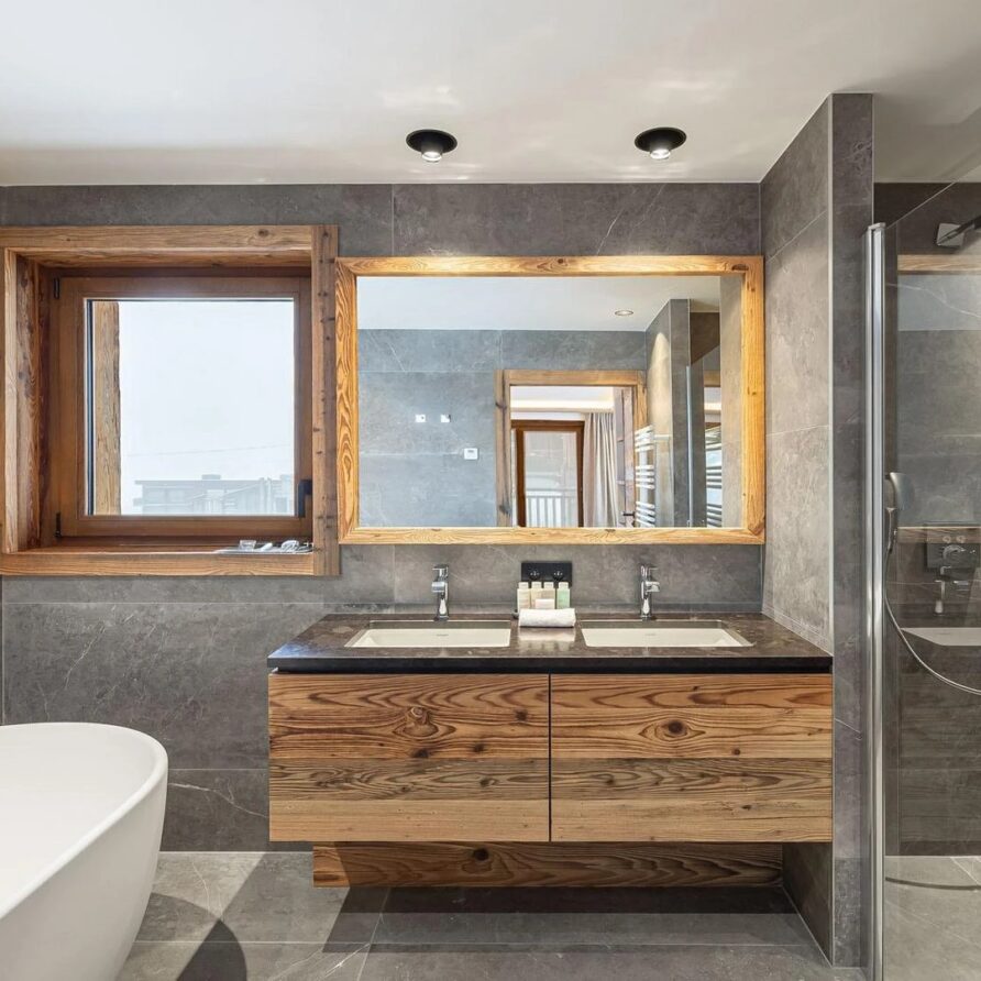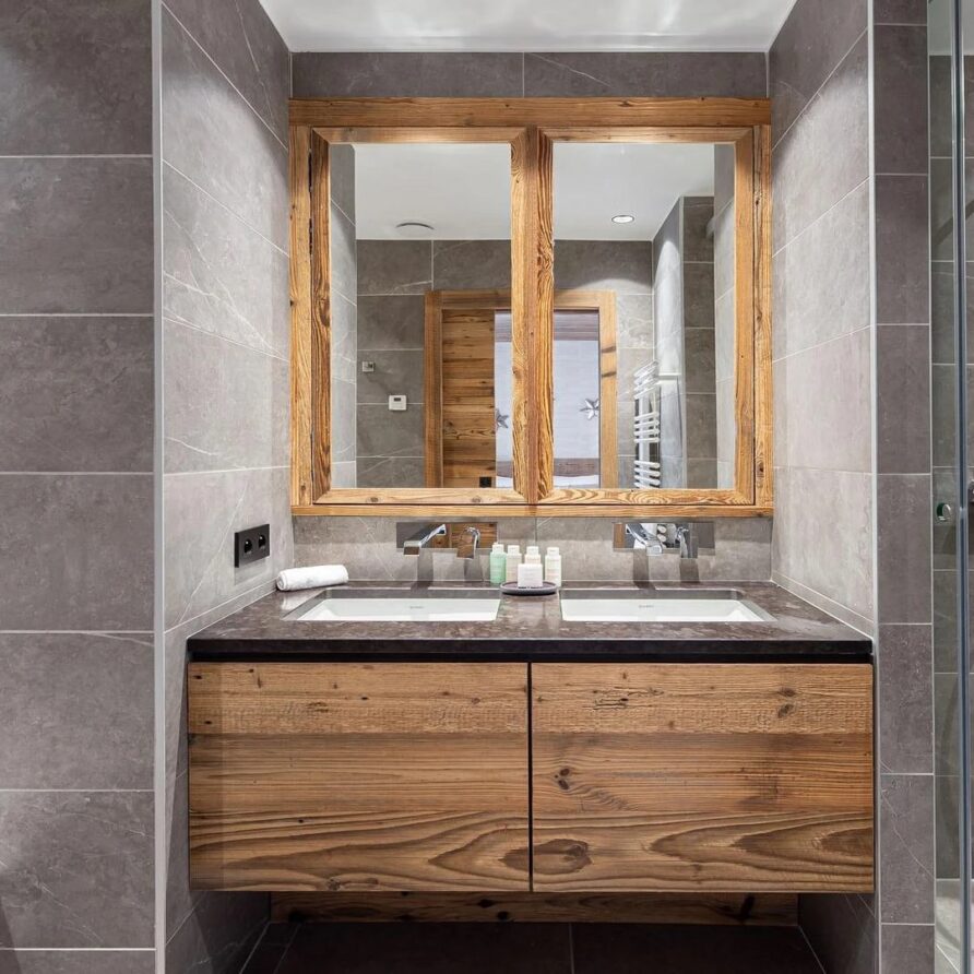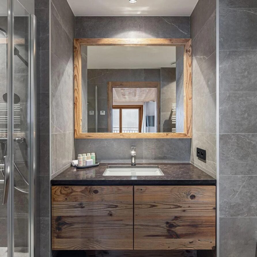 The ground floor houses two more bedrooms that keep the chalet’s elegant look, with en-suite bathrooms and a beautiful mix of local wood and grey slate. This combination creates a balance between modern design and alpine tradition.