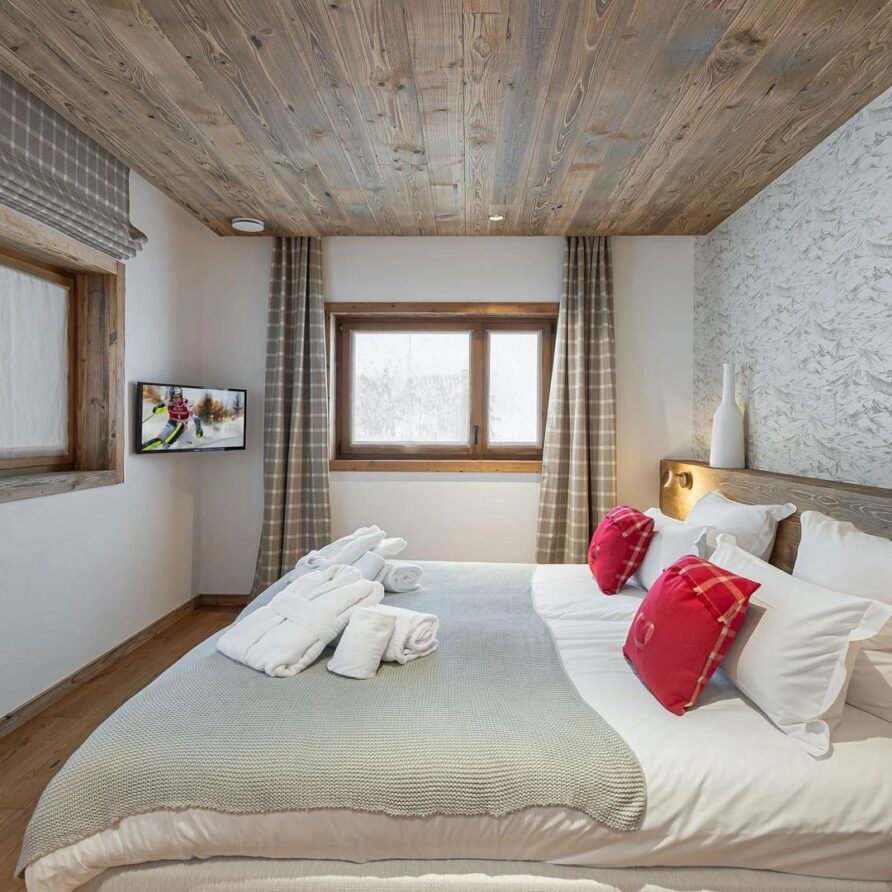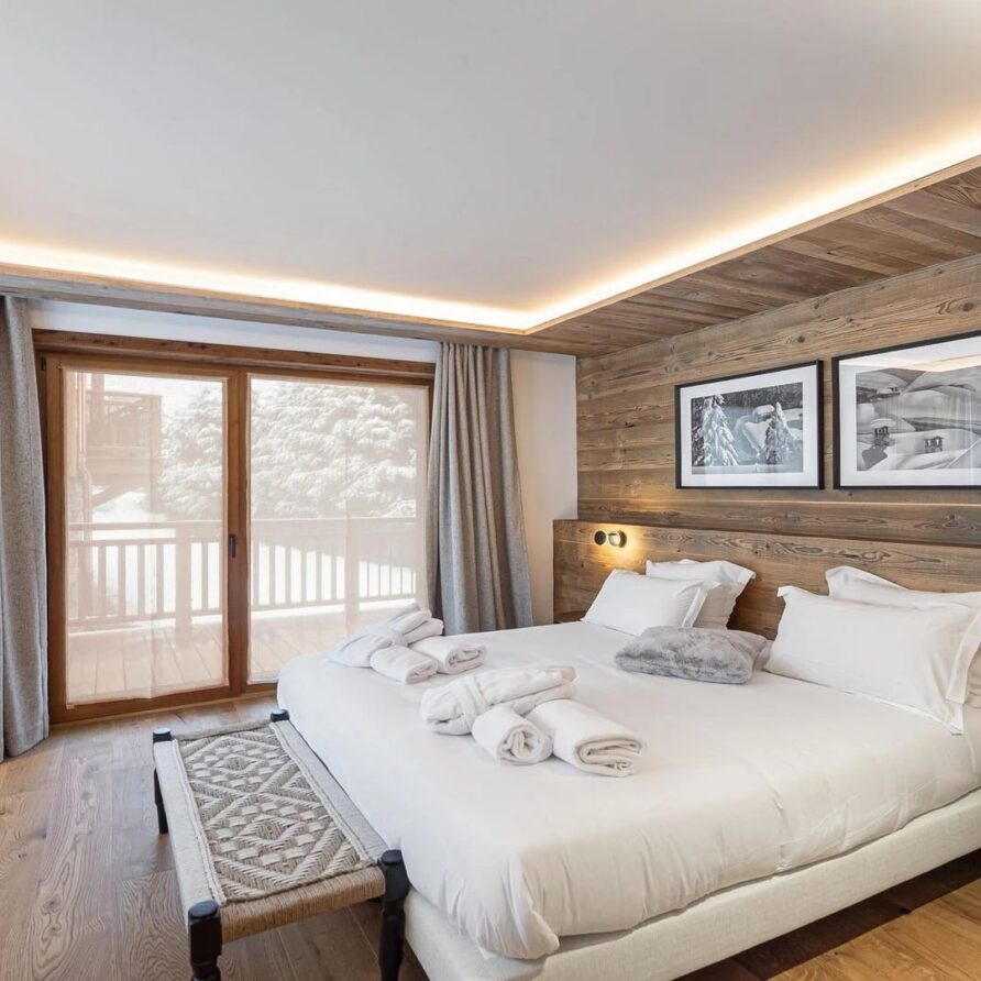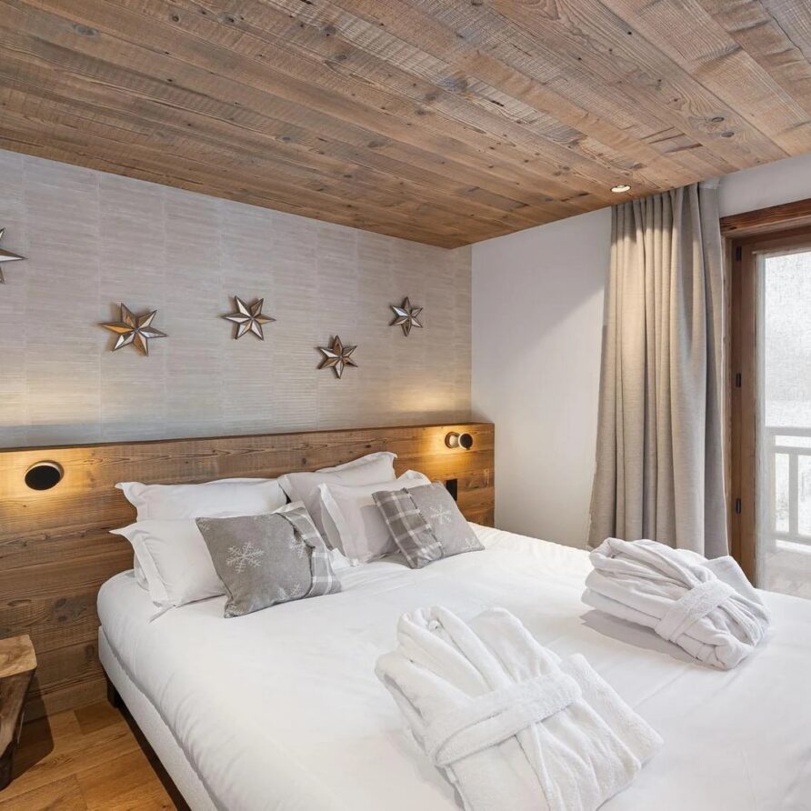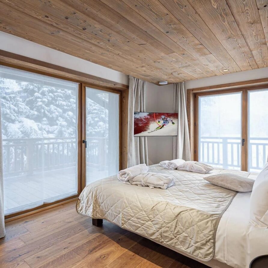 The mountain chalet offers five well-designed bedrooms to ensure peaceful nights in comfort. The first floor has three stylish bedrooms each with its own bathroom featuring modern showers and access to a private balcony. The master bedroom adds an extra touch of indulgence with a deep bathtub to soothe sore muscles. One of these rooms is adapted for guests with limited mobility making sure everyone can enjoy luxury.