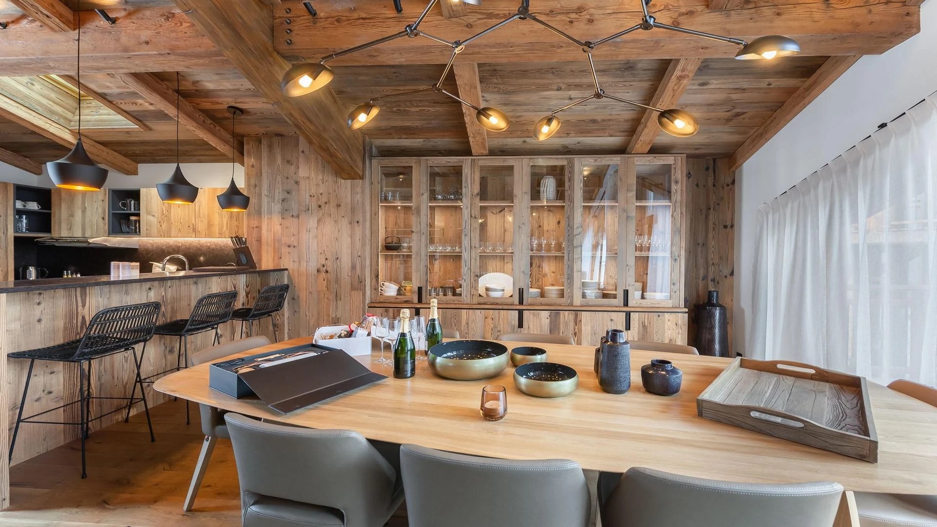 Large windows from floor to ceiling let lots of daylight into the room showing off amazing wide views of the mountains. Walk out to the big balcony where fresh mountain air and stunning views make a perfect place to have your morning coffee or evening drink. The stylish dining space and bar are in just the right place for breakfasts with baked pastries or rich evening meals shared with family and friends.