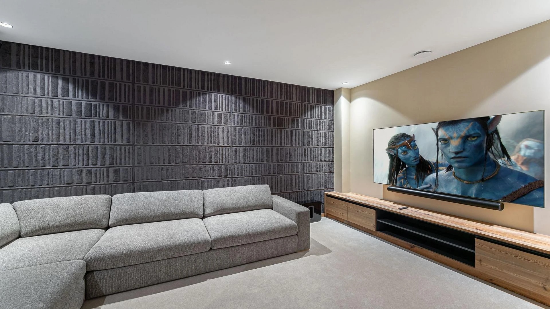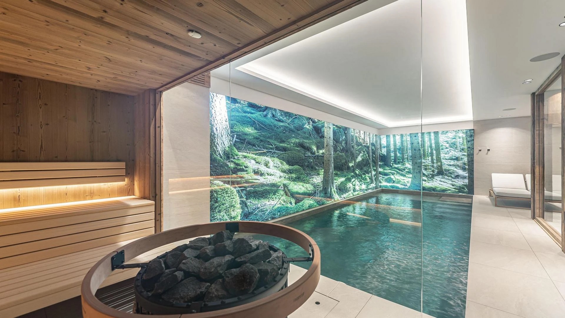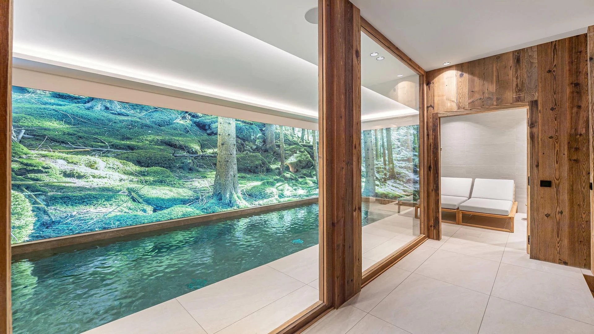 The true showstopper of the chalet sits on the lower level where you will find a private spa retreat built to help you unwind. A heated pool, sauna, and quiet rest area offer a peaceful getaway after a day on the pistes surrounding you with calm. One floor down, guests find the chalet’s movie room, a cozy space with comfortable couches and immersive surround sound perfect for watching films together.