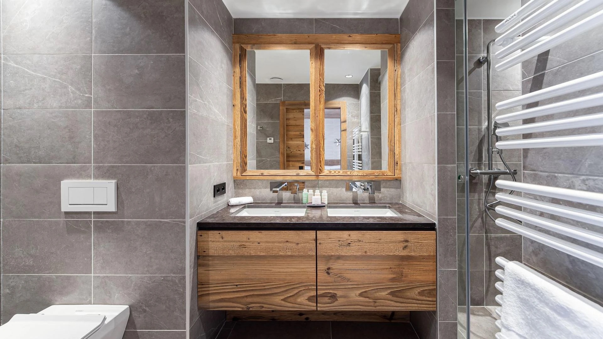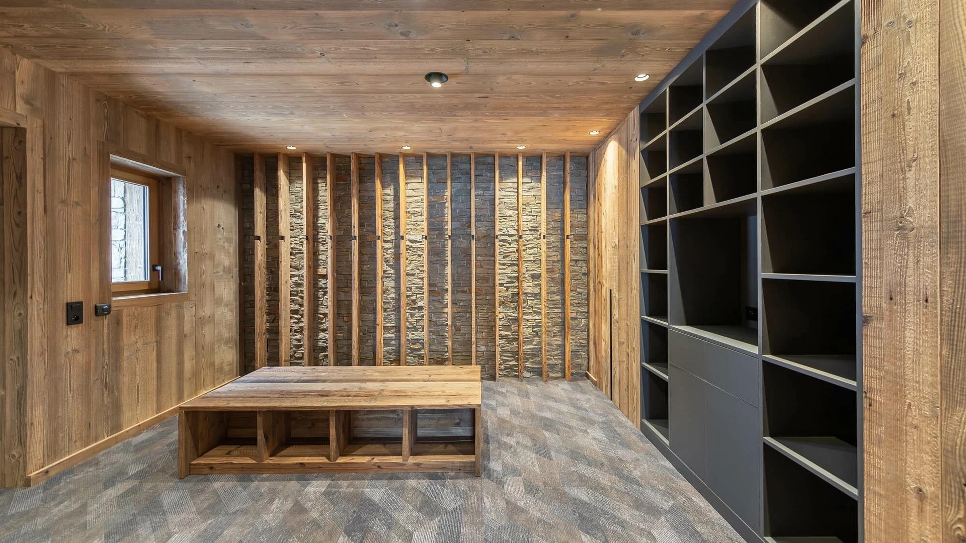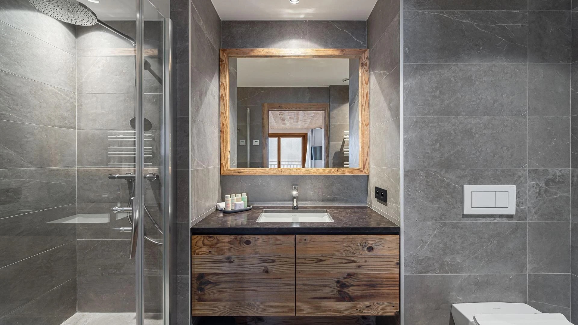 The ground floor houses two more bedrooms that keep the chalet’s elegant look, with en-suite bathrooms and a beautiful mix of local wood and grey slate. This combination creates a balance between modern design and alpine tradition.