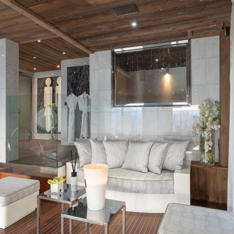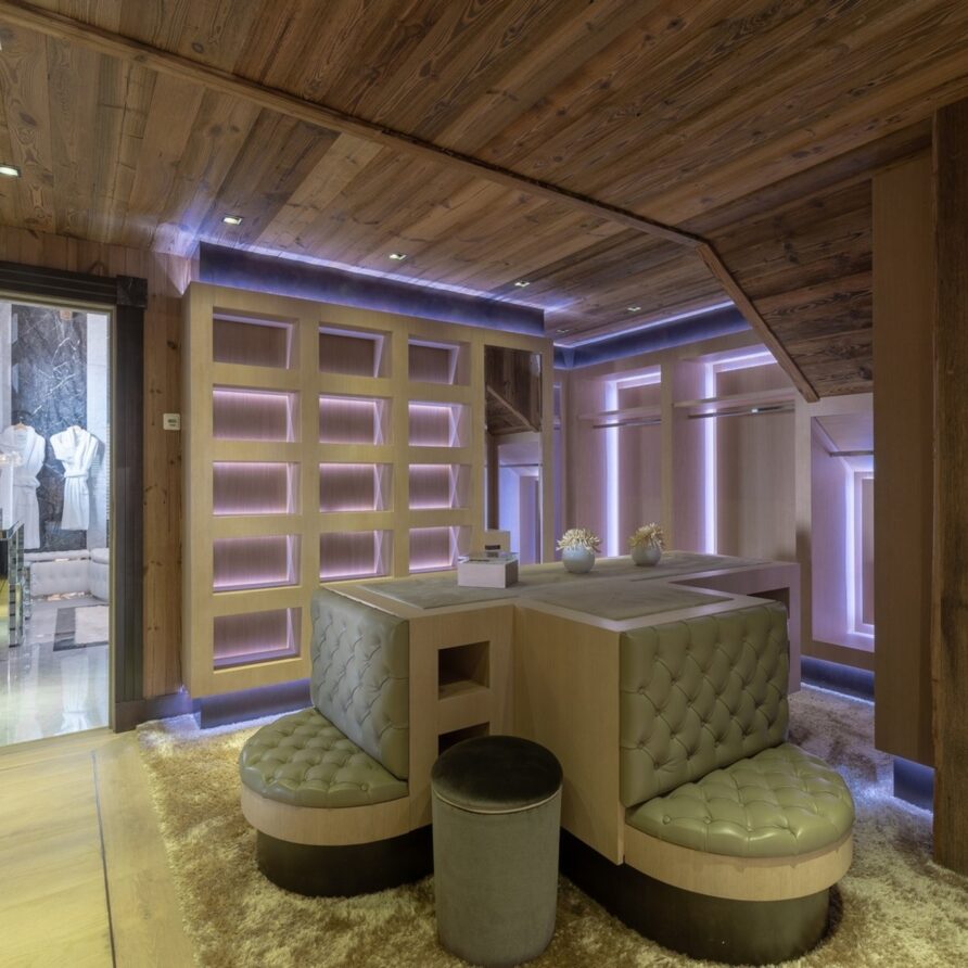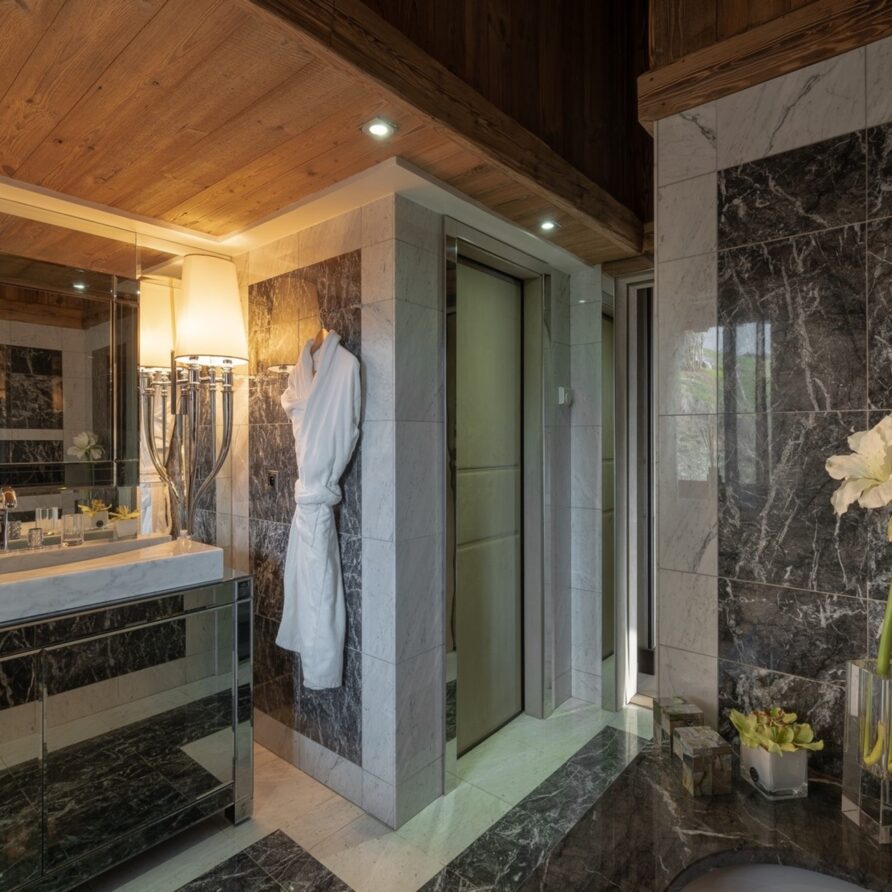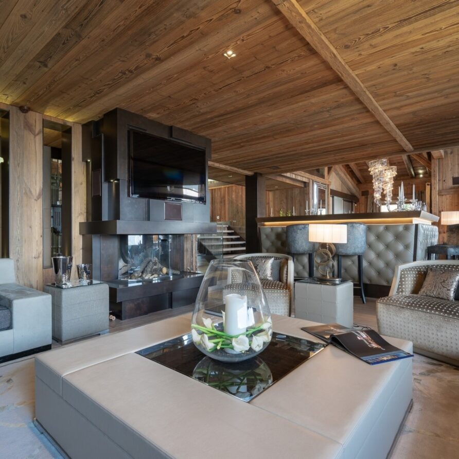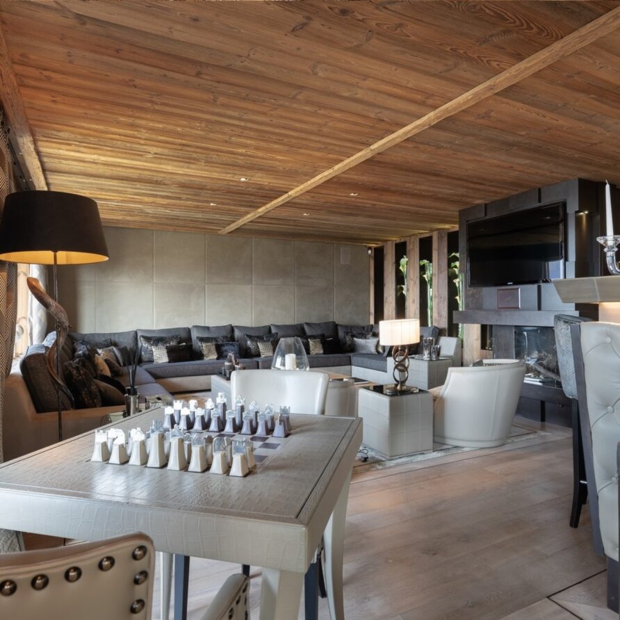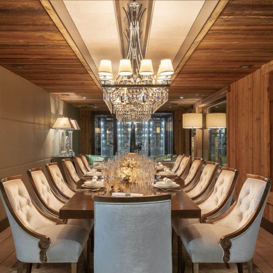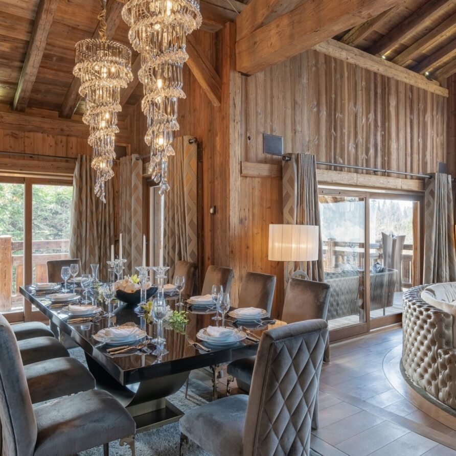 The interior of the chalet is very elegant with the dominant colors grey and cream, combined with lots of wood. A large fireplace is surrounded by a comfortable modern sofa set and armchairs and expansive window fronts flood the rooms with natural light. Several chic crystal chandeliers hang from the ceiling, all together creating a special atmosphere of sublime elegance. Guests have access to 2 dining rooms – one for 10 people and one for 18 – and a bar where they can enjoy champagne or cocktails before dinner.