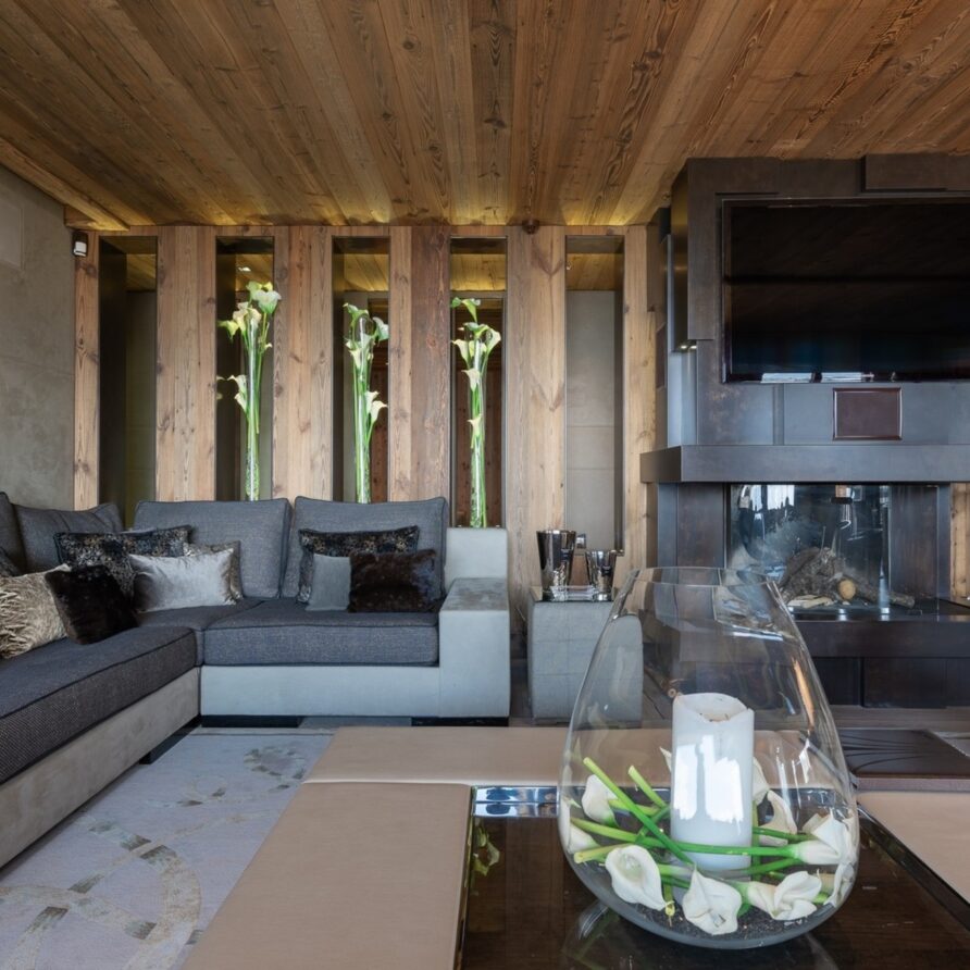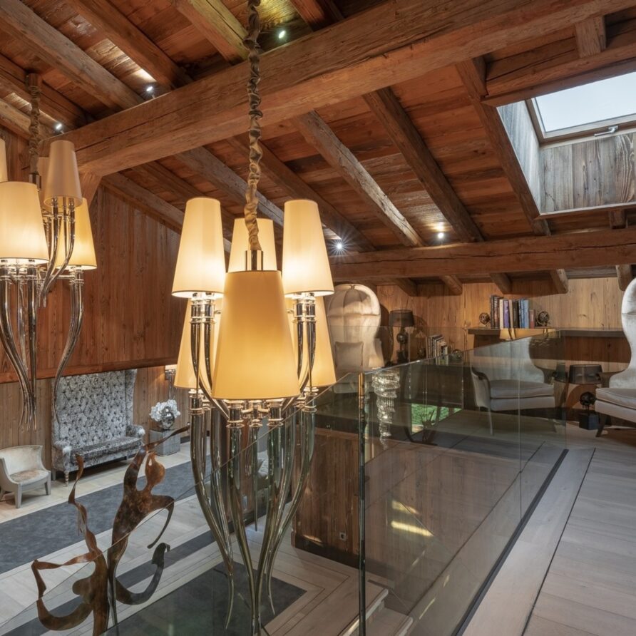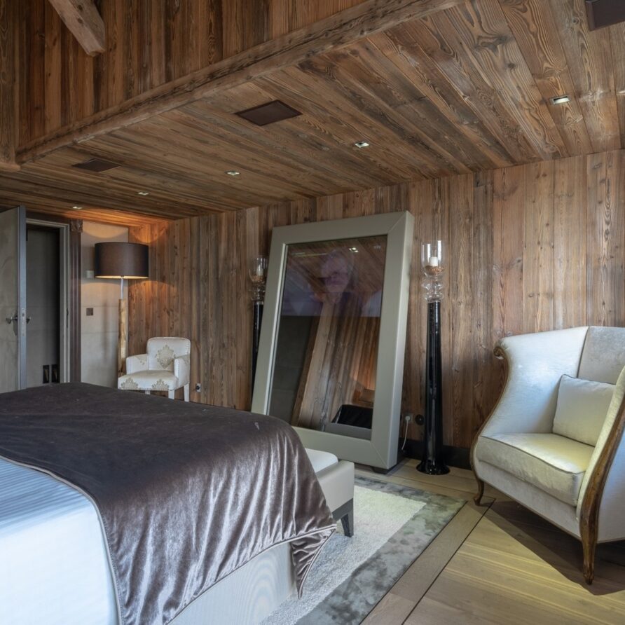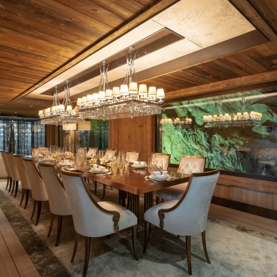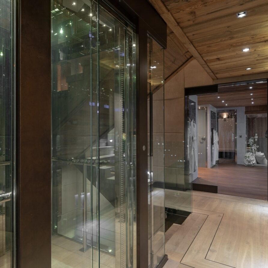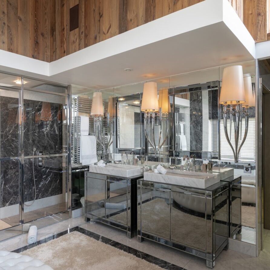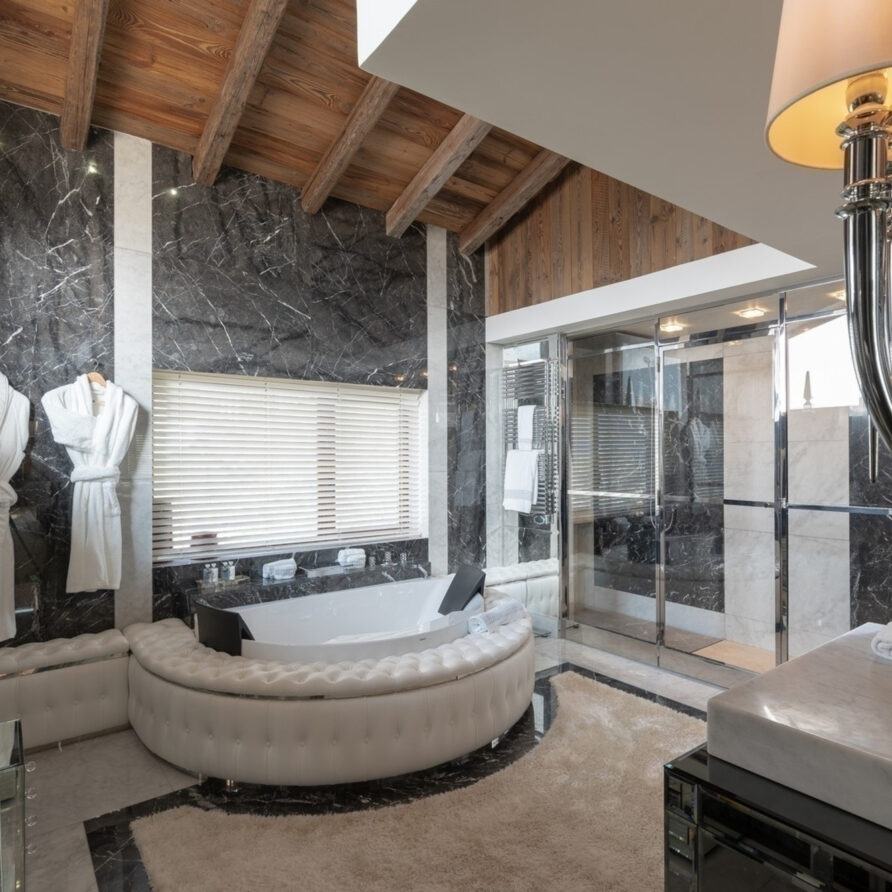 The interior of the chalet is very elegant with the dominant colors grey and cream, combined with lots of wood. A large fireplace is surrounded by a comfortable modern sofa set and armchairs and expansive window fronts flood the rooms with natural light. Several chic crystal chandeliers hang from the ceiling, all together creating a special atmosphere of sublime elegance. Guests have access to 2 dining rooms – one for 10 people and one for 18 – and a bar where they can enjoy champagne or cocktails before dinner.