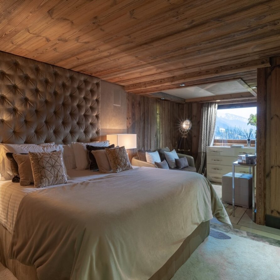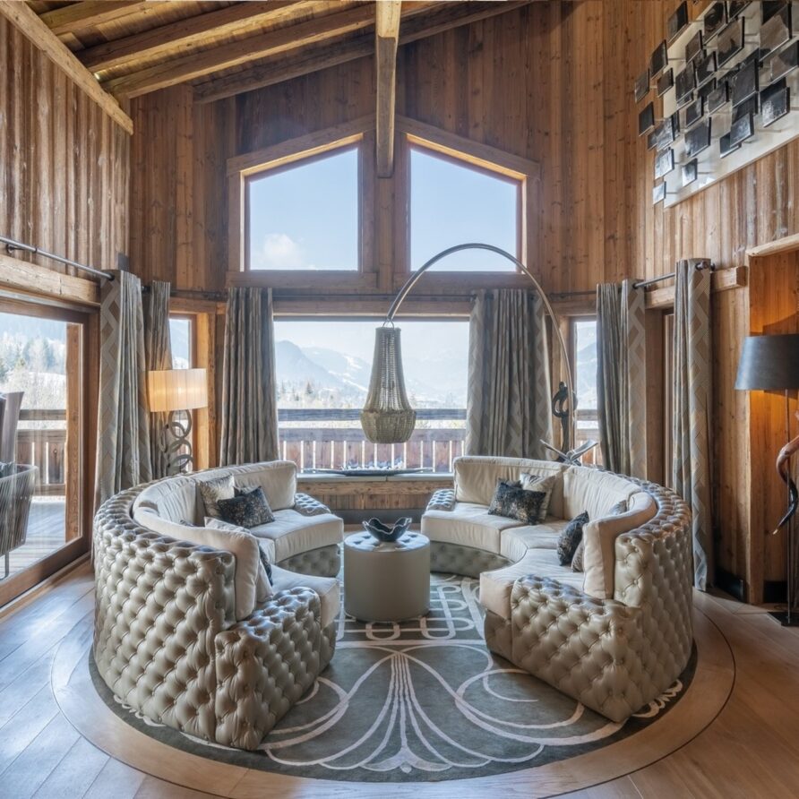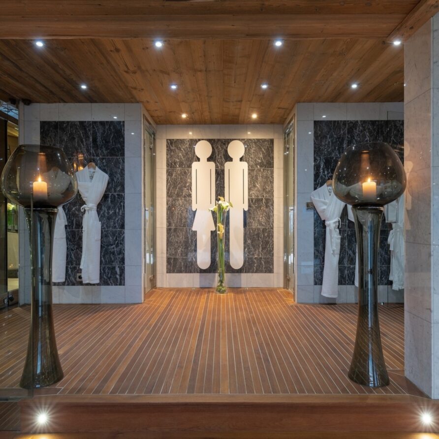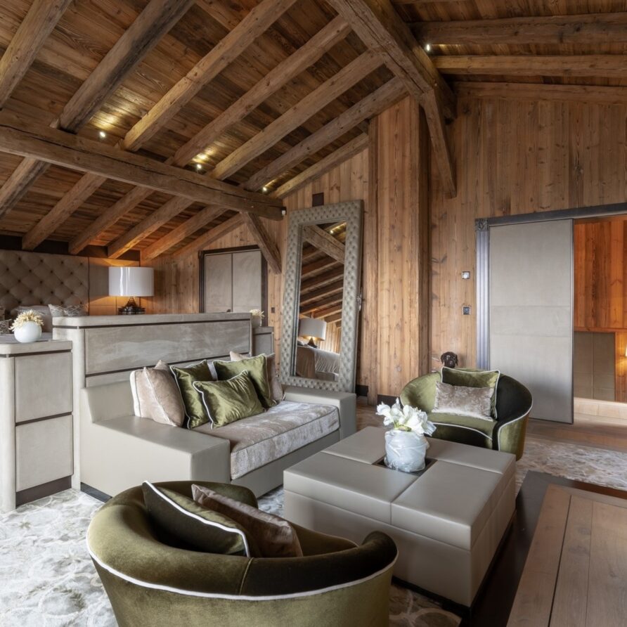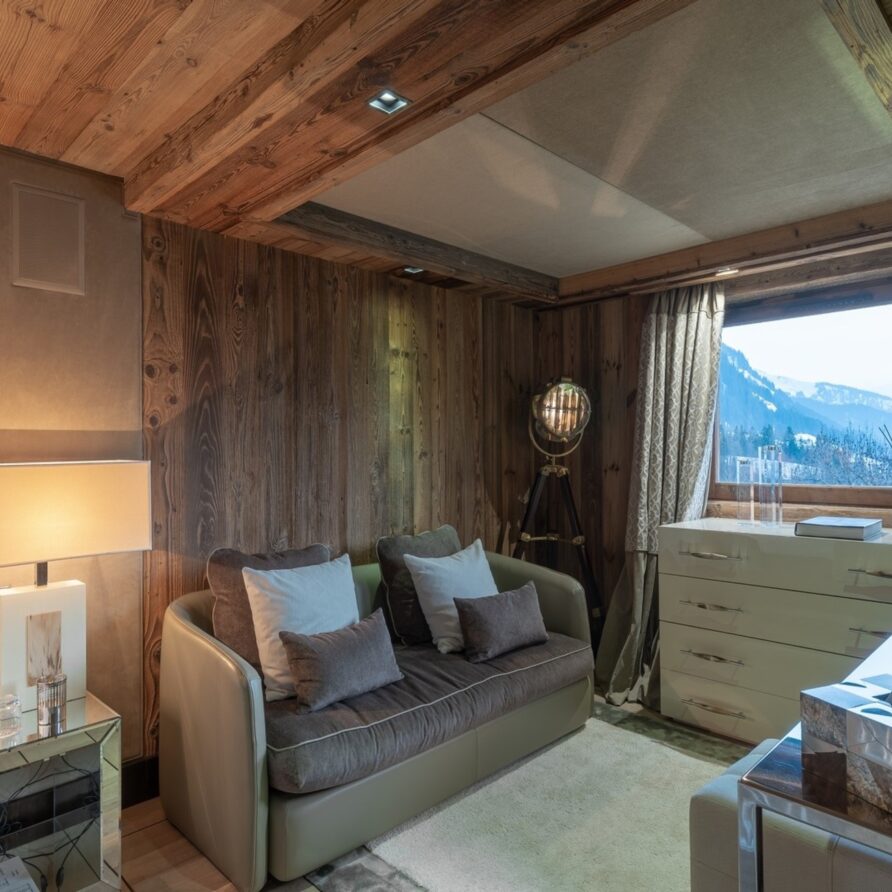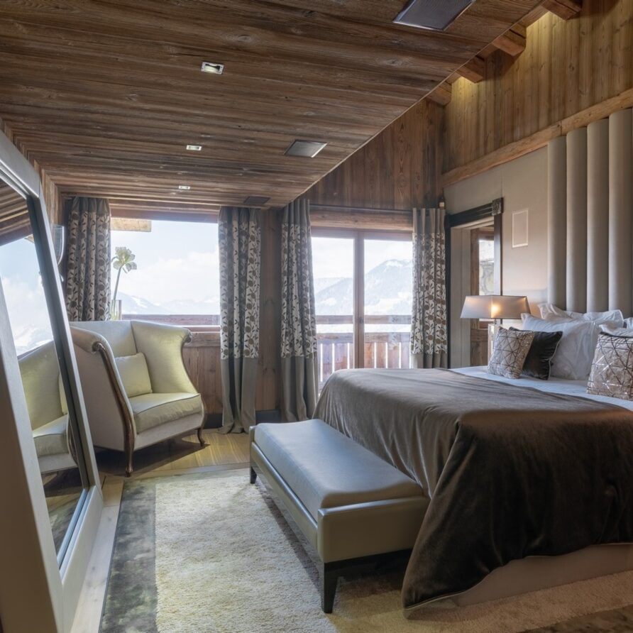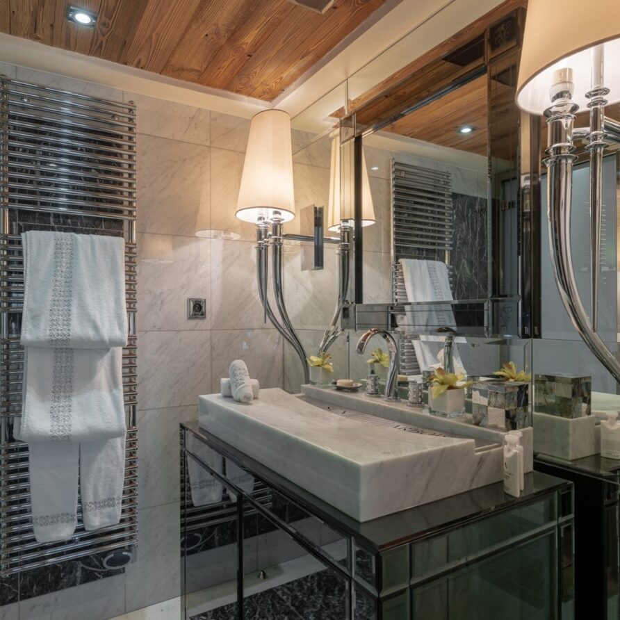 The interior of the chalet is very elegant with the dominant colors grey and cream, combined with lots of wood. A large fireplace is surrounded by a comfortable modern sofa set and armchairs and expansive window fronts flood the rooms with natural light. Several chic crystal chandeliers hang from the ceiling, all together creating a special atmosphere of sublime elegance. Guests have access to 2 dining rooms – one for 10 people and one for 18 – and a bar where they can enjoy champagne or cocktails before dinner.