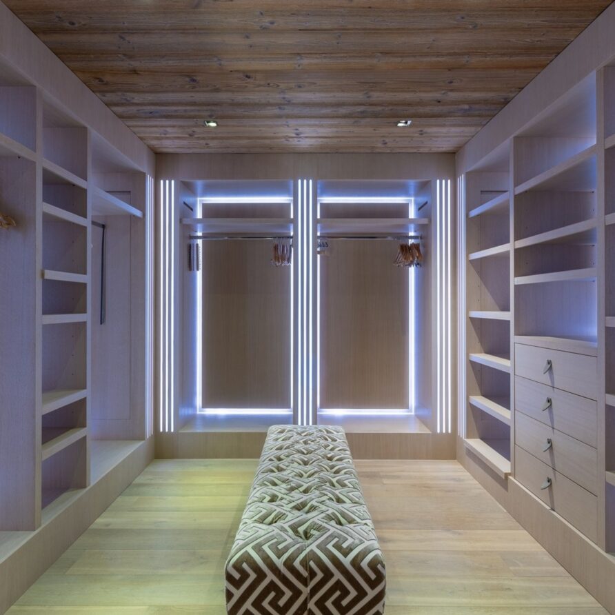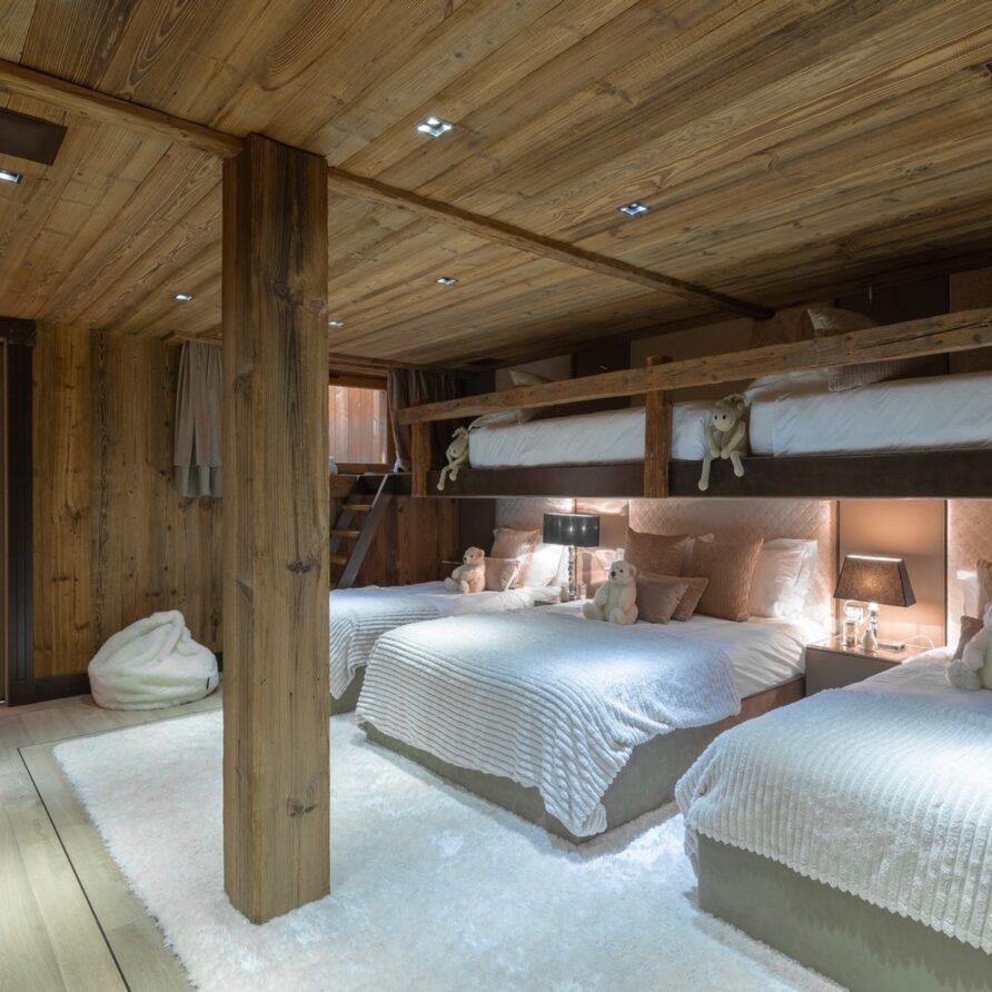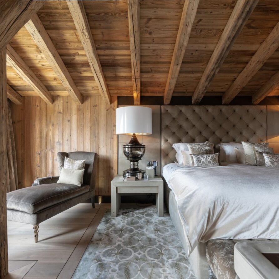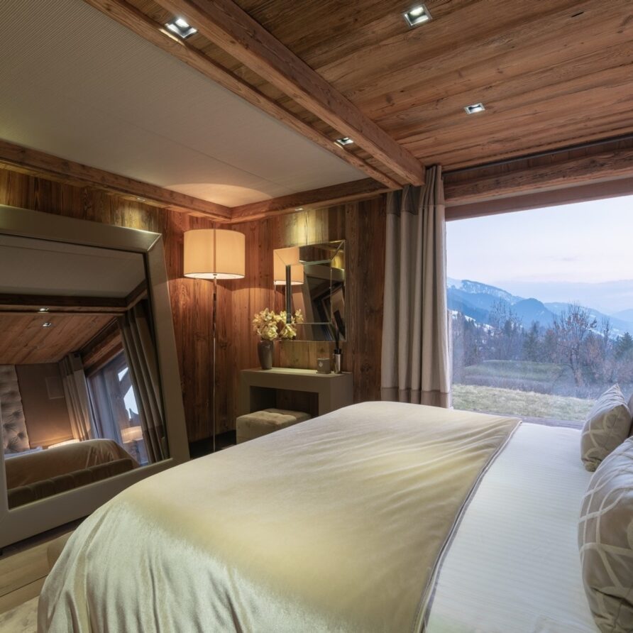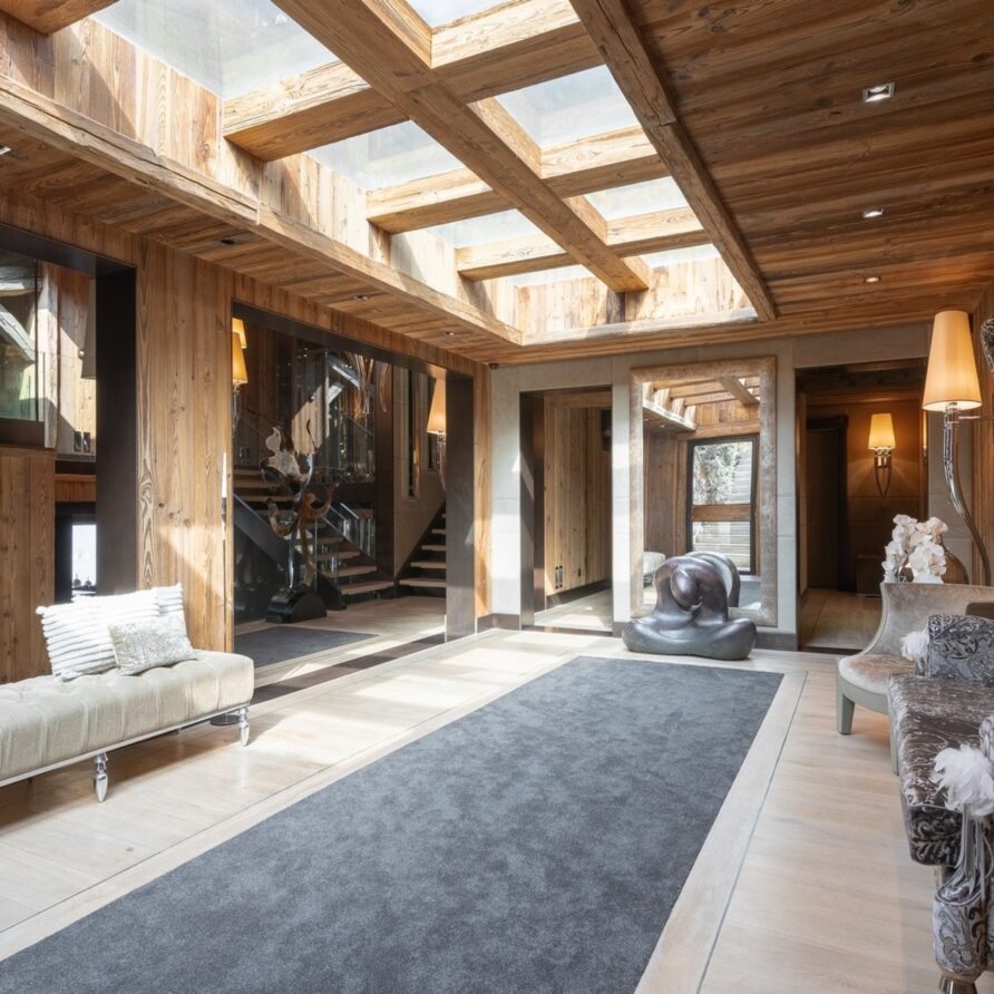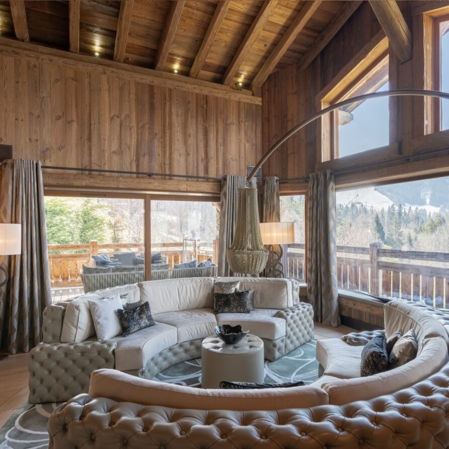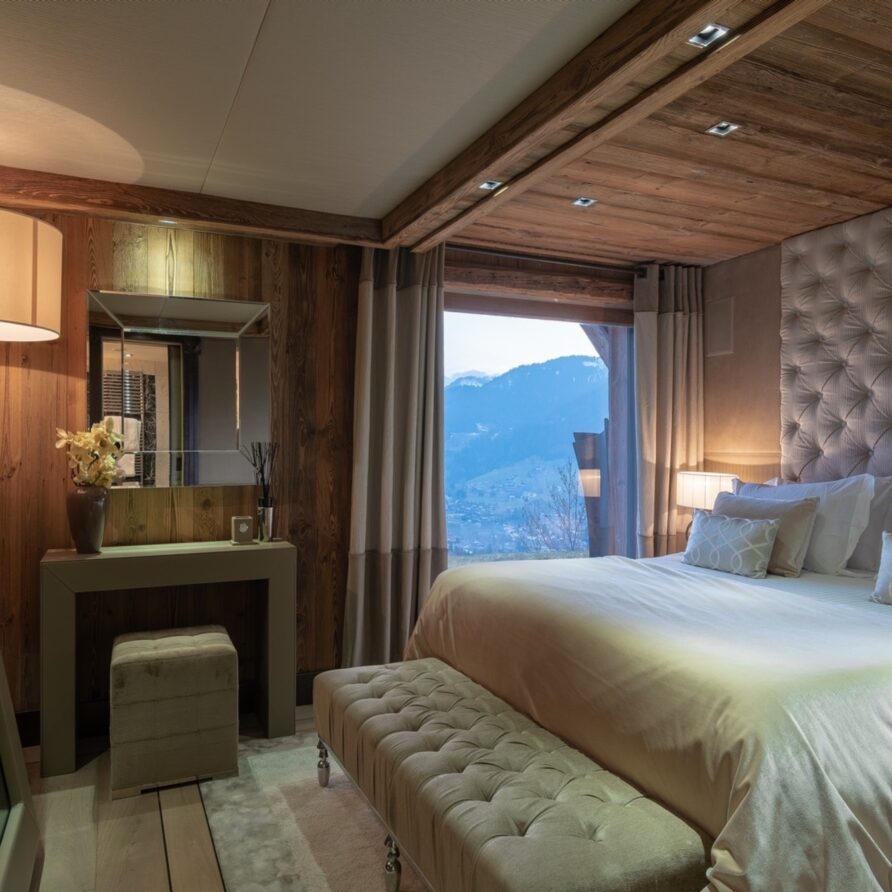 The interior of the chalet is very elegant with the dominant colors grey and cream, combined with lots of wood. A large fireplace is surrounded by a comfortable modern sofa set and armchairs and expansive window fronts flood the rooms with natural light. Several chic crystal chandeliers hang from the ceiling, all together creating a special atmosphere of sublime elegance. Guests have access to 2 dining rooms – one for 10 people and one for 18 – and a bar where they can enjoy champagne or cocktails before dinner.