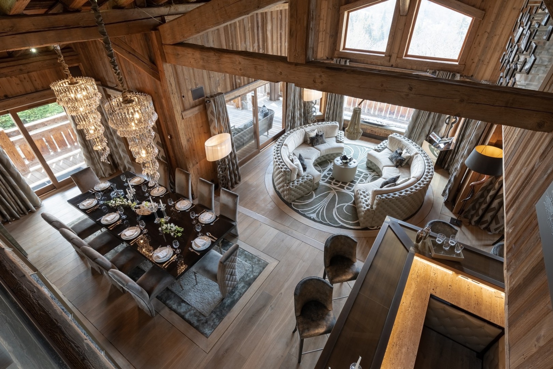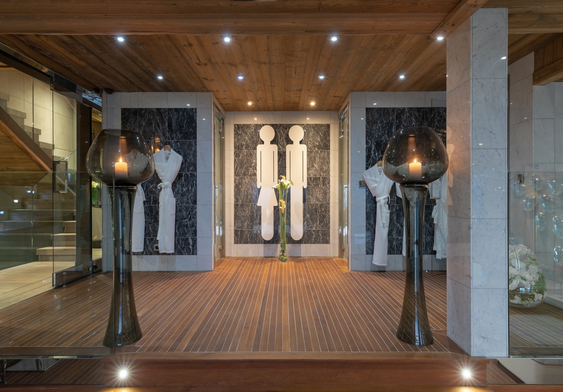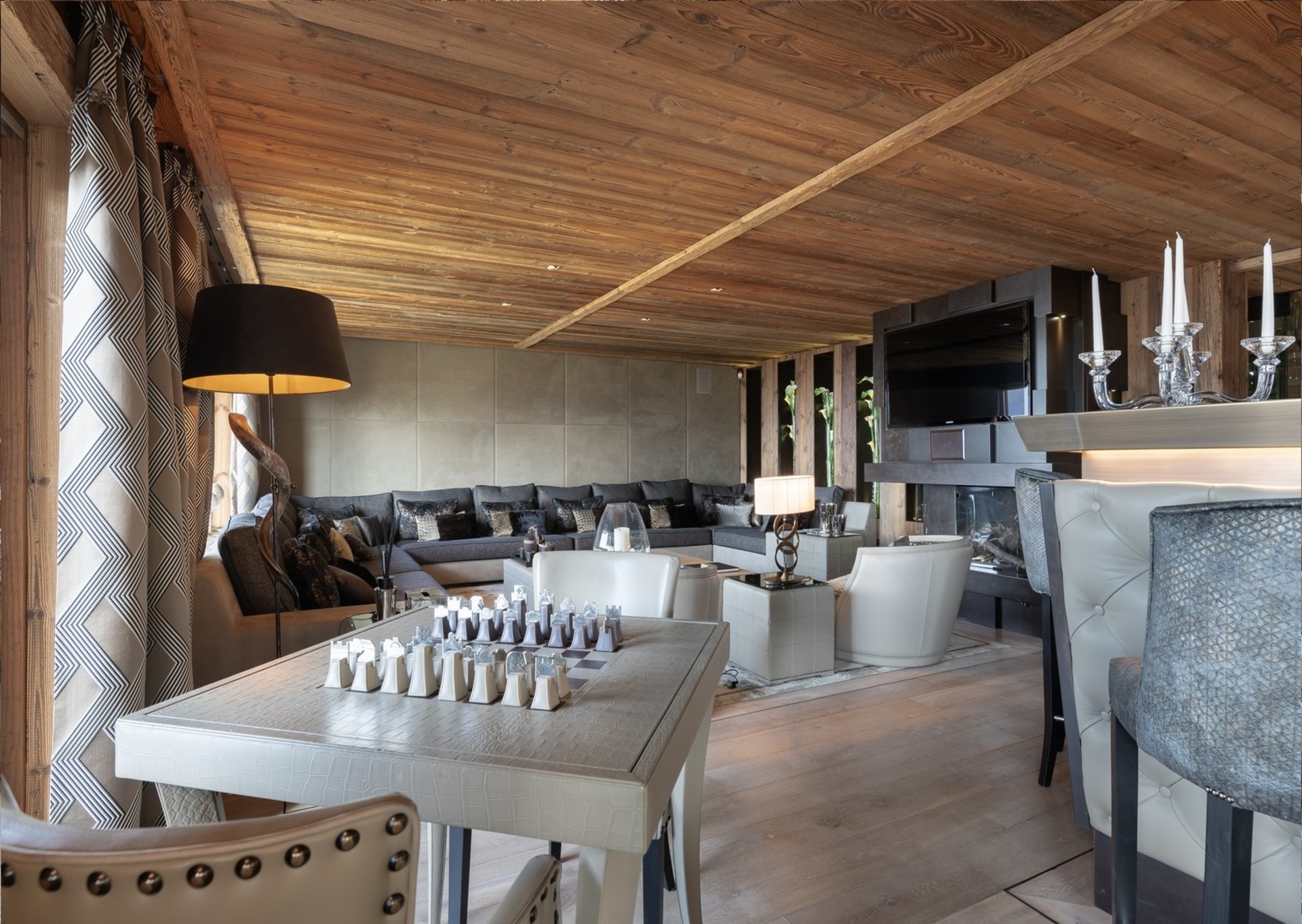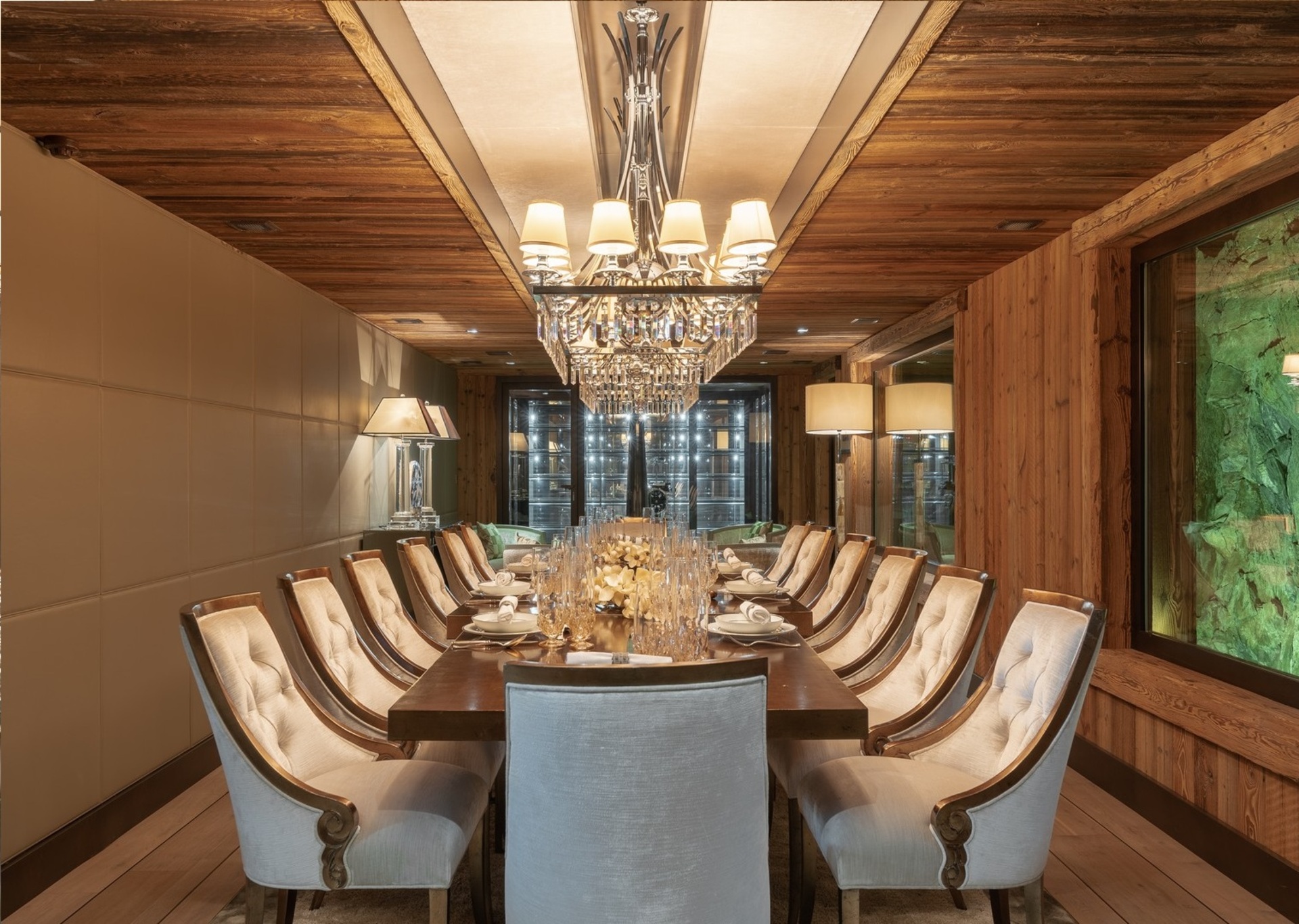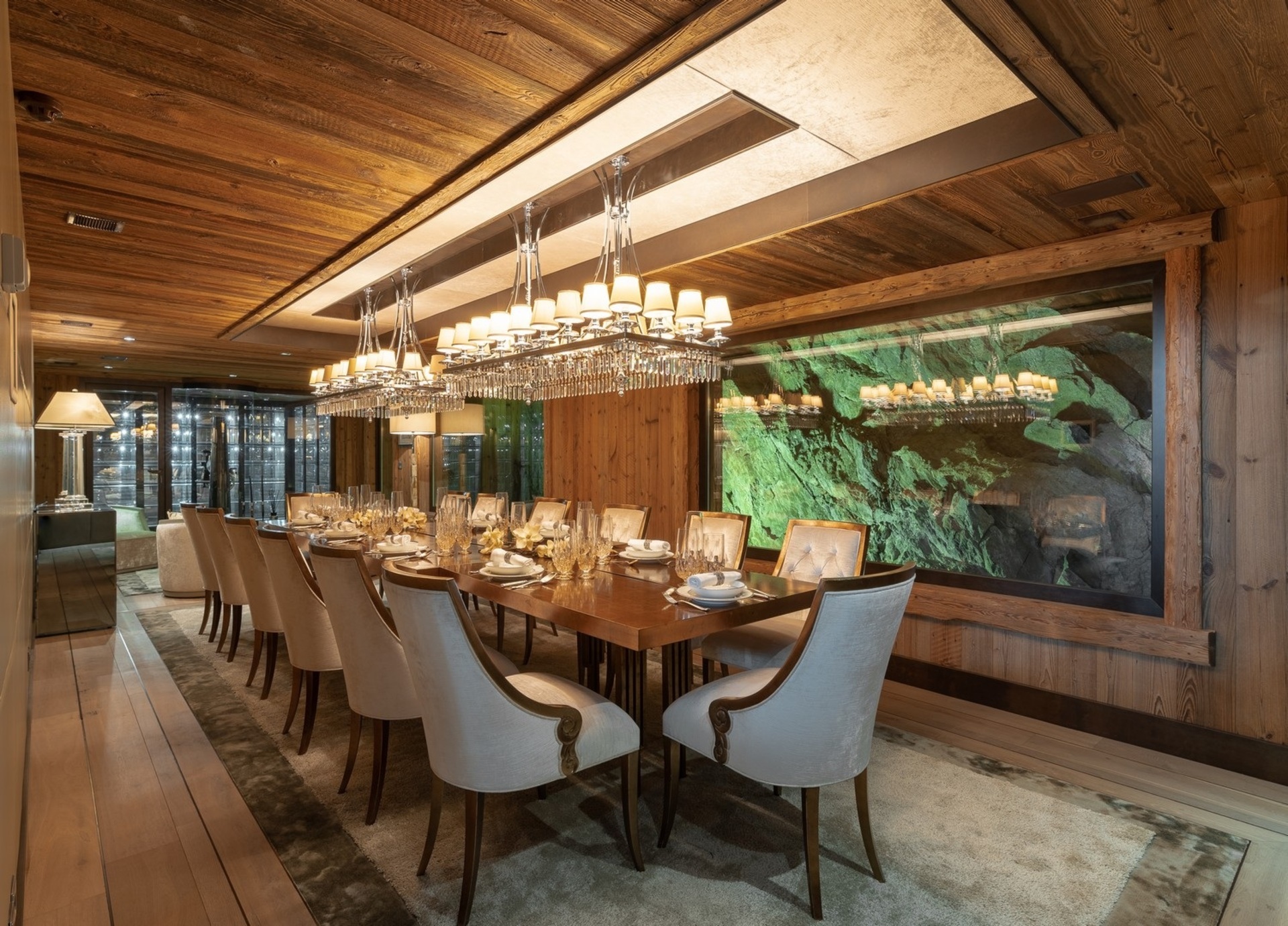 The interior of the chalet is very elegant with the dominant colors grey and cream, combined with lots of wood. A large fireplace is surrounded by a comfortable modern sofa set and armchairs and expansive window fronts flood the rooms with natural light. Several chic crystal chandeliers hang from the ceiling, all together creating a special atmosphere of sublime elegance. Guests have access to 2 dining rooms – one for 10 people and one for 18 – and a bar where they can enjoy champagne or cocktails before dinner.