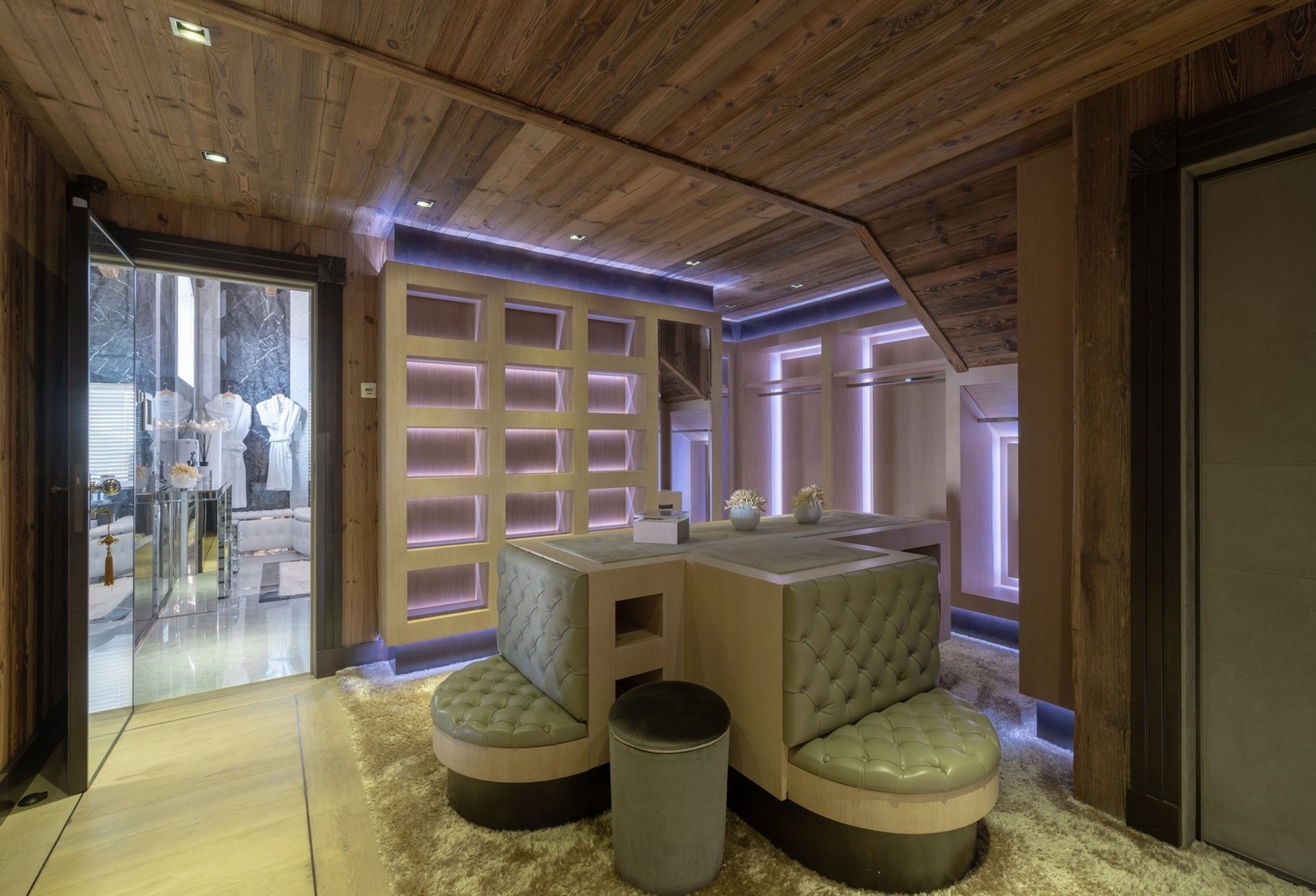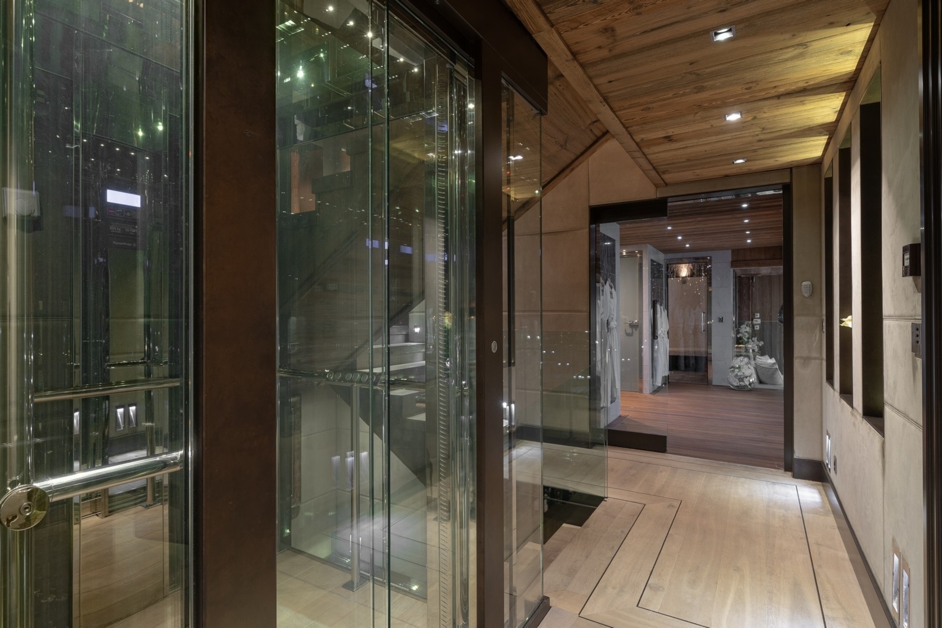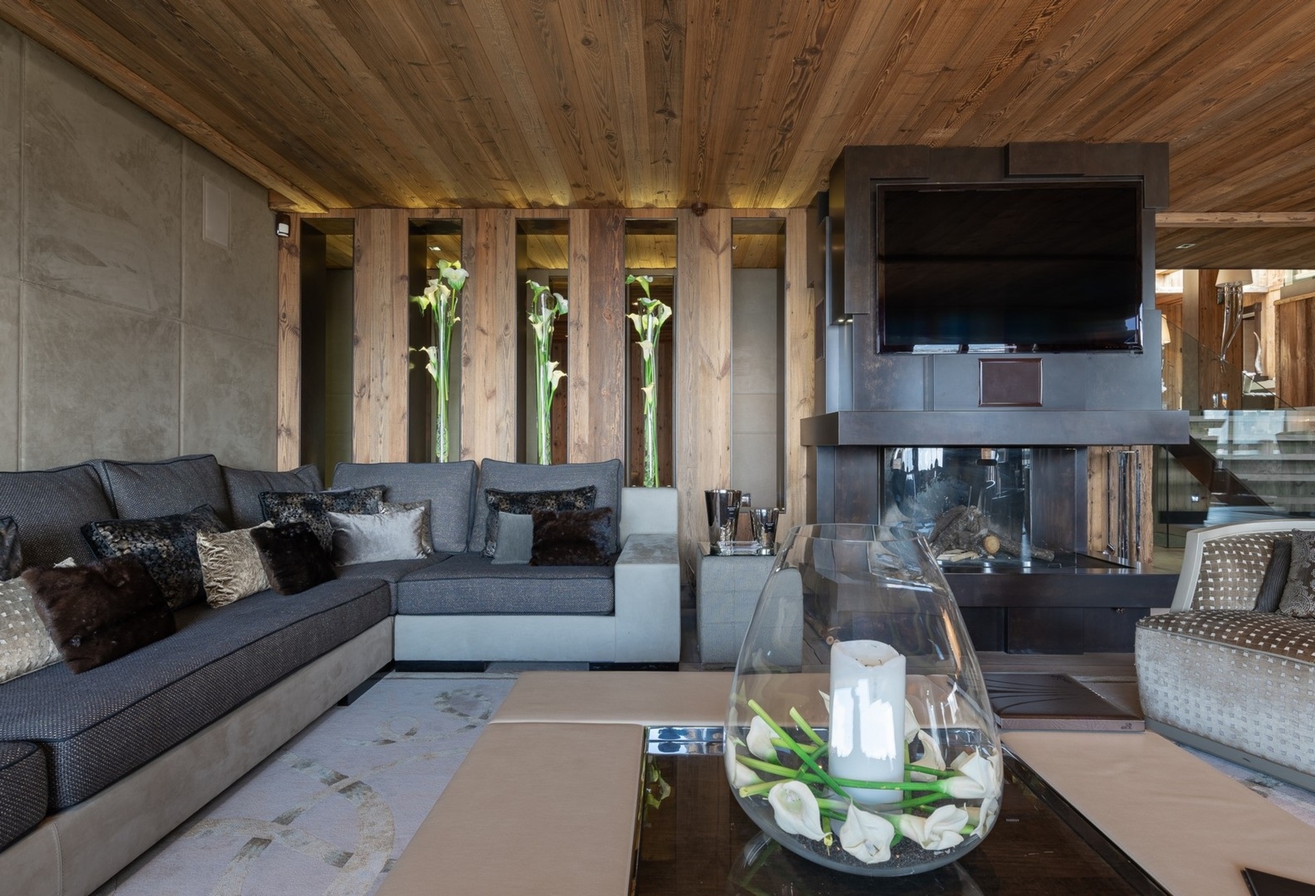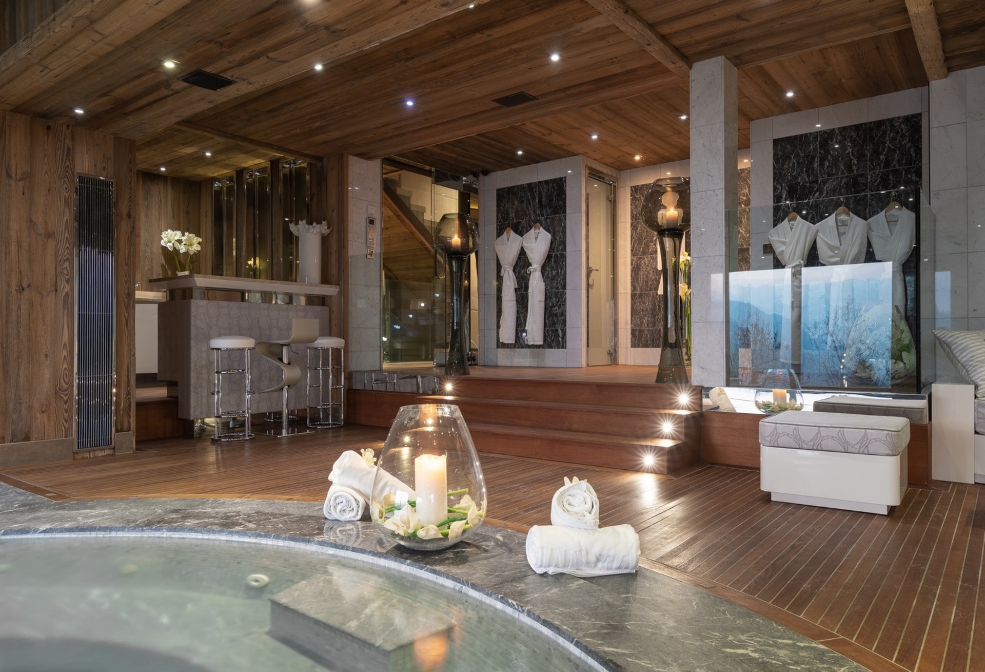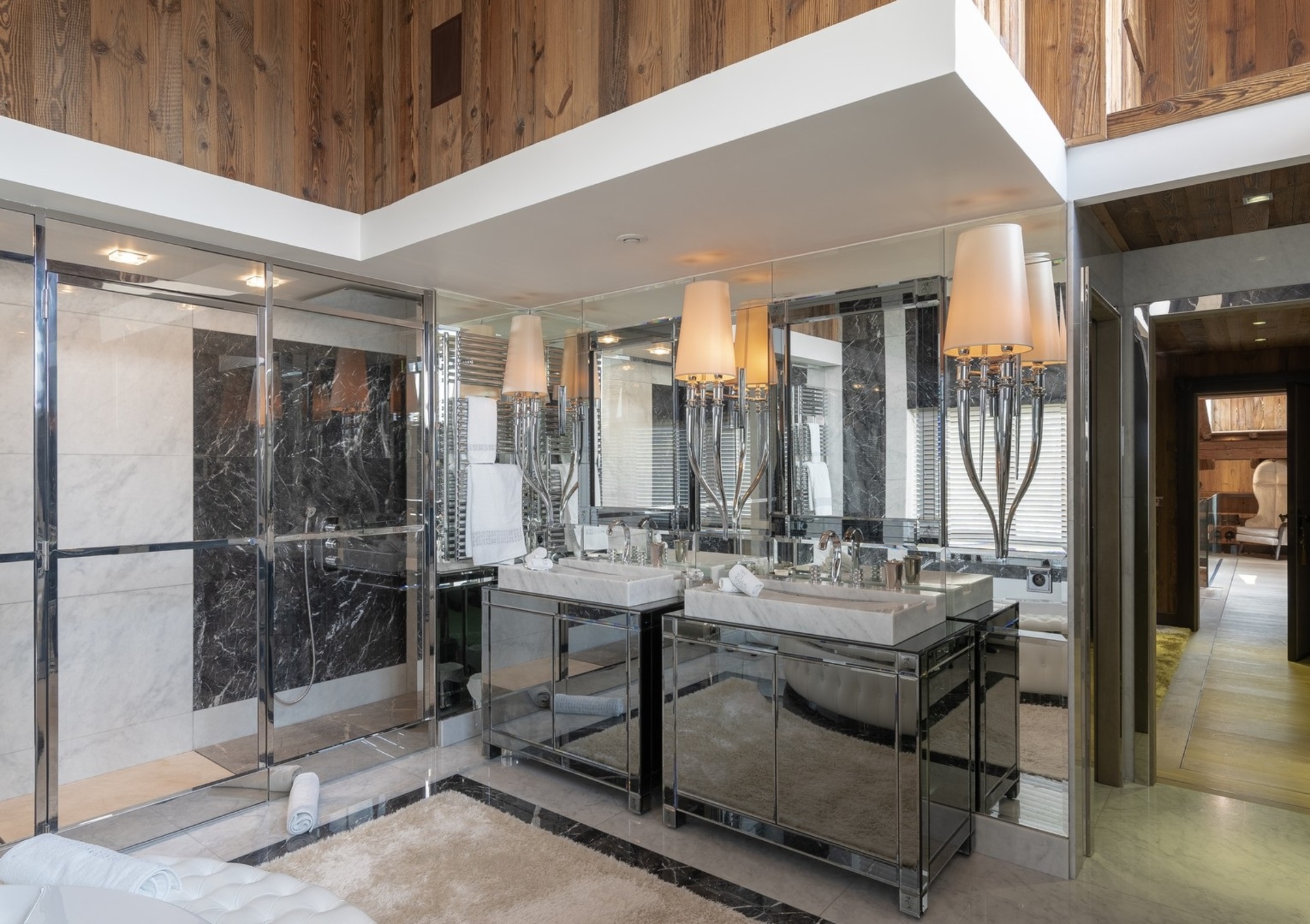 The interior of the chalet is very elegant with the dominant colors grey and cream, combined with lots of wood. A large fireplace is surrounded by a comfortable modern sofa set and armchairs and expansive window fronts flood the rooms with natural light. Several chic crystal chandeliers hang from the ceiling, all together creating a special atmosphere of sublime elegance. Guests have access to 2 dining rooms – one for 10 people and one for 18 – and a bar where they can enjoy champagne or cocktails before dinner.