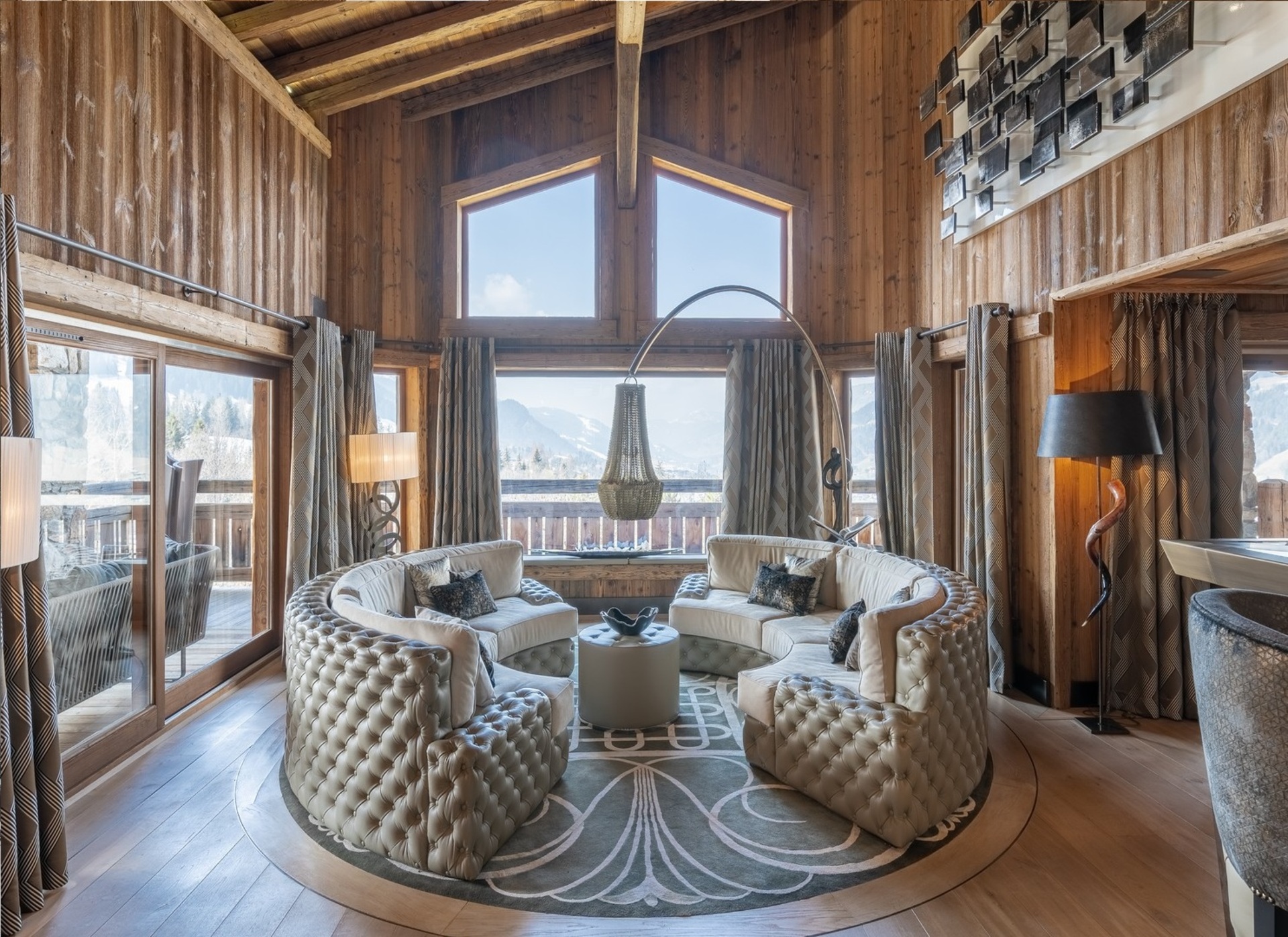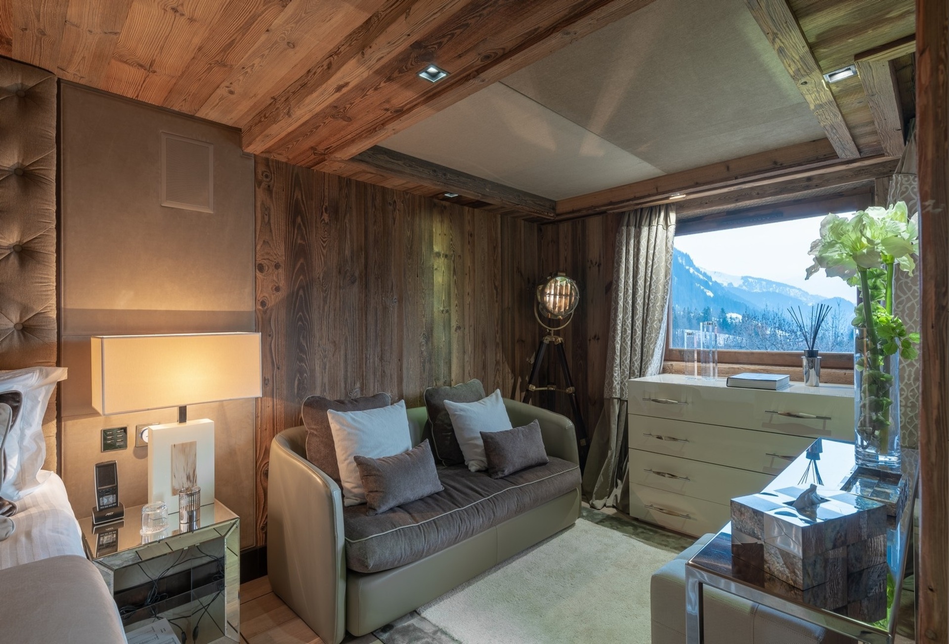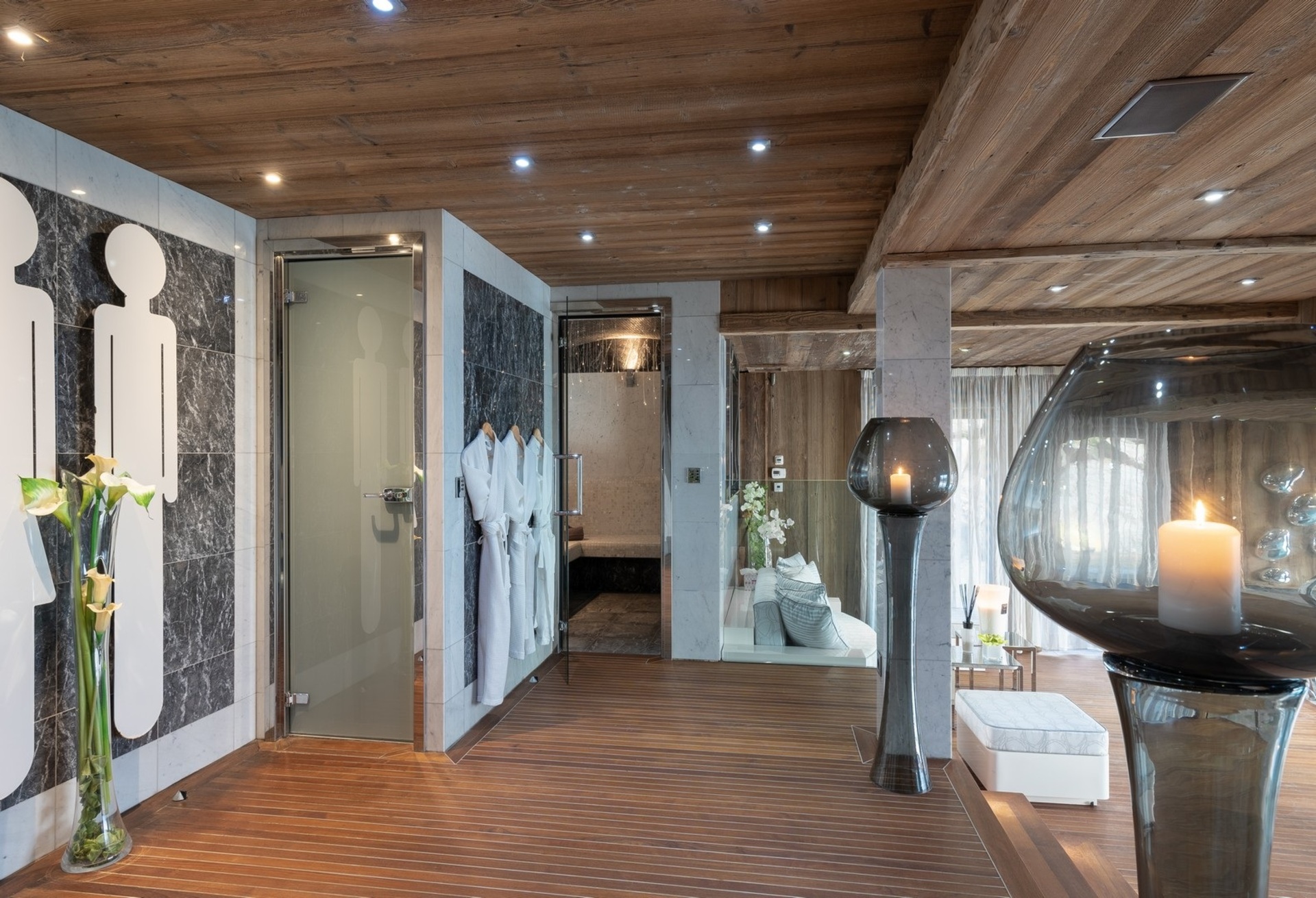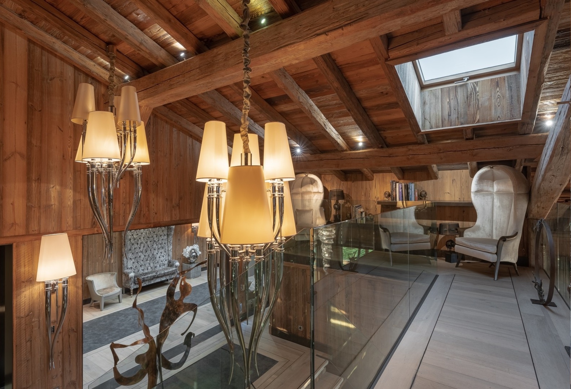 The interior of the chalet is very elegant with the dominant colors grey and cream, combined with lots of wood. A large fireplace is surrounded by a comfortable modern sofa set and armchairs and expansive window fronts flood the rooms with natural light. Several chic crystal chandeliers hang from the ceiling, all together creating a special atmosphere of sublime elegance. Guests have access to 2 dining rooms – one for 10 people and one for 18 – and a bar where they can enjoy champagne or cocktails before dinner.