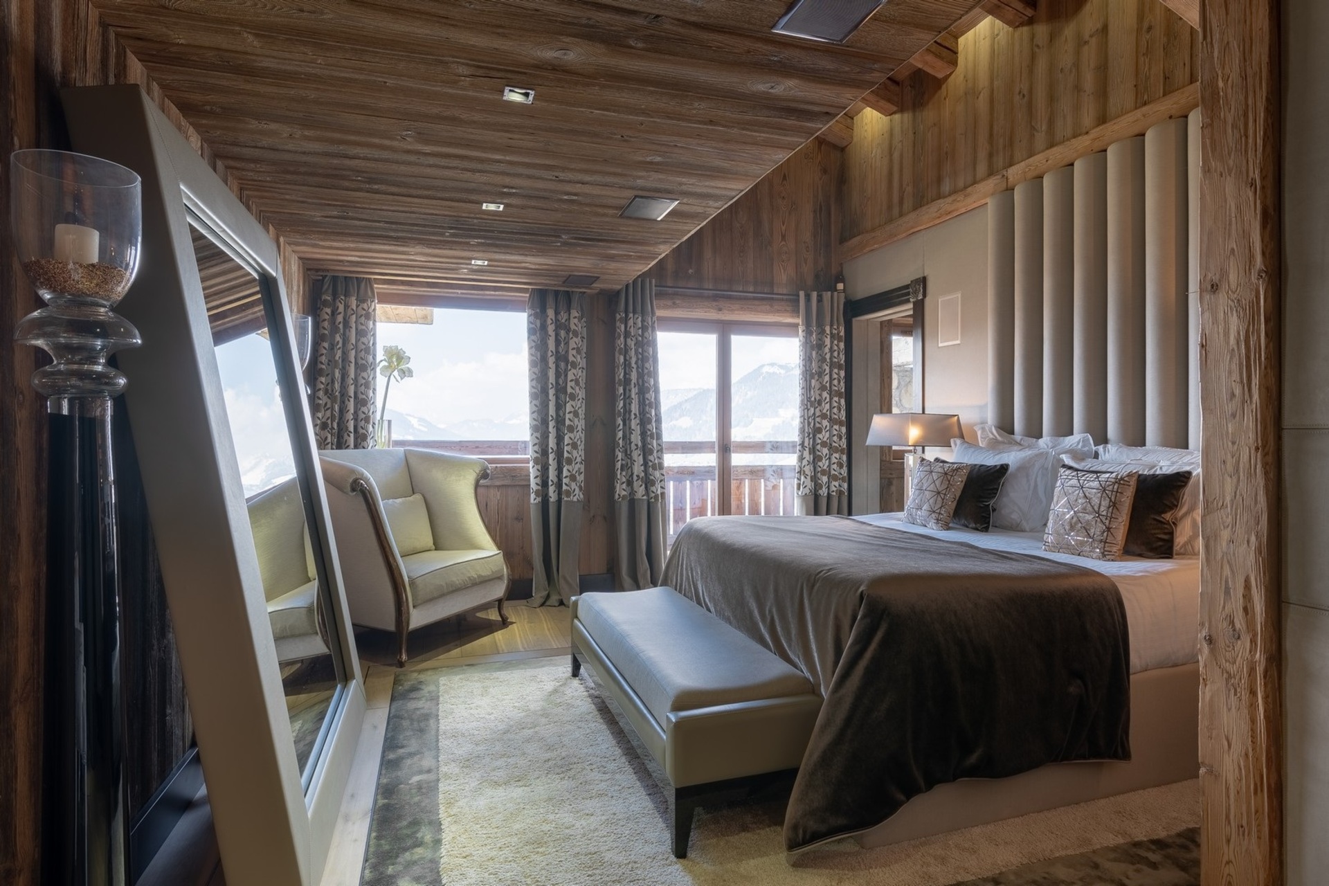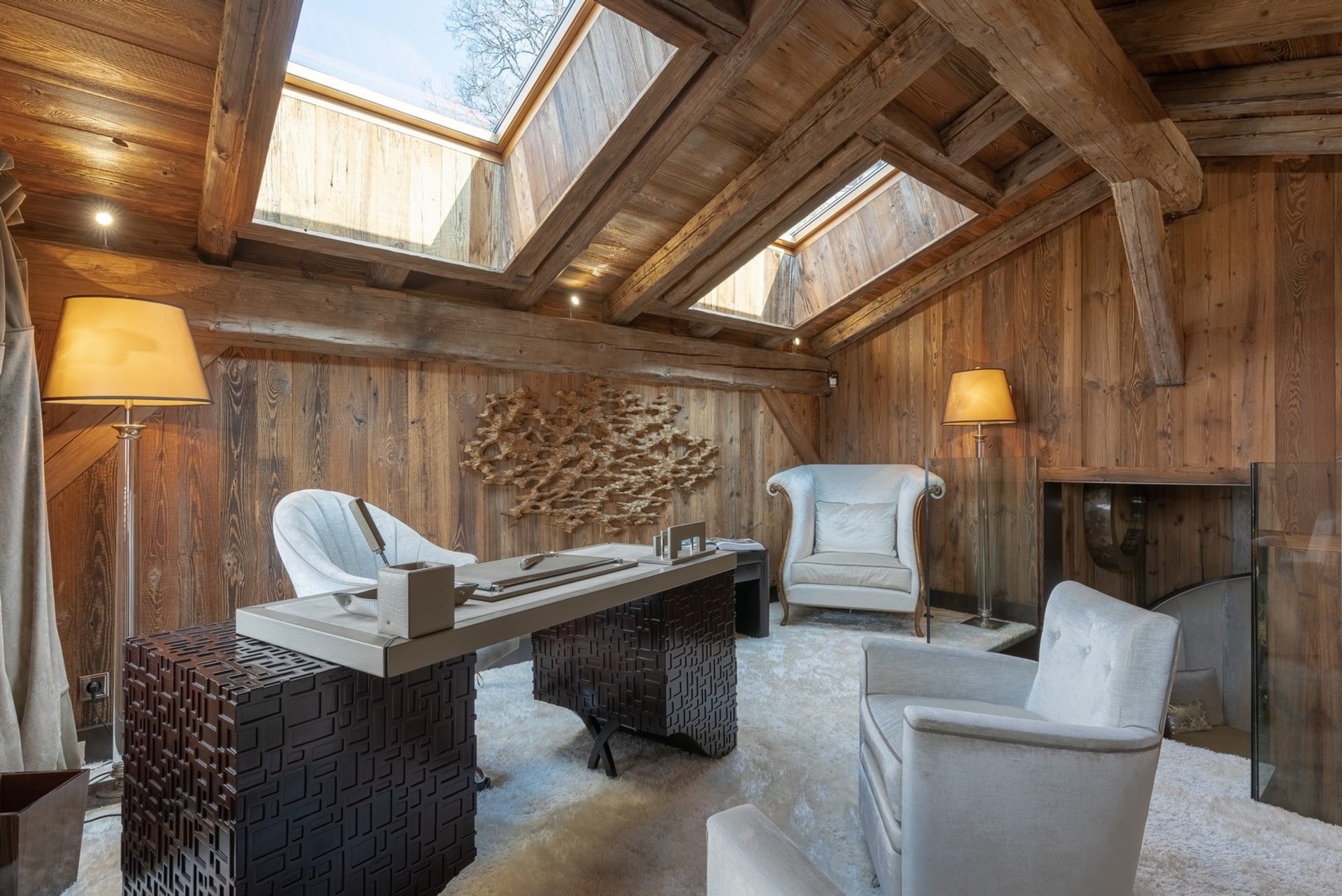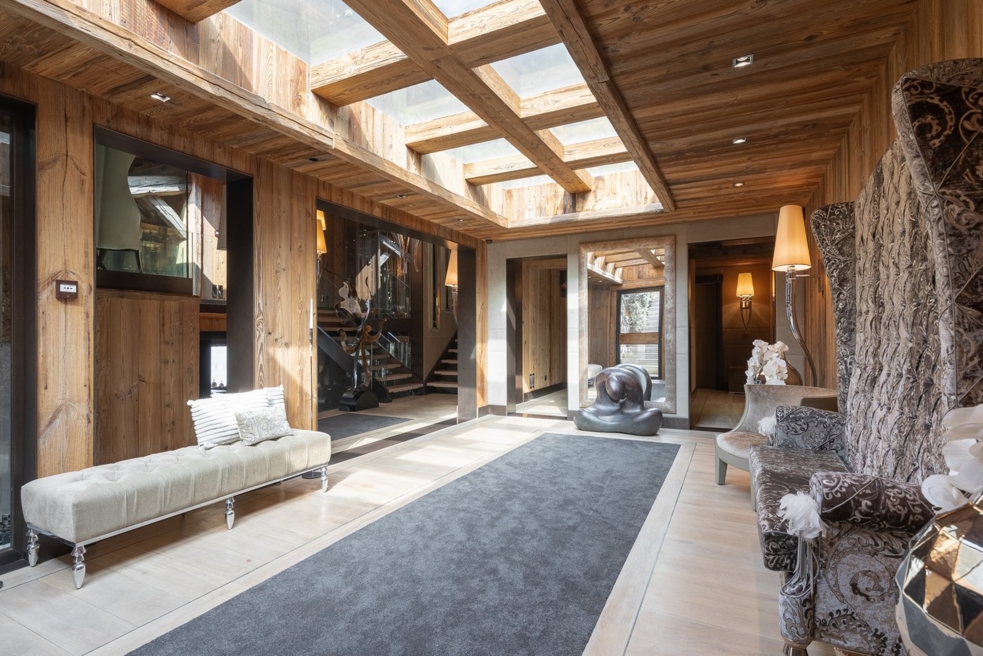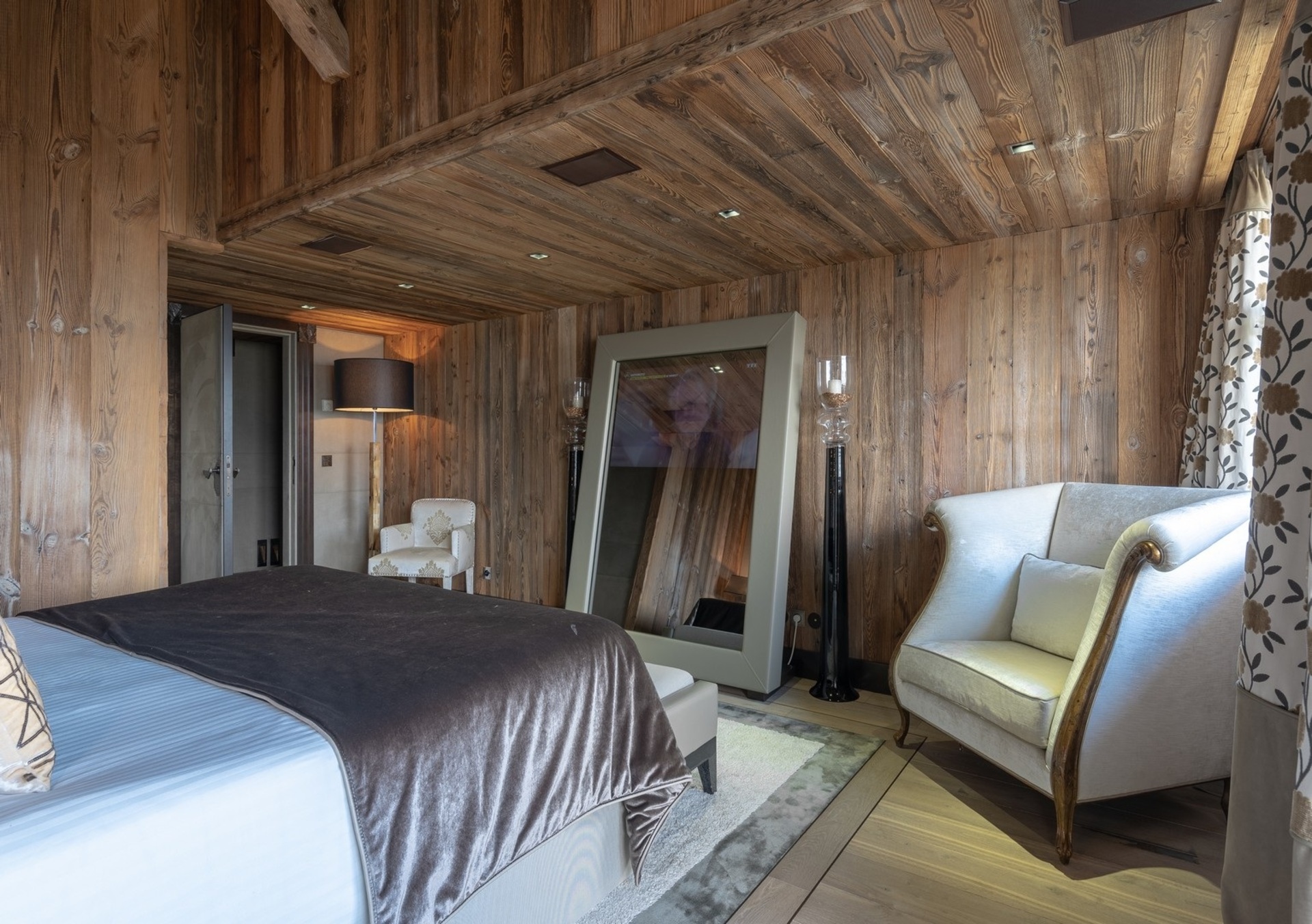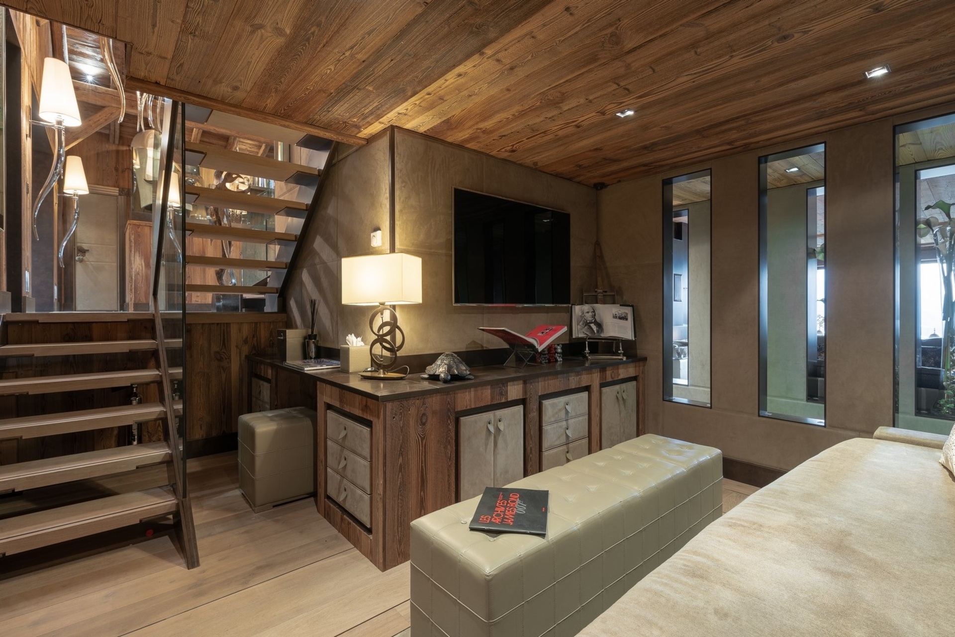 The interior of the chalet is very elegant with the dominant colors grey and cream, combined with lots of wood. A large fireplace is surrounded by a comfortable modern sofa set and armchairs and expansive window fronts flood the rooms with natural light. Several chic crystal chandeliers hang from the ceiling, all together creating a special atmosphere of sublime elegance. Guests have access to 2 dining rooms – one for 10 people and one for 18 – and a bar where they can enjoy champagne or cocktails before dinner.