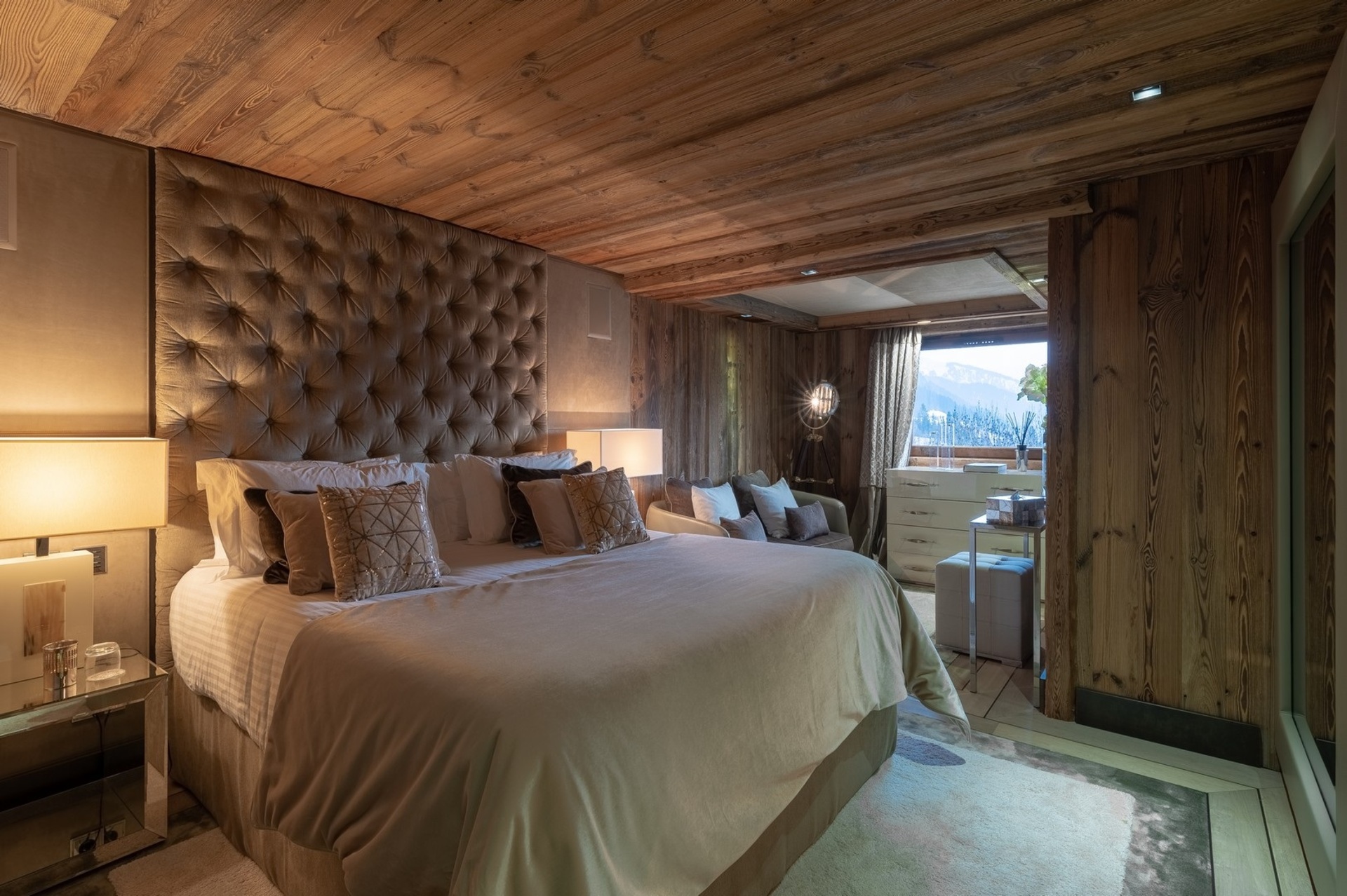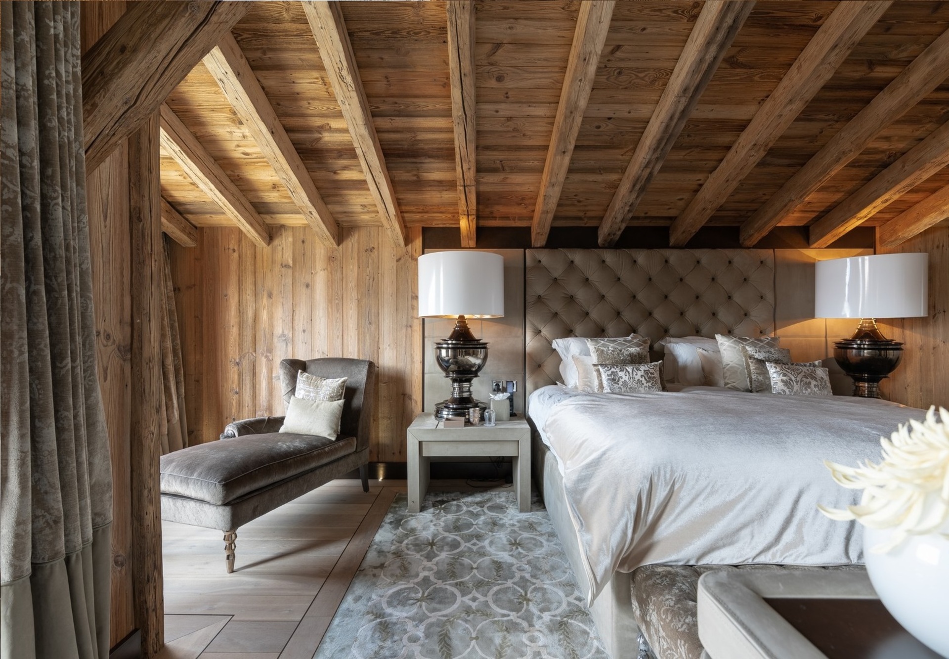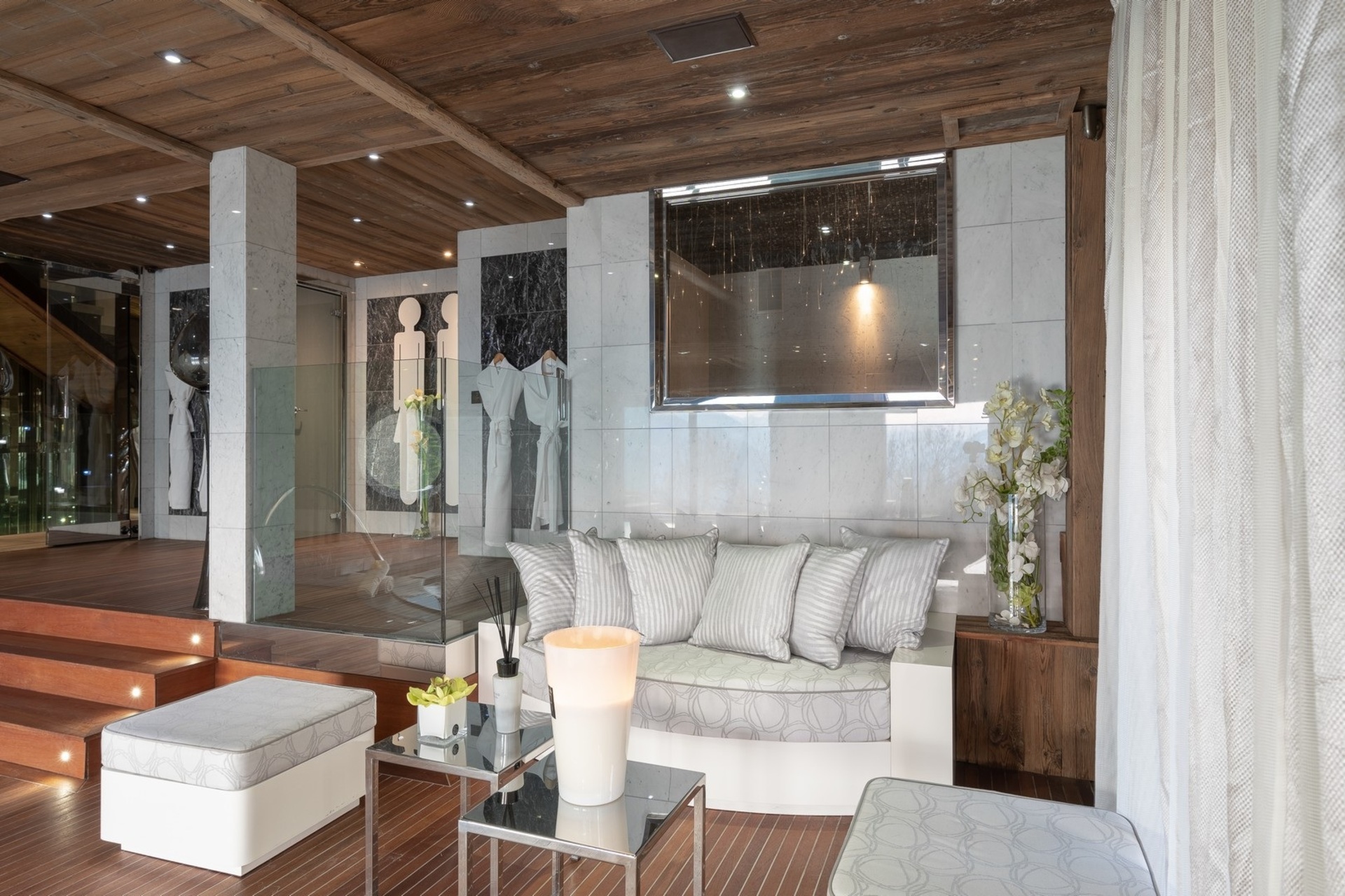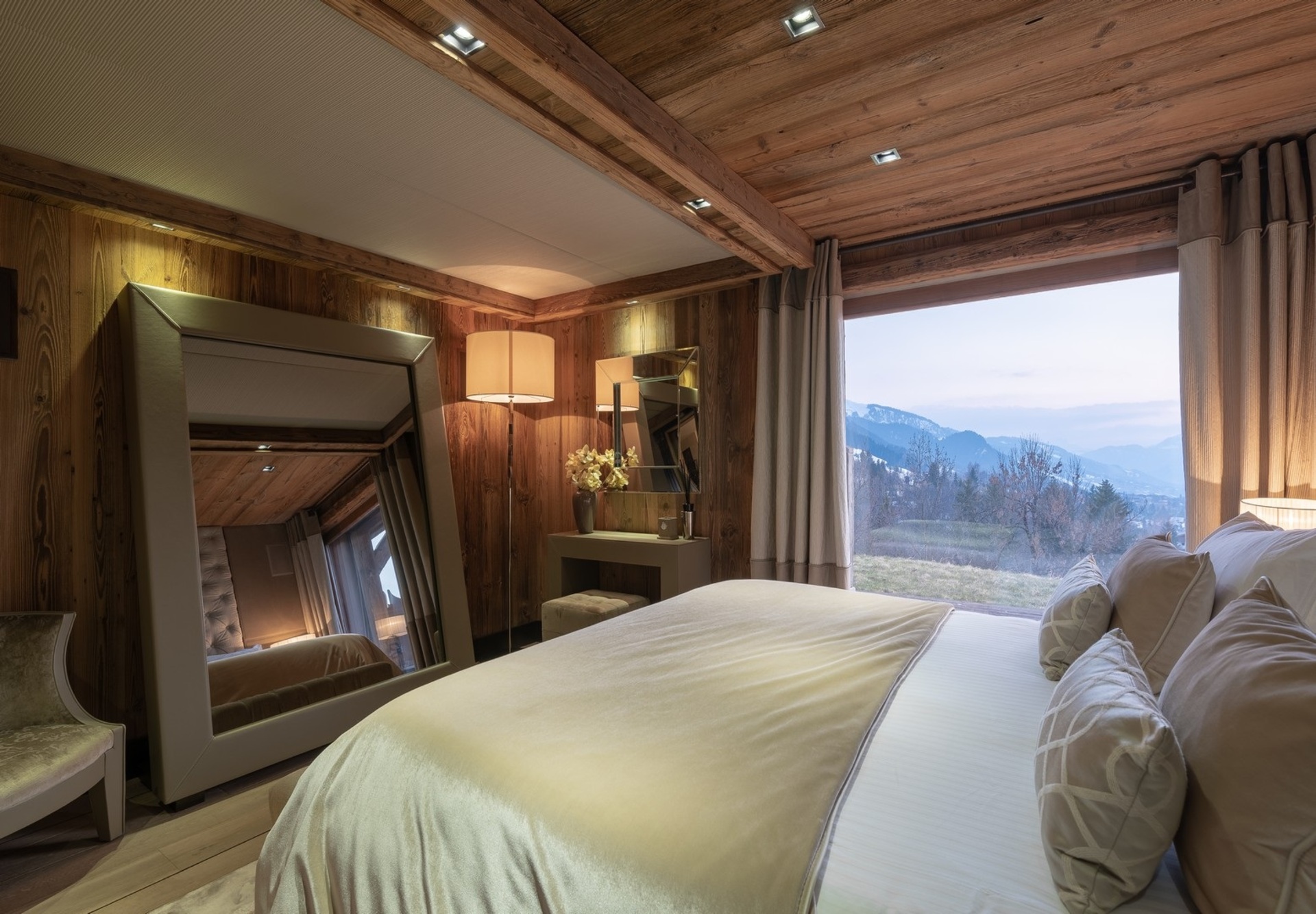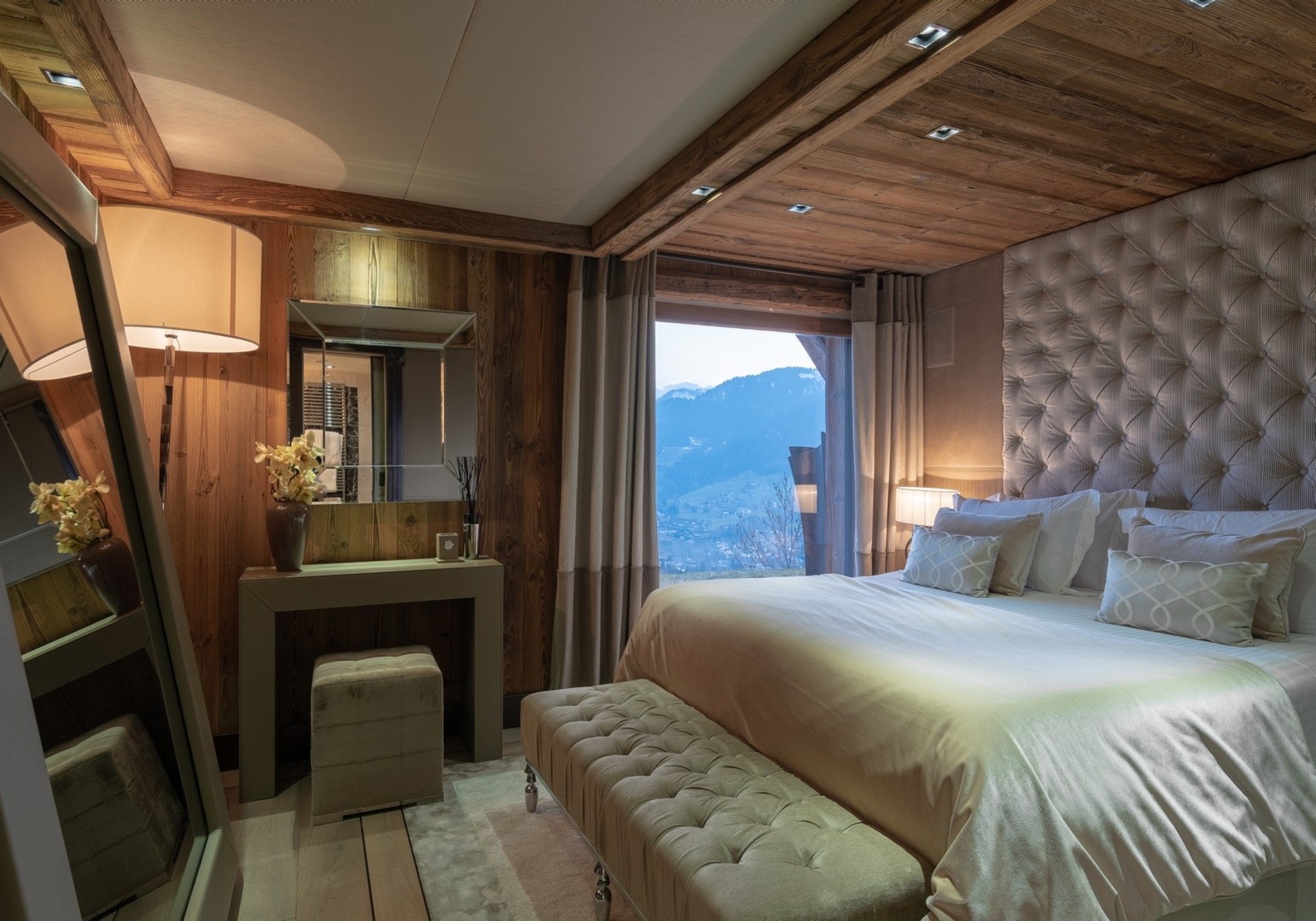 The interior of the chalet is very elegant with the dominant colors grey and cream, combined with lots of wood. A large fireplace is surrounded by a comfortable modern sofa set and armchairs and expansive window fronts flood the rooms with natural light. Several chic crystal chandeliers hang from the ceiling, all together creating a special atmosphere of sublime elegance. Guests have access to 2 dining rooms – one for 10 people and one for 18 – and a bar where they can enjoy champagne or cocktails before dinner.