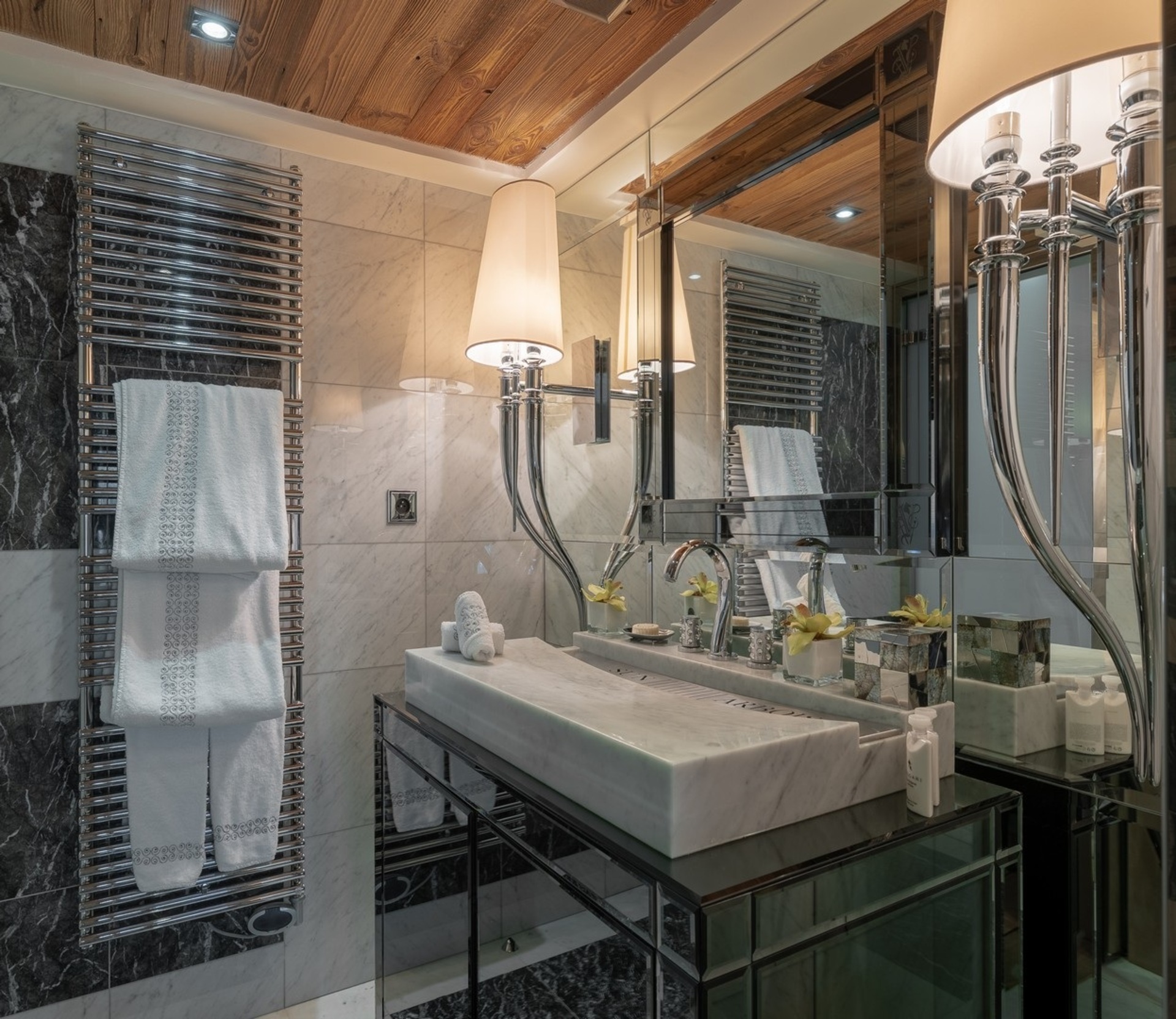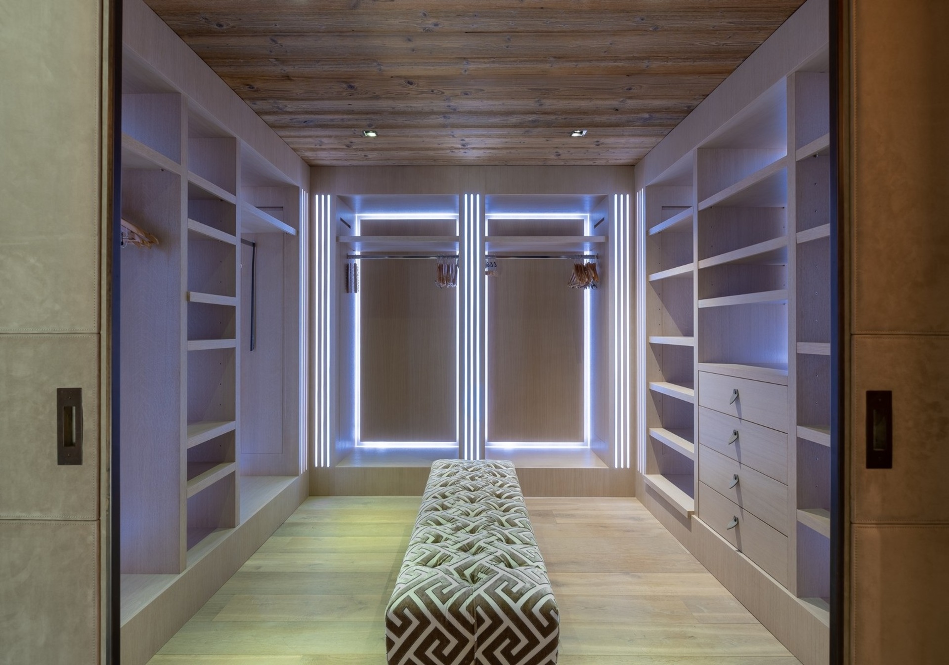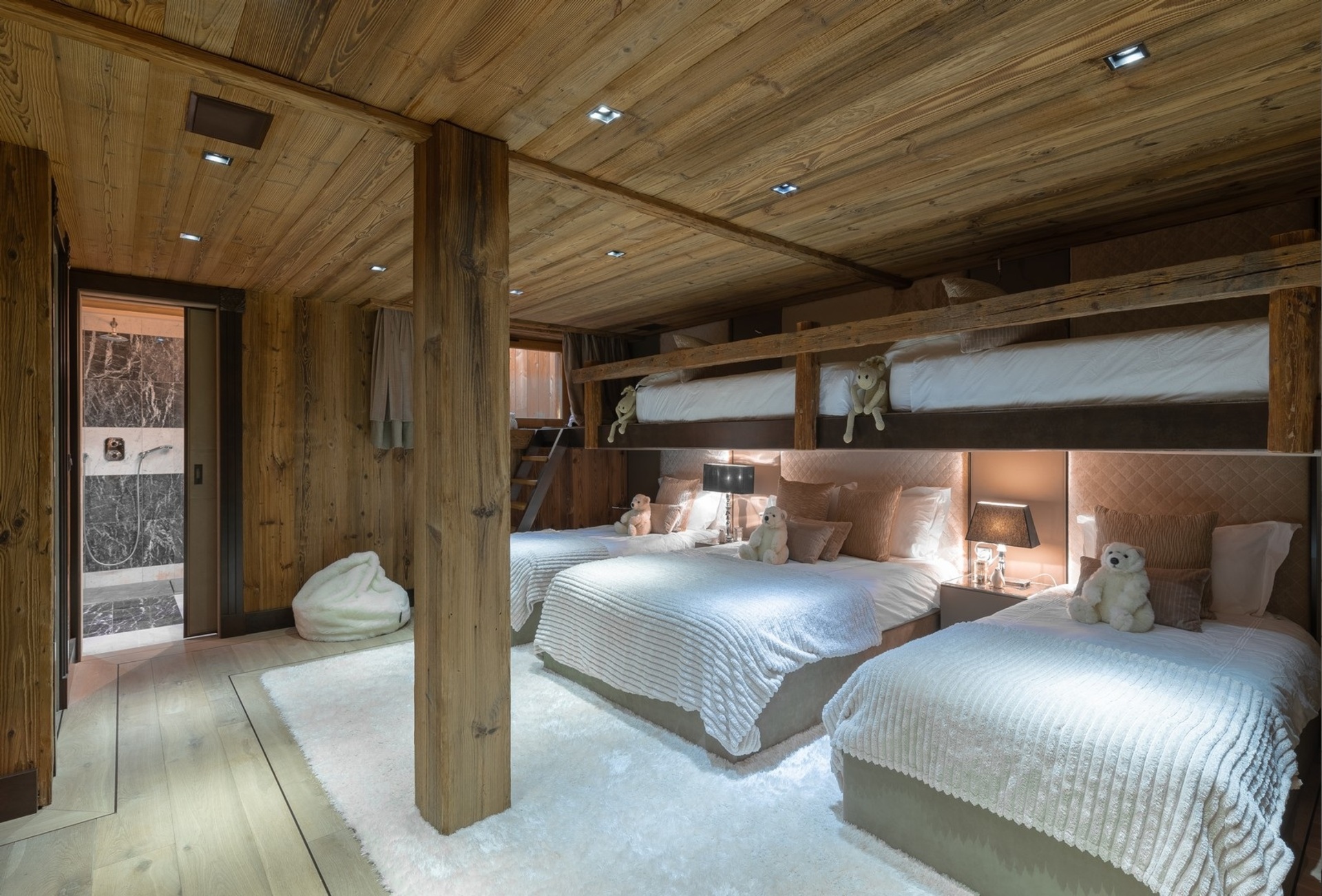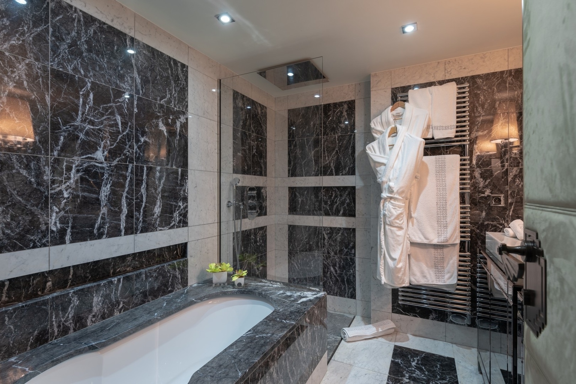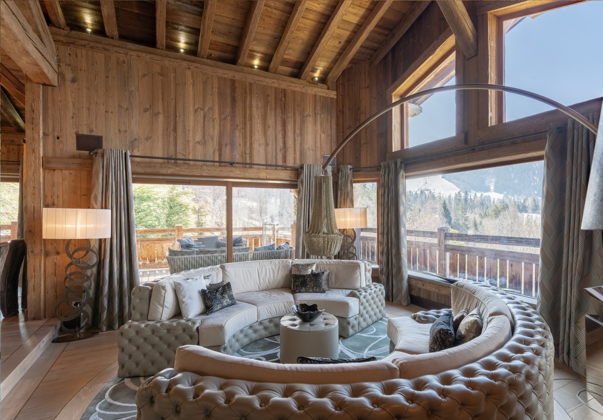 The interior of the chalet is very elegant with the dominant colors grey and cream, combined with lots of wood. A large fireplace is surrounded by a comfortable modern sofa set and armchairs and expansive window fronts flood the rooms with natural light. Several chic crystal chandeliers hang from the ceiling, all together creating a special atmosphere of sublime elegance. Guests have access to 2 dining rooms – one for 10 people and one for 18 – and a bar where they can enjoy champagne or cocktails before dinner.