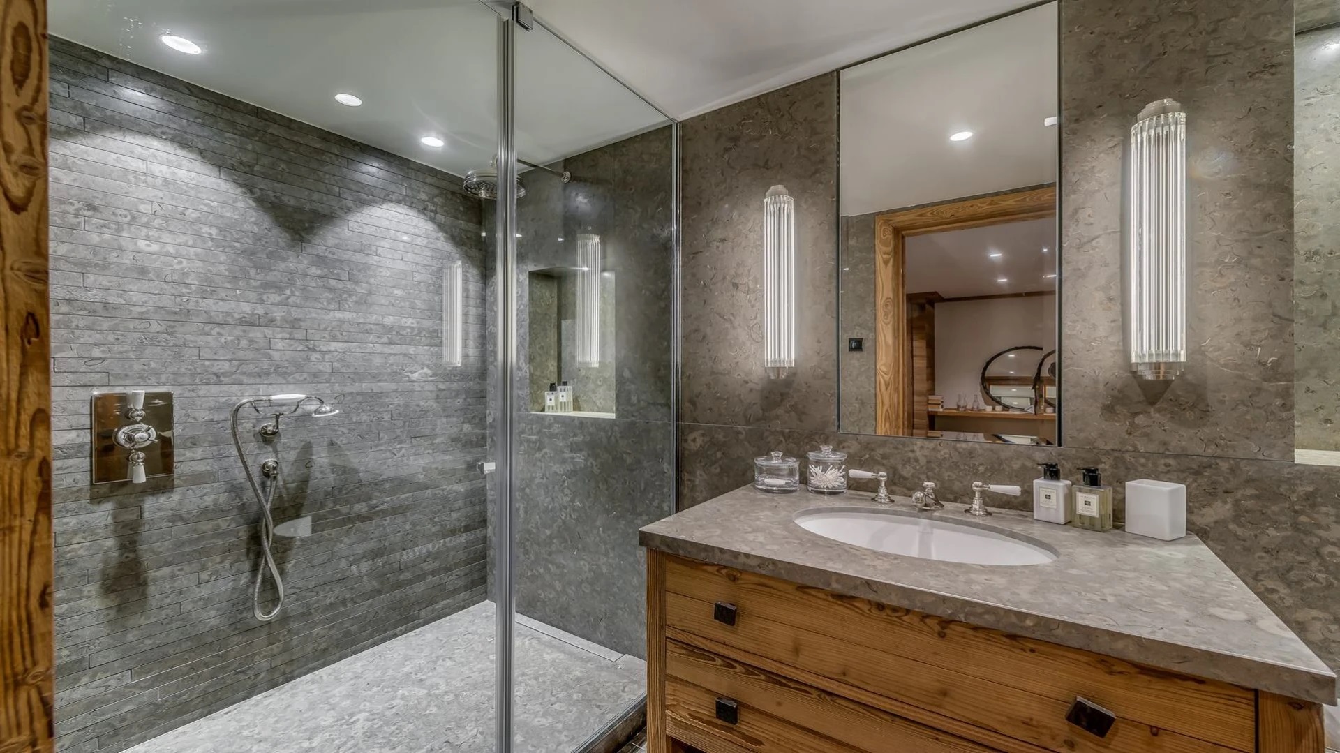 Comfortable sofas and armchairs around the large fireplace create a warm and inviting atmosphere, ideal for a get-together with friends and family after a skiing day. The choice of wood-paneled walls and light-colored ceilings not only contribute to the alpine aesthetic, but also to a rustic and charming ambience. The natural tones and textures of the wood enhance the cosines of the room and create a retreat from the cold outside world. The color concept consists of shades of grey and can be found in every room.