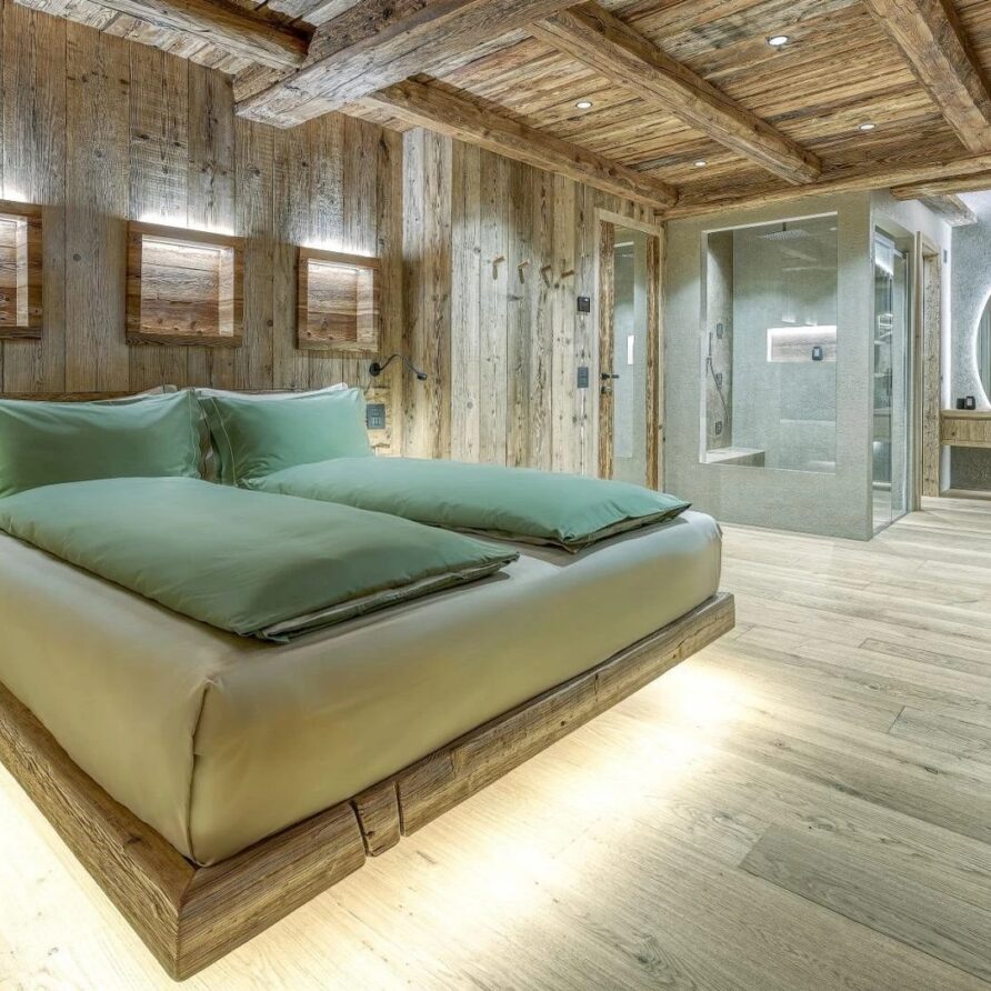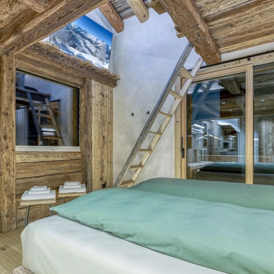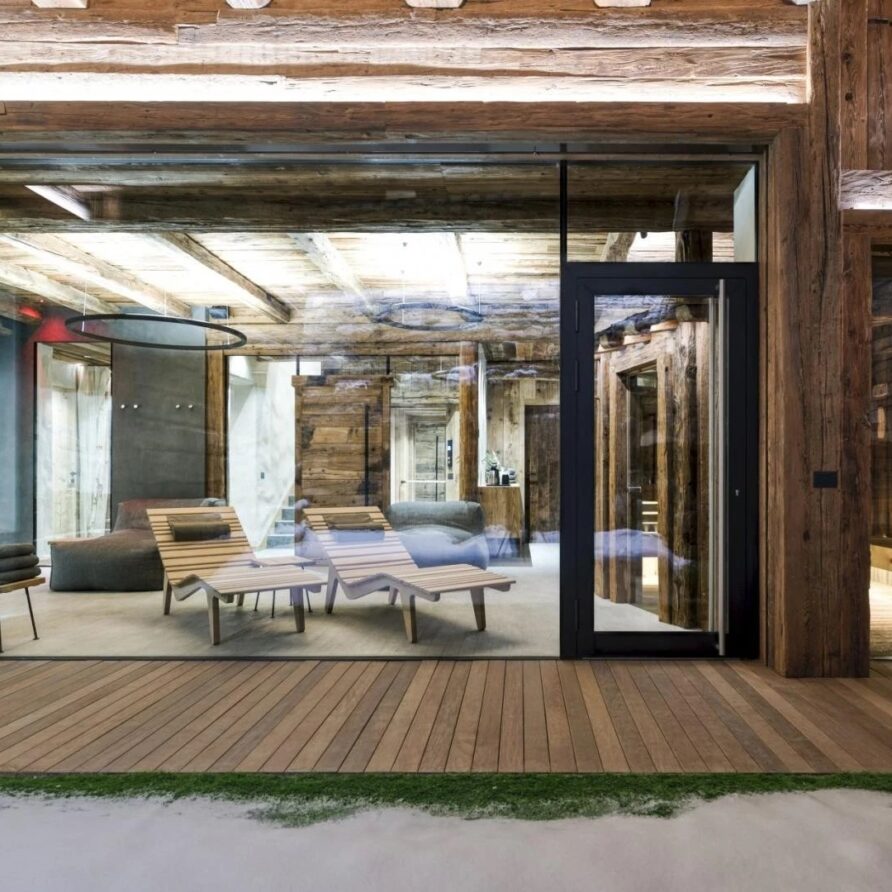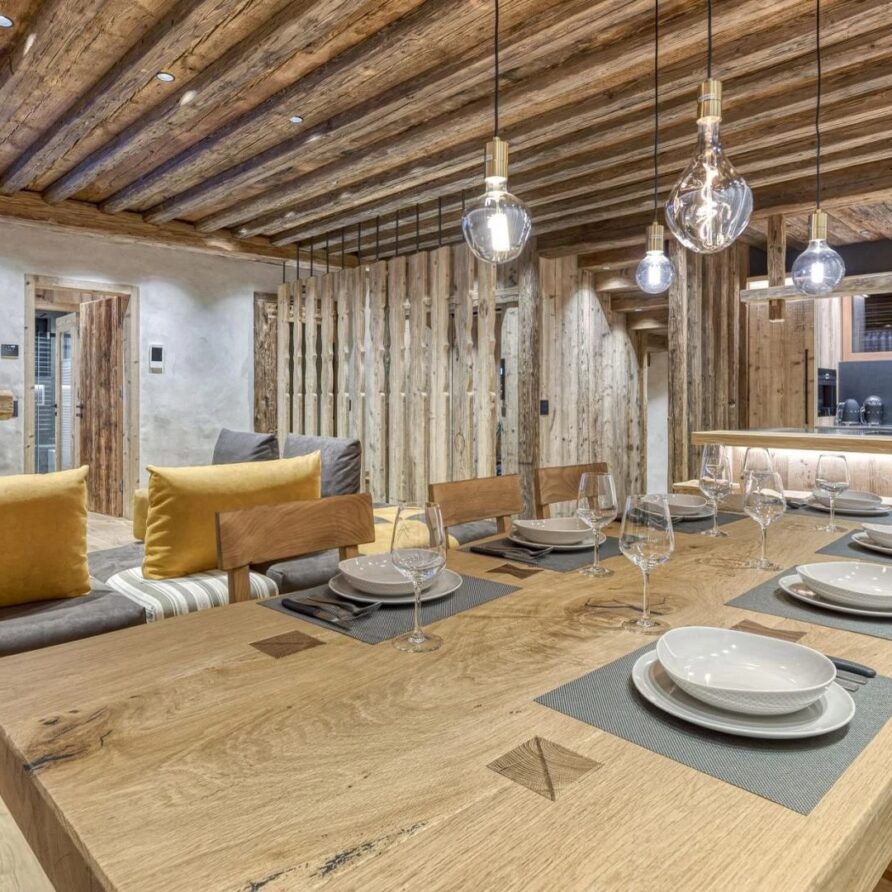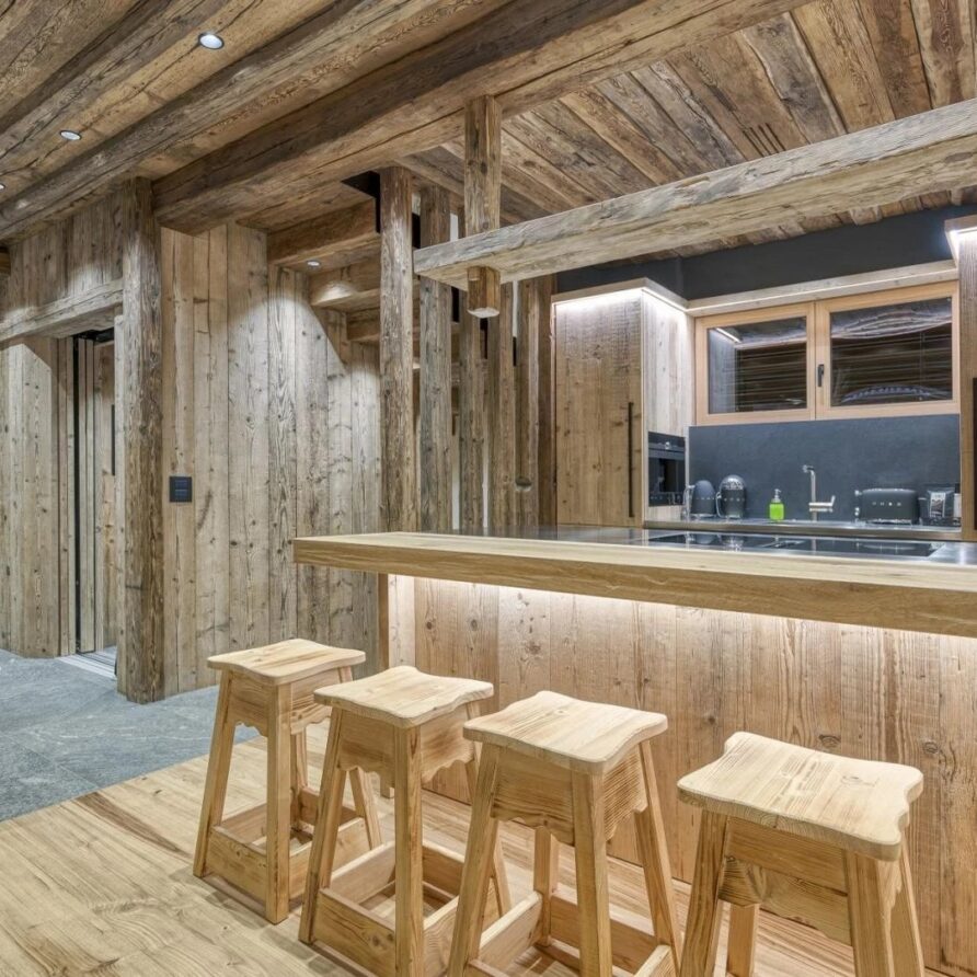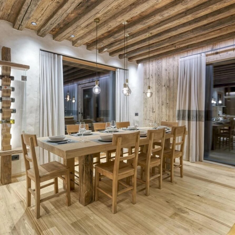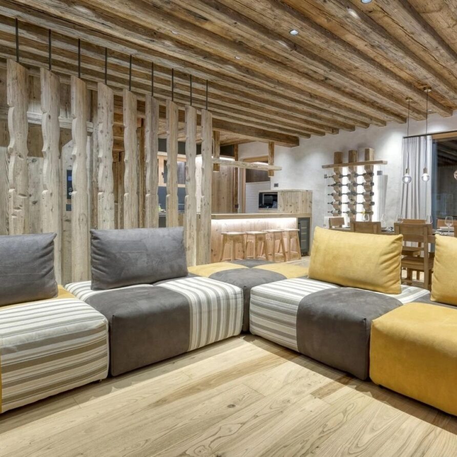 The chalet spans 380sqm across three spacious floors, where alpine charm meets stylish ambiance, blending warmth with contemporary alpine flair. At the heart of the chalet lies the open-plan living area on the ground floor, featuring a glass-fronted gas fireplace that creates the perfect setting for cozy gatherings after a day on the slopes. Picture yourself sipping a hot chocolate while chatting with family, nestled into the super-modern sofas that invite relaxation. Large windows and French doors seamlessly connect the indoors with the breathtaking natural surroundings, allowing the beauty of the outdoors to fill the space with light.