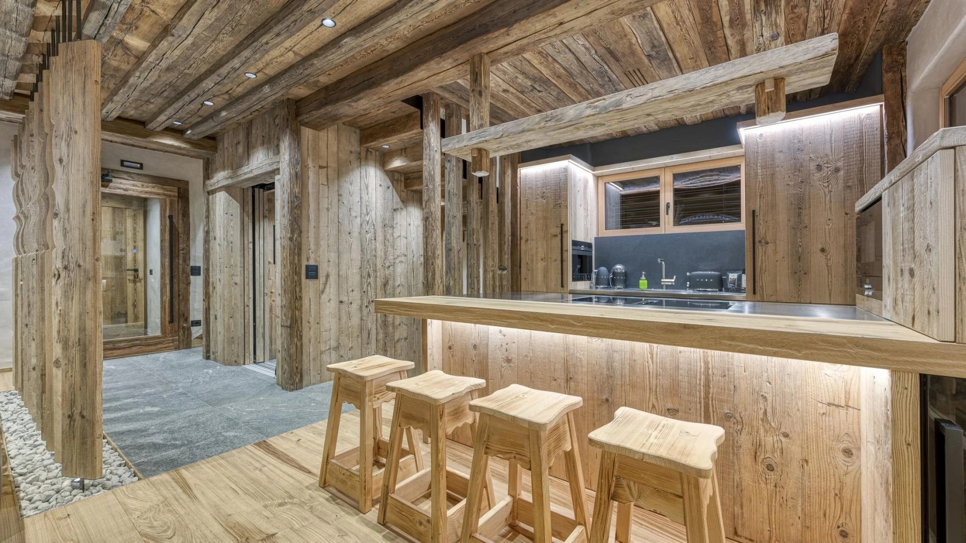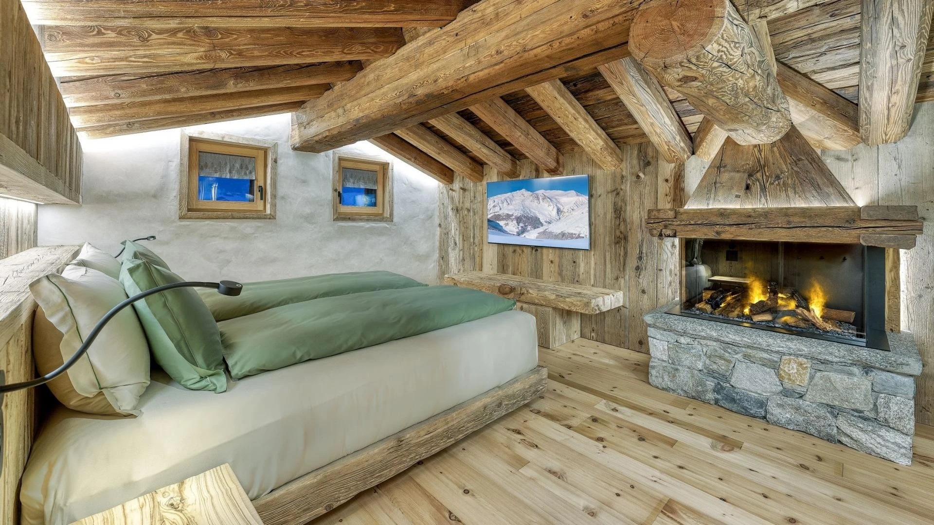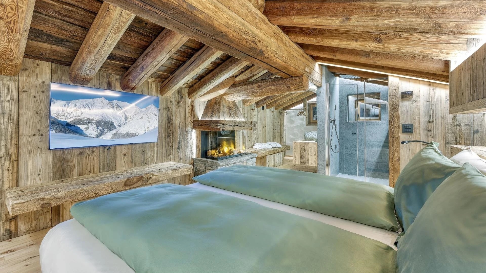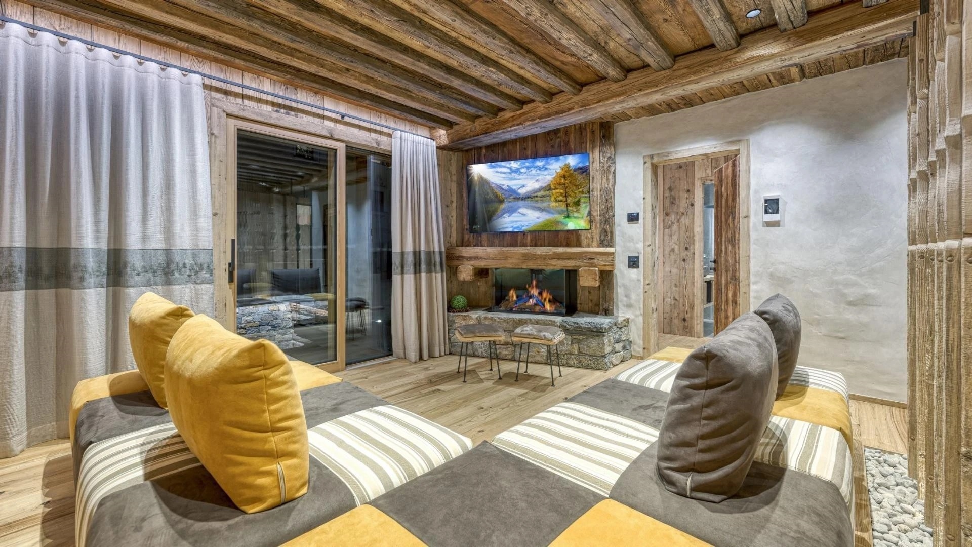 The chalet spans 380sqm across three spacious floors, where alpine charm meets stylish ambiance, blending warmth with contemporary alpine flair. At the heart of the chalet lies the open-plan living area on the ground floor, featuring a glass-fronted gas fireplace that creates the perfect setting for cozy gatherings after a day on the slopes. Picture yourself sipping a hot chocolate while chatting with family, nestled into the super-modern sofas that invite relaxation. Large windows and French doors seamlessly connect the indoors with the breathtaking natural surroundings, allowing the beauty of the outdoors to fill the space with light.
