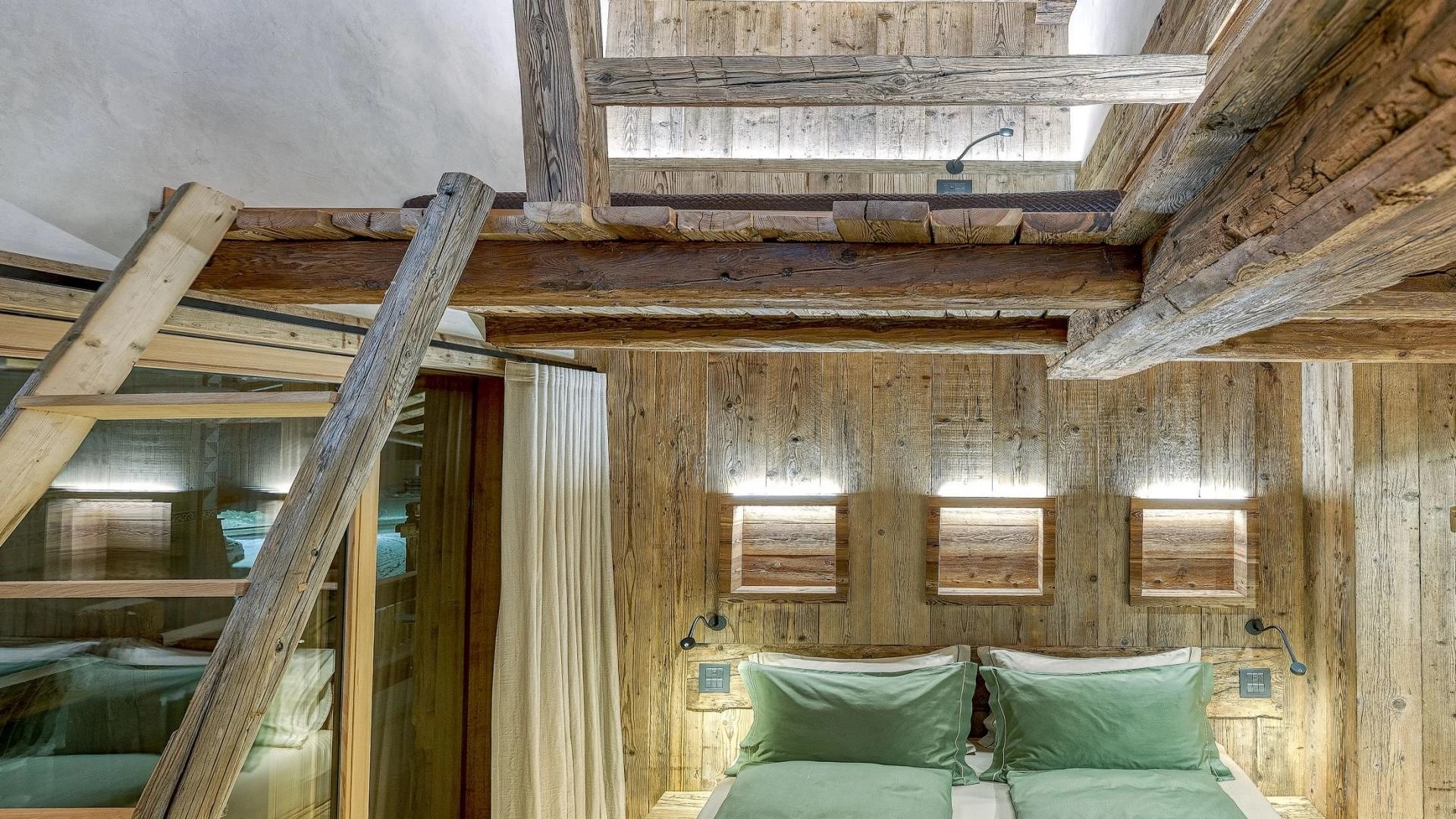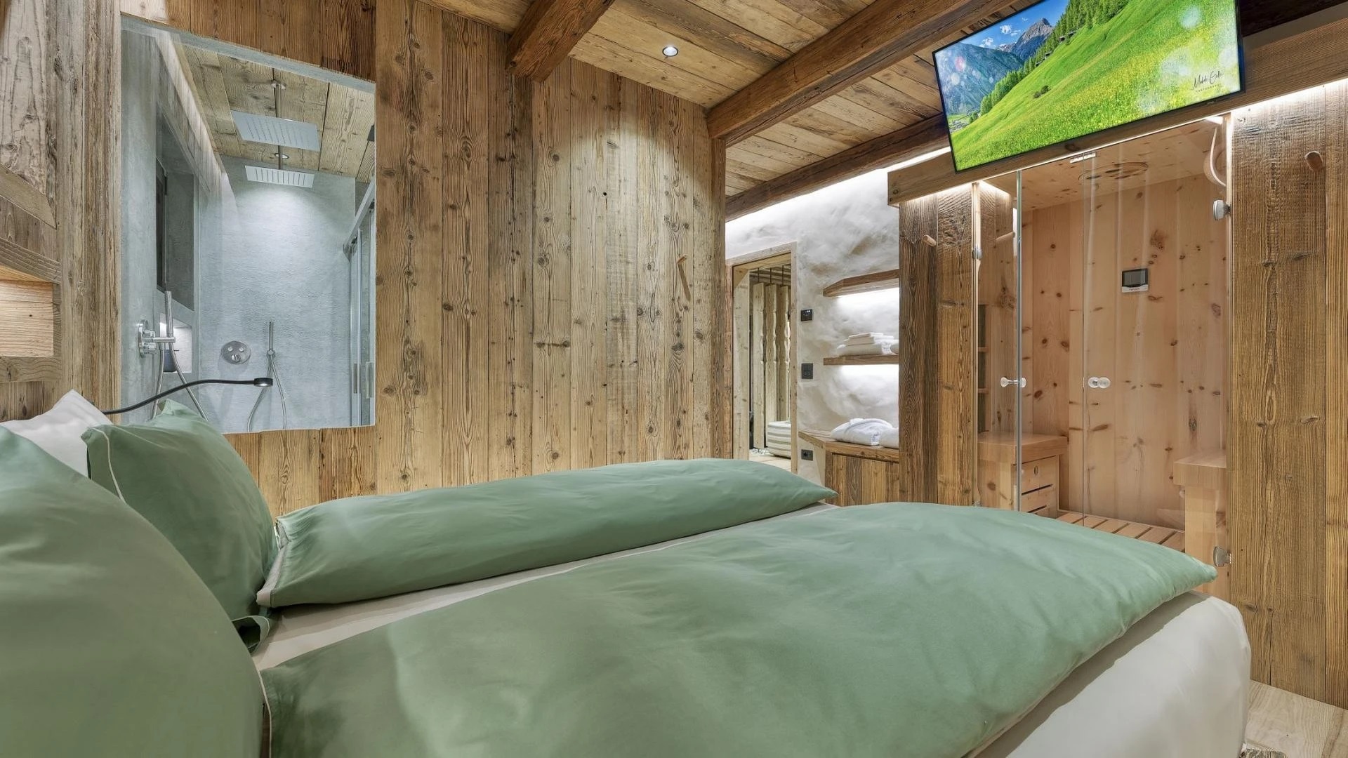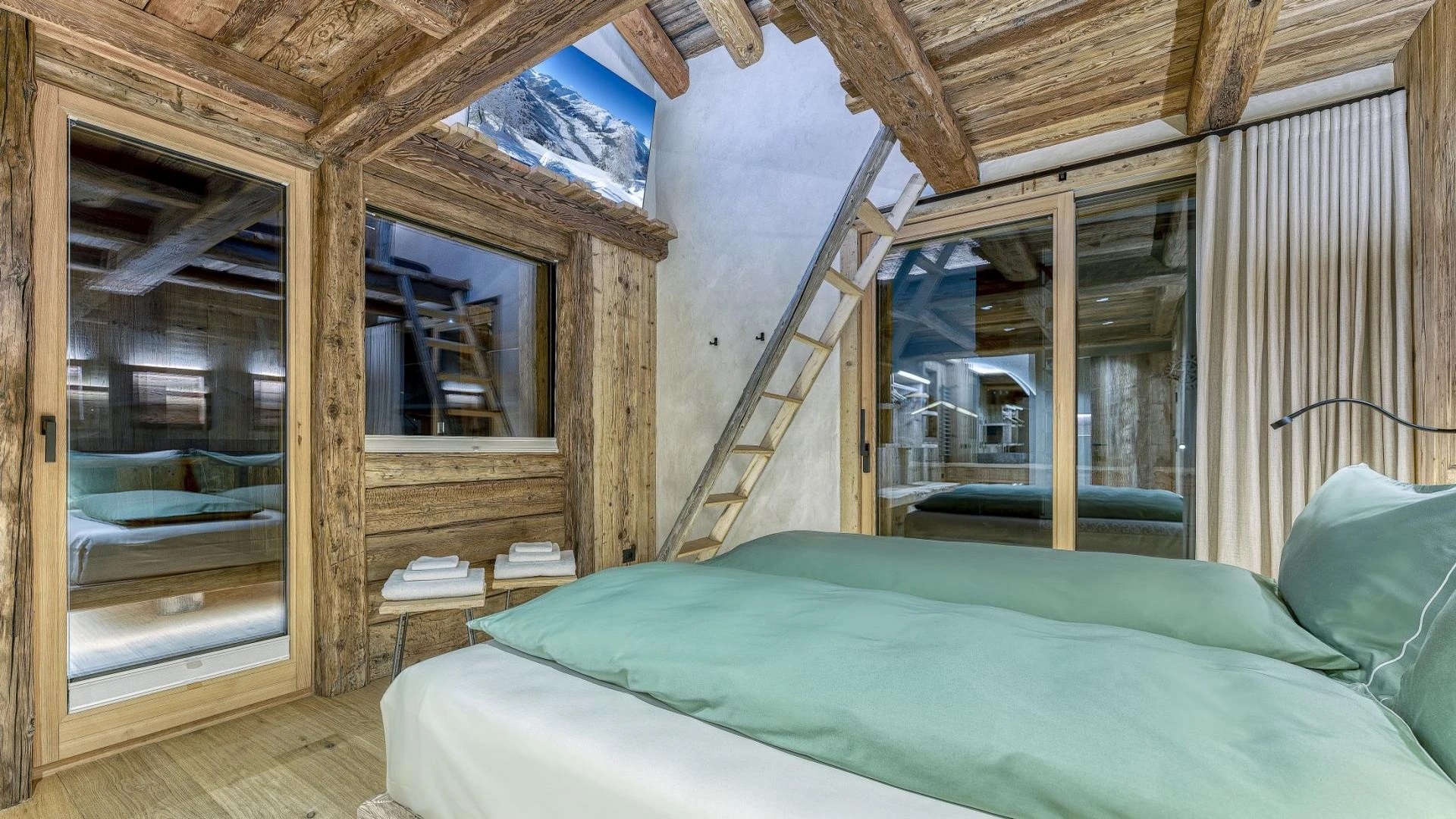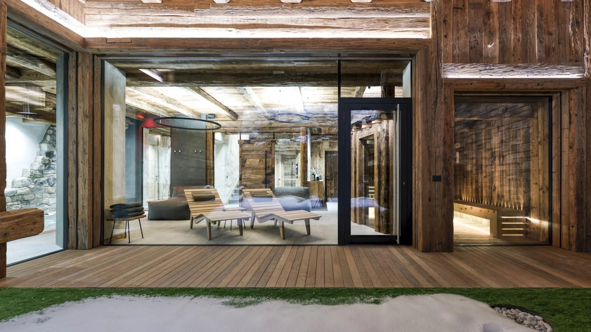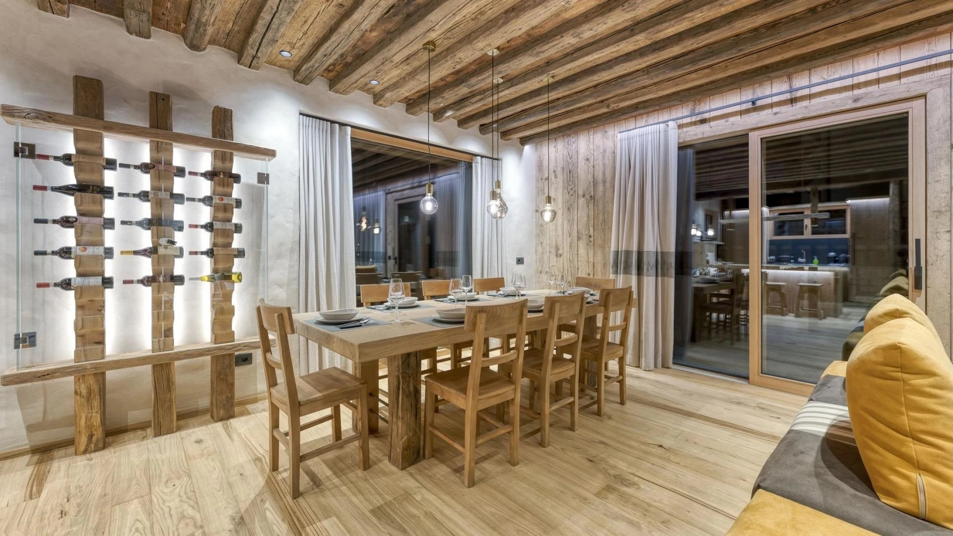 The chalet spans 380sqm across three spacious floors, where alpine charm meets stylish ambiance, blending warmth with contemporary alpine flair. At the heart of the chalet lies the open-plan living area on the ground floor, featuring a glass-fronted gas fireplace that creates the perfect setting for cozy gatherings after a day on the slopes. Picture yourself sipping a hot chocolate while chatting with family, nestled into the super-modern sofas that invite relaxation. Large windows and French doors seamlessly connect the indoors with the breathtaking natural surroundings, allowing the beauty of the outdoors to fill the space with light.