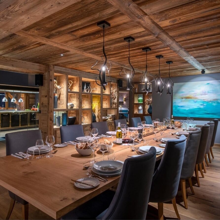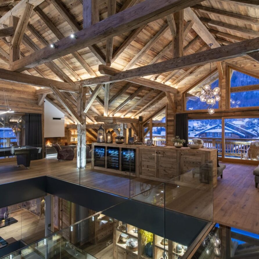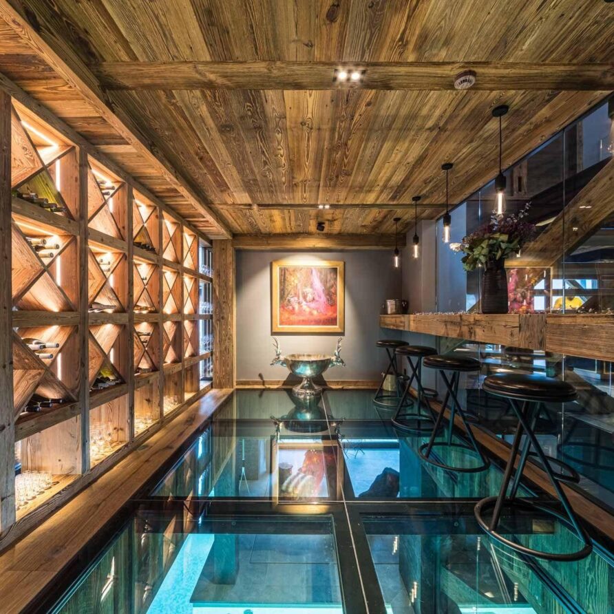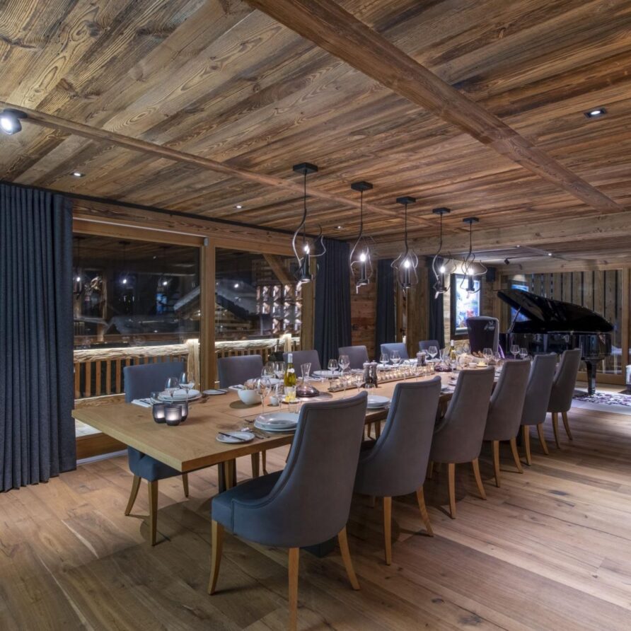Before indulging on your evening’s delicacies, enjoy a sip of something nice from the chalet bar area or the floating wine cellar adjoining the dining room! With the glass floor benefiting from views of the indoor swimming pool below and the grand staircase to the front door right up to the apex of the roof at the top of the building, this area is perfect for socializing as you wait for your highly skilled chefs to prepare your evening meal.