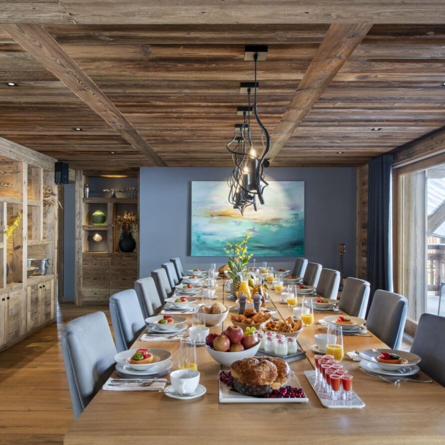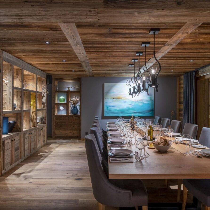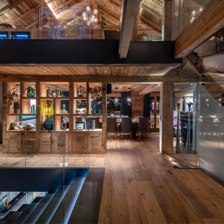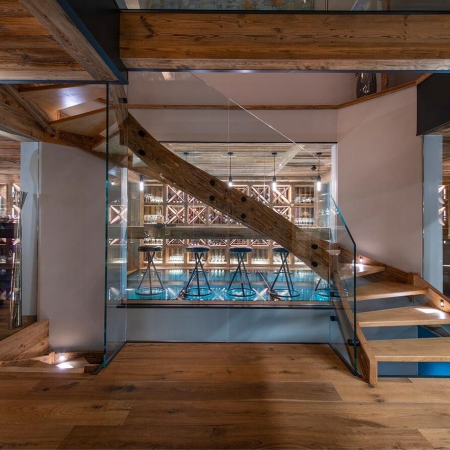 Before indulging on your evening’s delicacies, enjoy a sip of something nice from the chalet bar area or the floating wine cellar adjoining the dining room! With the glass floor benefiting from views of the indoor swimming pool below and the grand staircase to the front door right up to the apex of the roof at the top of the building, this area is perfect for socializing as you wait for your highly skilled chefs to prepare your evening meal.