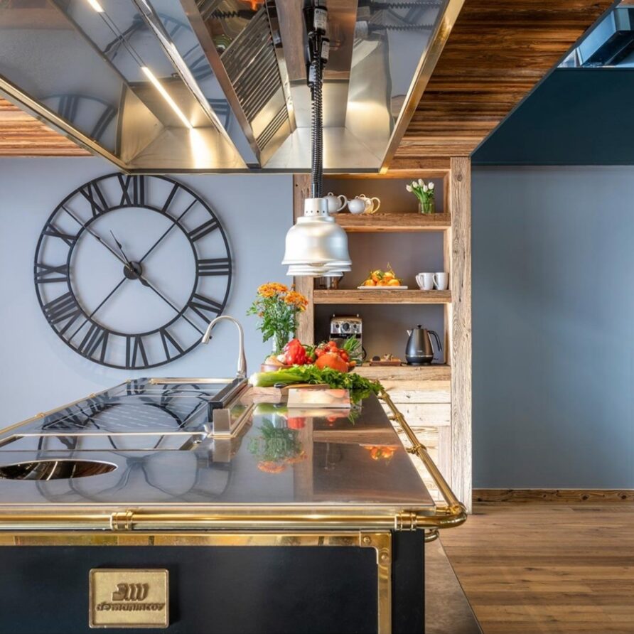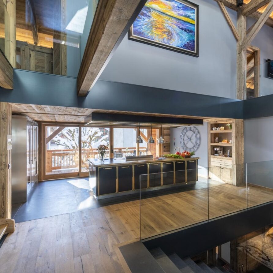 The astounding, spacious open-plan living areas on the top floor of the chalet, will immediately take your breath away. Finished with the highest quality of furnishings, the interior manages to command a sense of opulence, whilst harmoniously blending with the traditional charm from the exposed wooden floorboards and beams. After a hard day’s skiing, relax on the bespoke William Yeoward luxury sofas, underneath the large Brand van Egmond chandelier, orientated so that you can absorb the beautiful snowy scenes whilst warming to the fireplace.