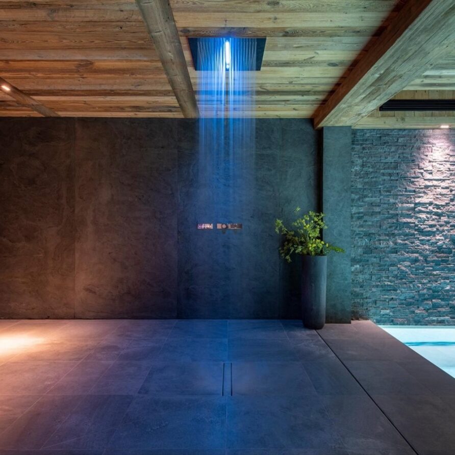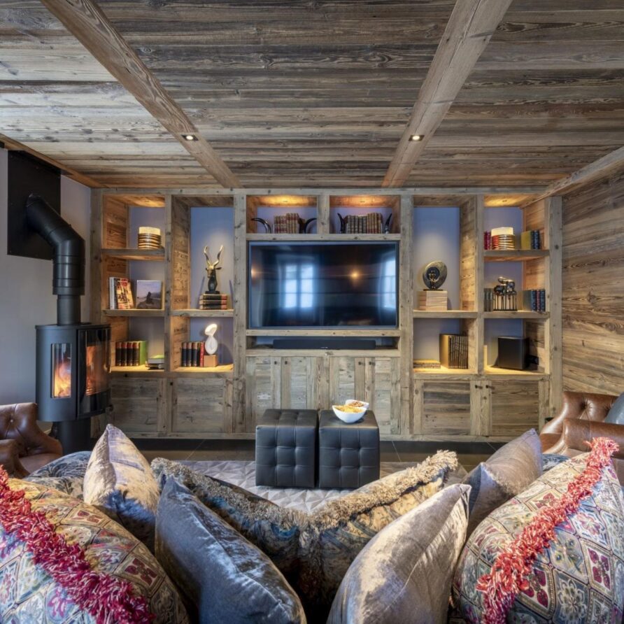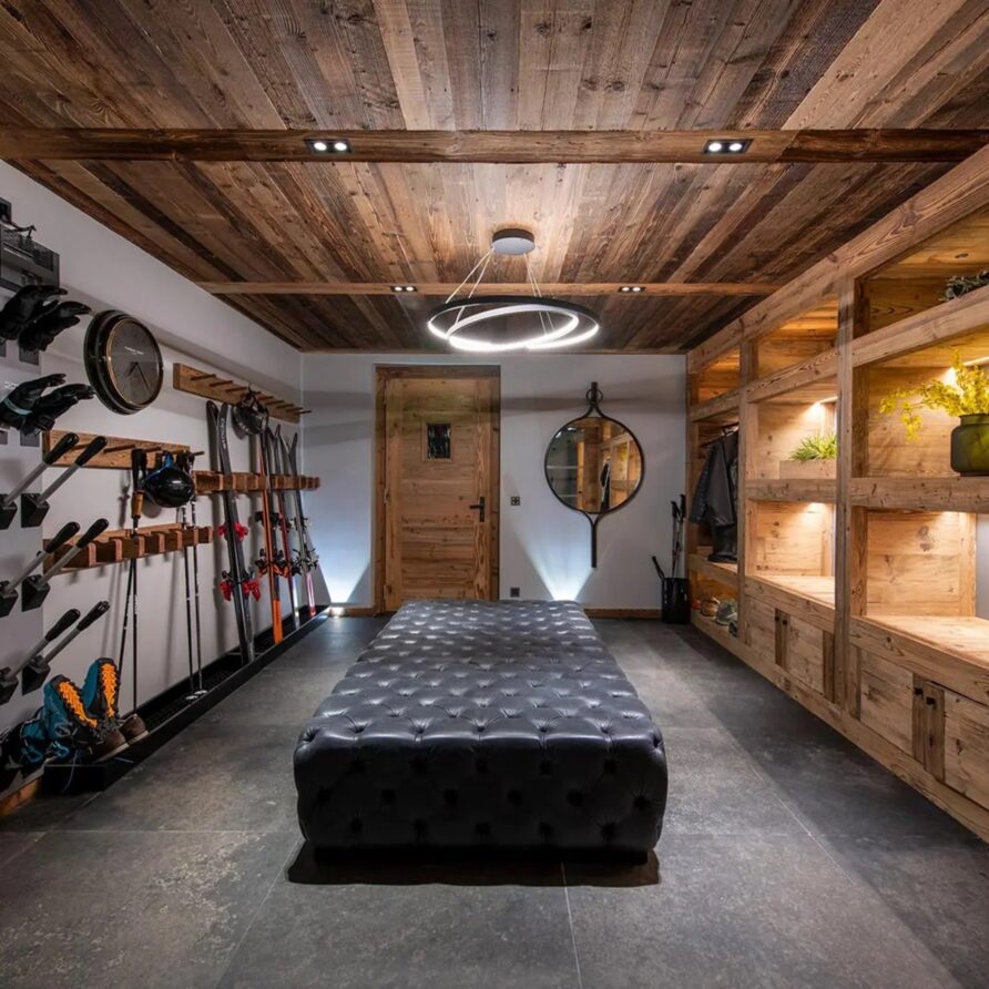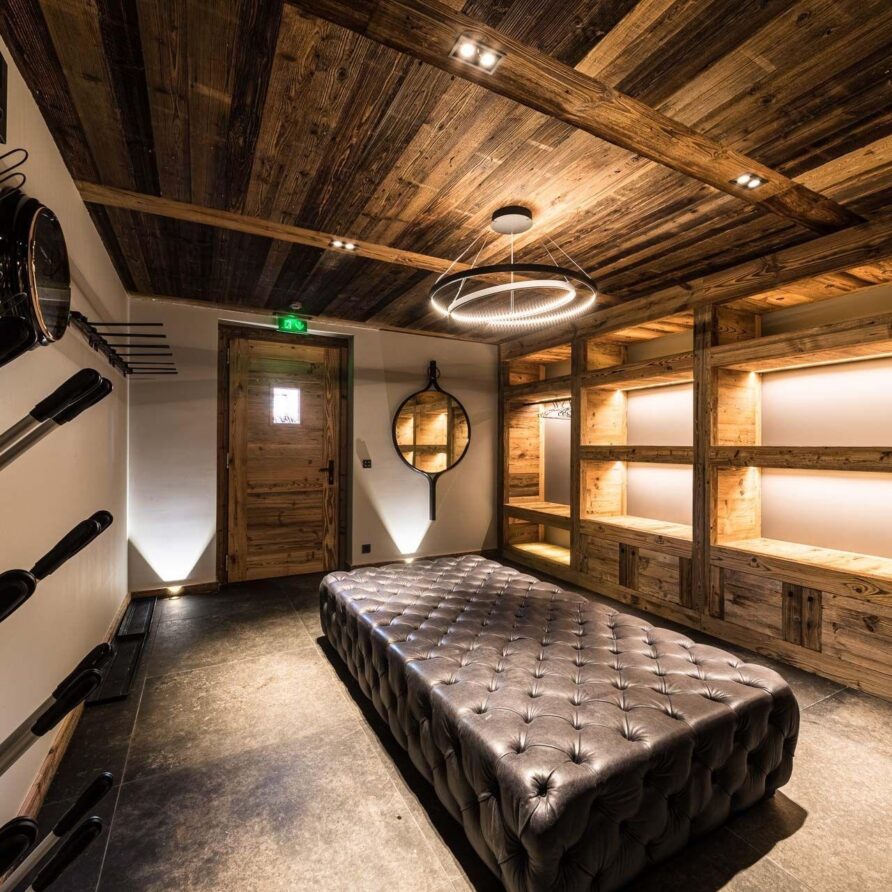 After satisfying your appetites, revel in the range of wellness and entertainment facilities on offer to you. Featuring an exceptional private spa, guests will be able to pamper themselves in the: indoor L-shaped swimming pool with counter current jets, various massage zones and two large fountains; indoor and outdoor hot tubs, as well as a large steam room. To complete this space, lounge seating, a rain shower and fiber optic ‘night sky’ lighting are also present to ensure complete relaxation. Following on from the spa, a corridor leads you to a raised studio to continue your pampering session. Ideal for Yoga/Pilates, there is also a massage room to enjoy a range of Bamford treatments, ready for your following ski days.