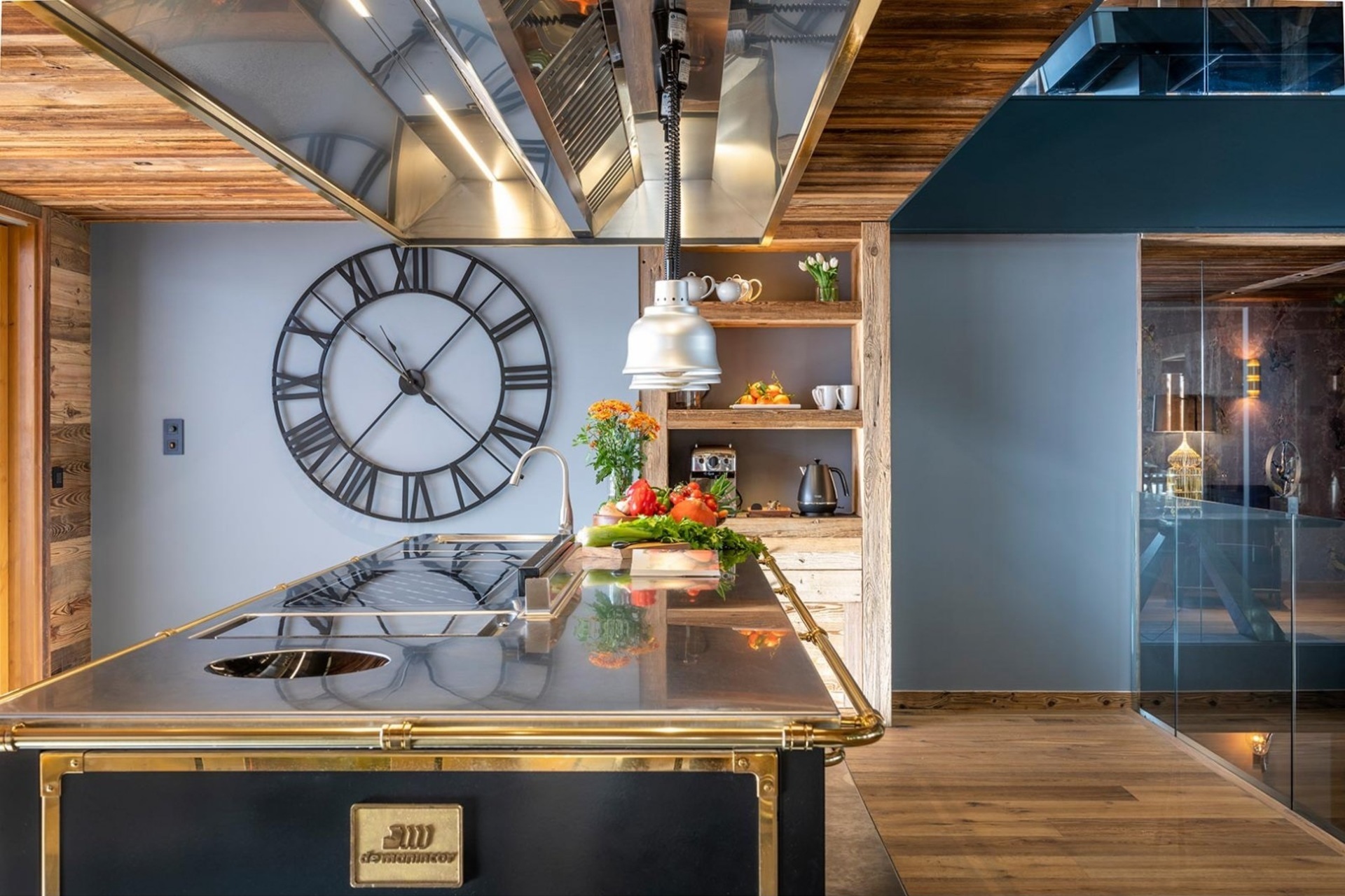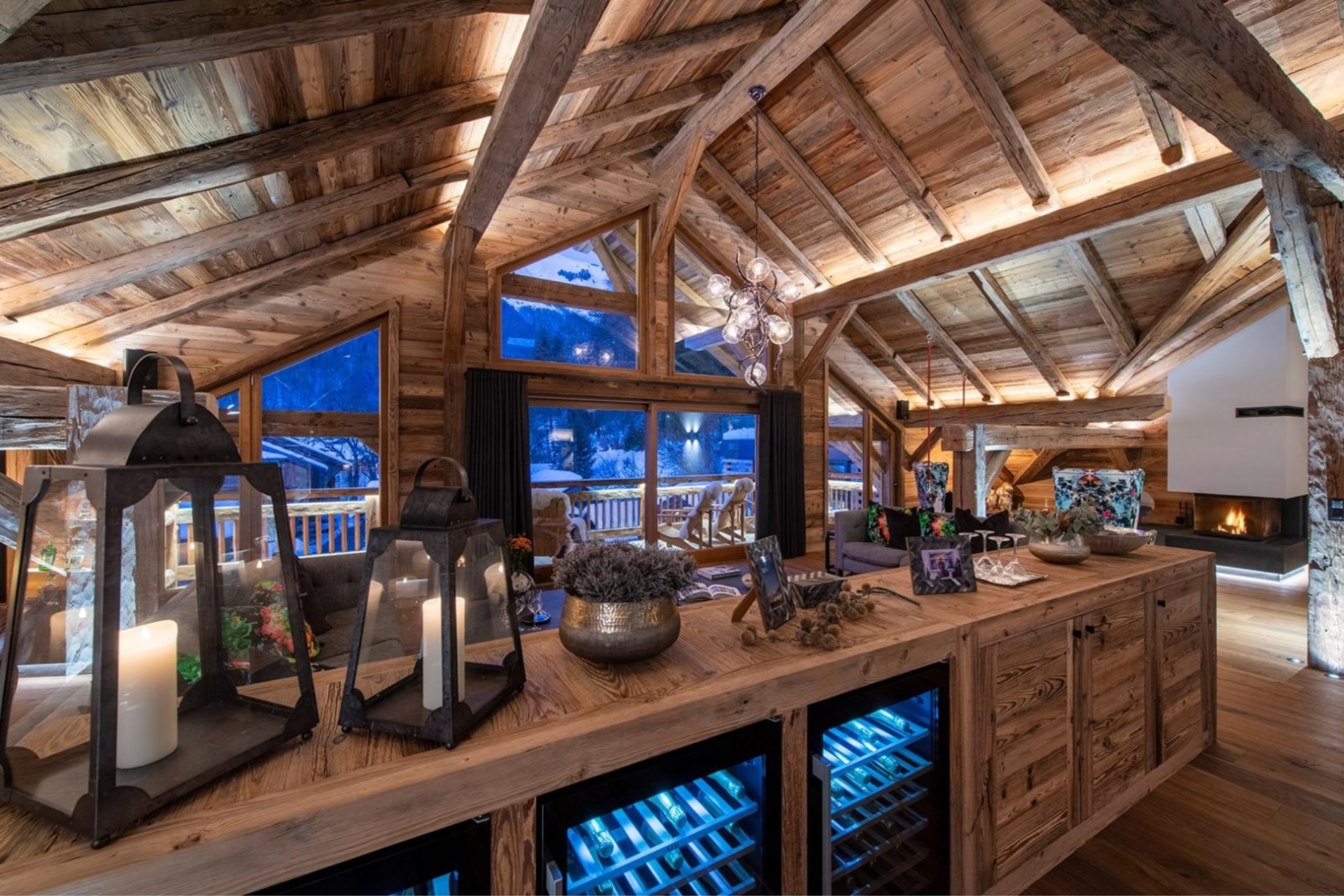 The astounding, spacious open-plan living areas on the top floor of the chalet, will immediately take your breath away. Finished with the highest quality of furnishings, the interior manages to command a sense of opulence, whilst harmoniously blending with the traditional charm from the exposed wooden floorboards and beams. After a hard day’s skiing, relax on the bespoke William Yeoward luxury sofas, underneath the large Brand van Egmond chandelier, orientated so that you can absorb the beautiful snowy scenes whilst warming to the fireplace.