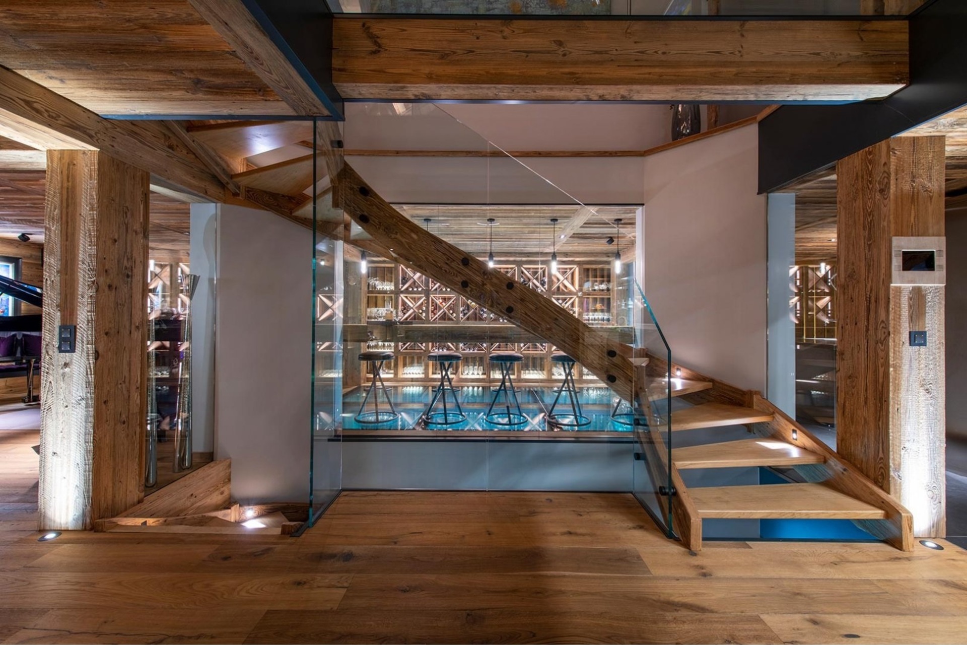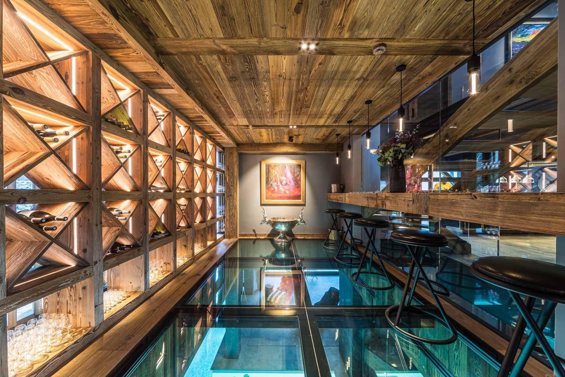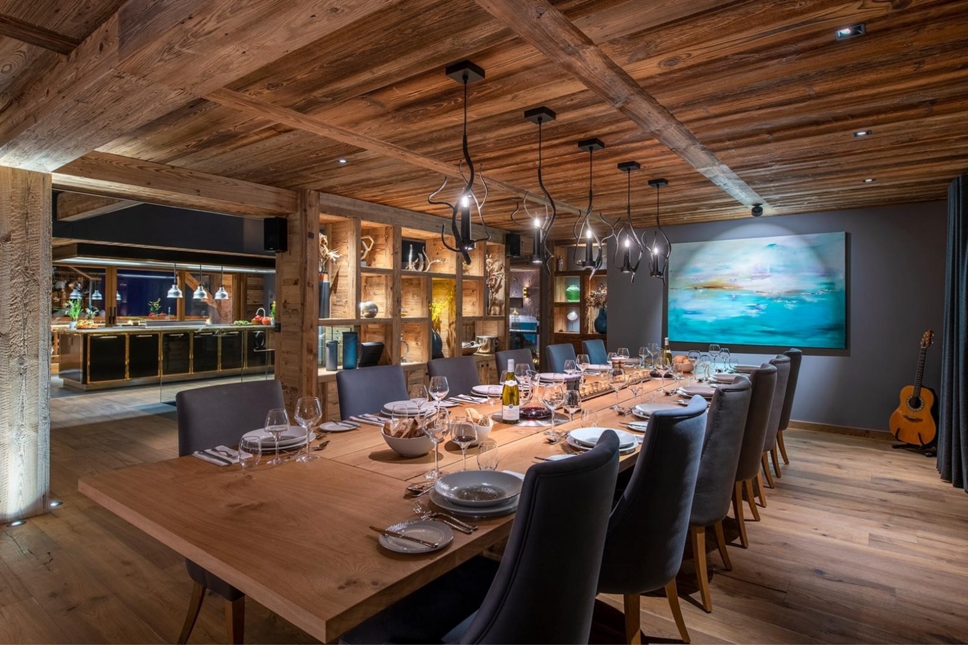 Before indulging on your evening’s delicacies, enjoy a sip of something nice from the chalet bar area or the floating wine cellar adjoining the dining room! With the glass floor benefiting from views of the indoor swimming pool below and the grand staircase to the front door right up to the apex of the roof at the top of the building, this area is perfect for socializing as you wait for your highly skilled chefs to prepare your evening meal.