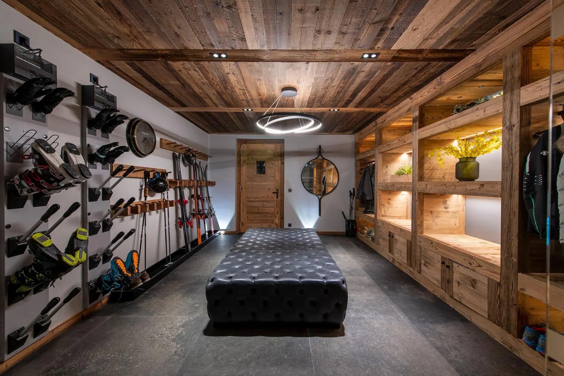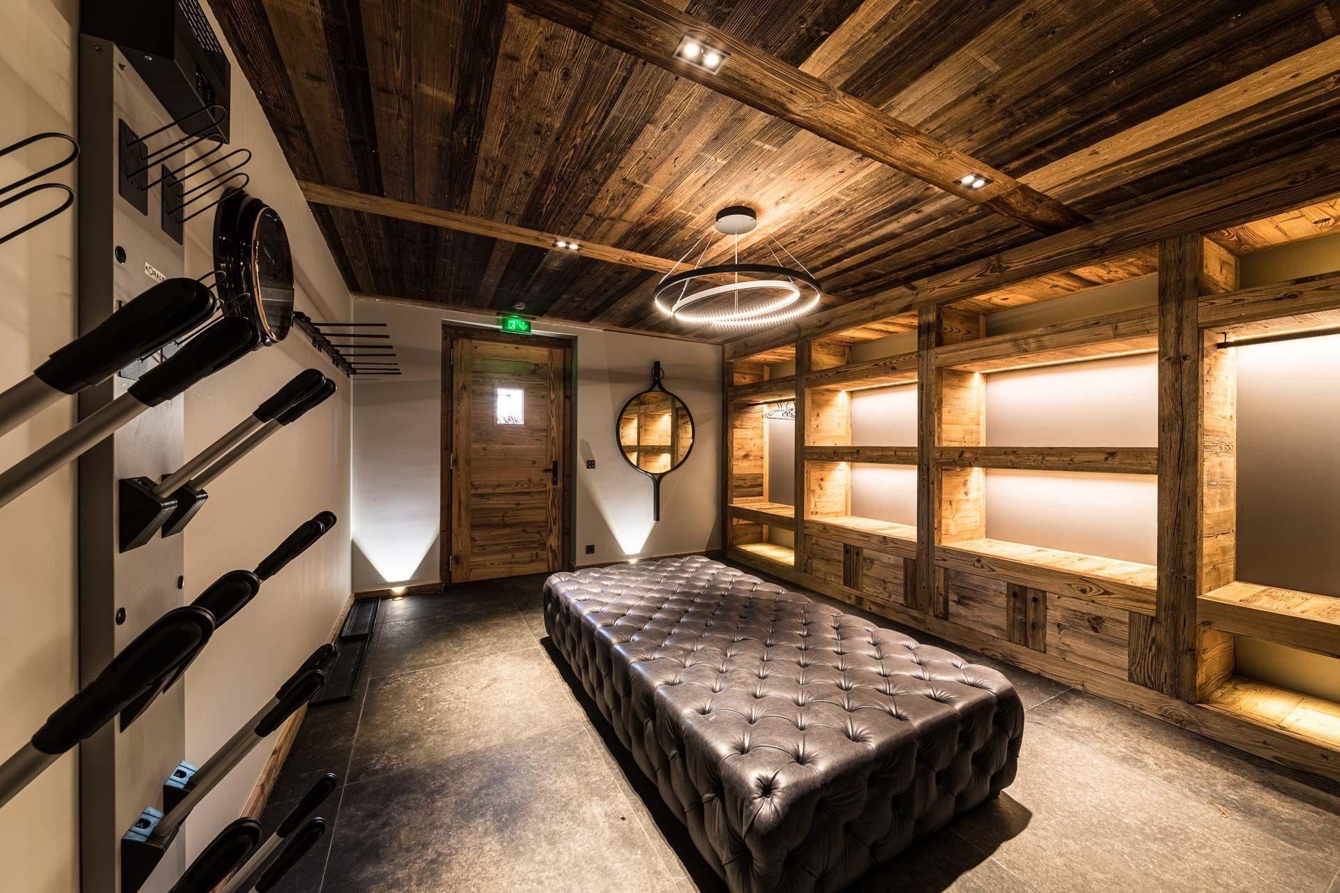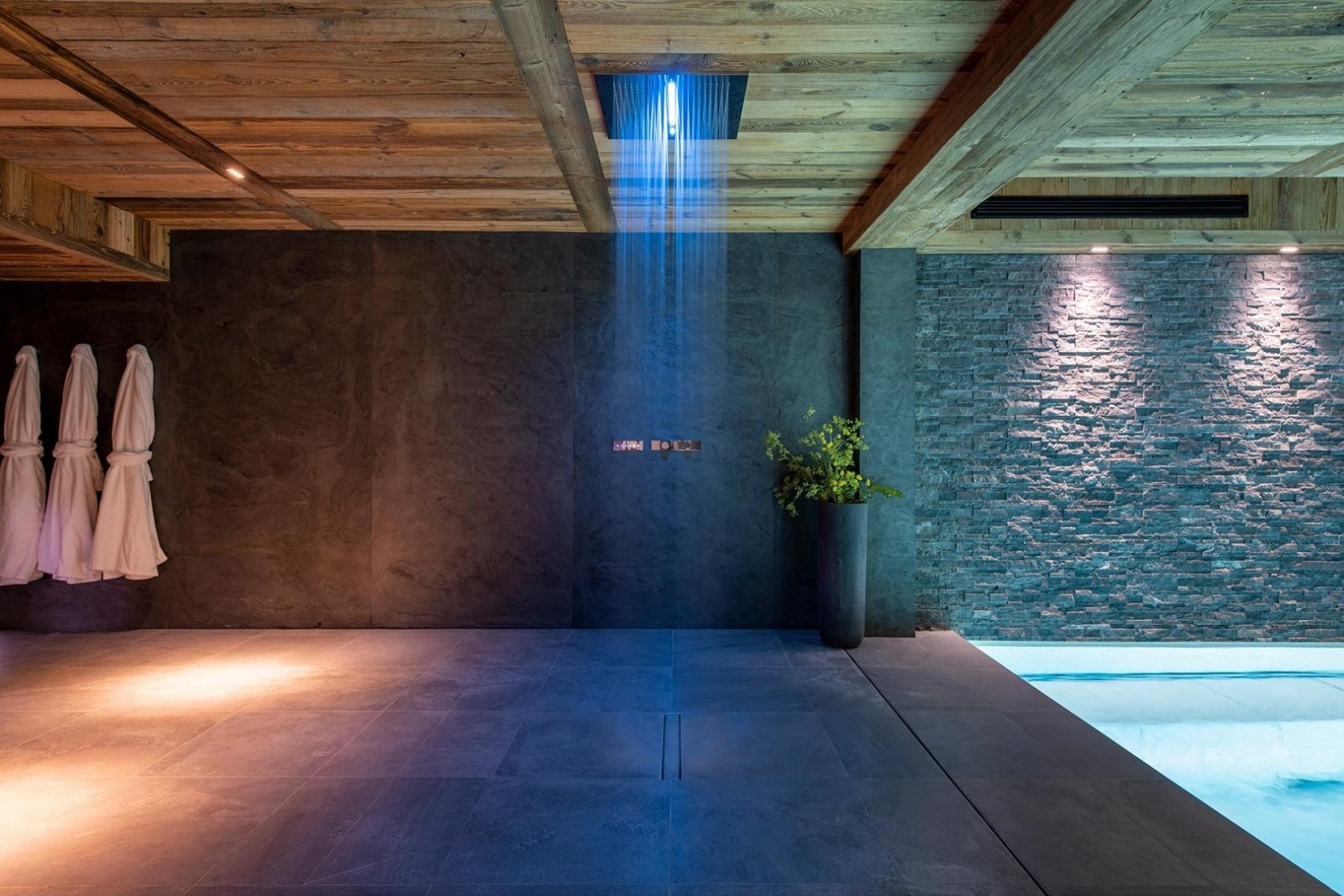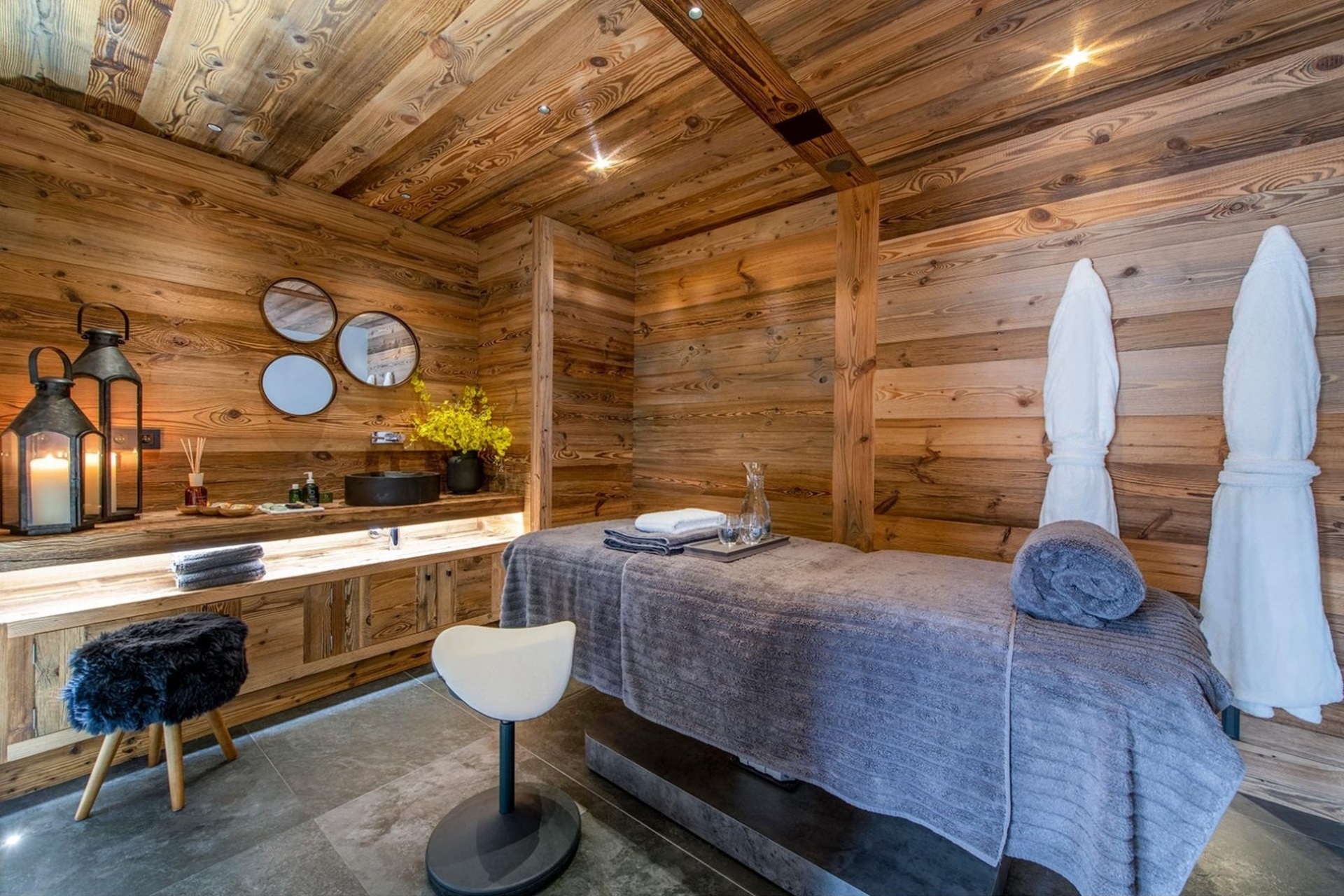 After satisfying your appetites, revel in the range of wellness and entertainment facilities on offer to you. Featuring an exceptional private spa, guests will be able to pamper themselves in the: indoor L-shaped swimming pool with counter current jets, various massage zones and two large fountains; indoor and outdoor hot tubs, as well as a large steam room. To complete this space, lounge seating, a rain shower and fiber optic ‘night sky’ lighting are also present to ensure complete relaxation. Following on from the spa, a corridor leads you to a raised studio to continue your pampering session. Ideal for Yoga/Pilates, there is also a massage room to enjoy a range of Bamford treatments, ready for your following ski days.