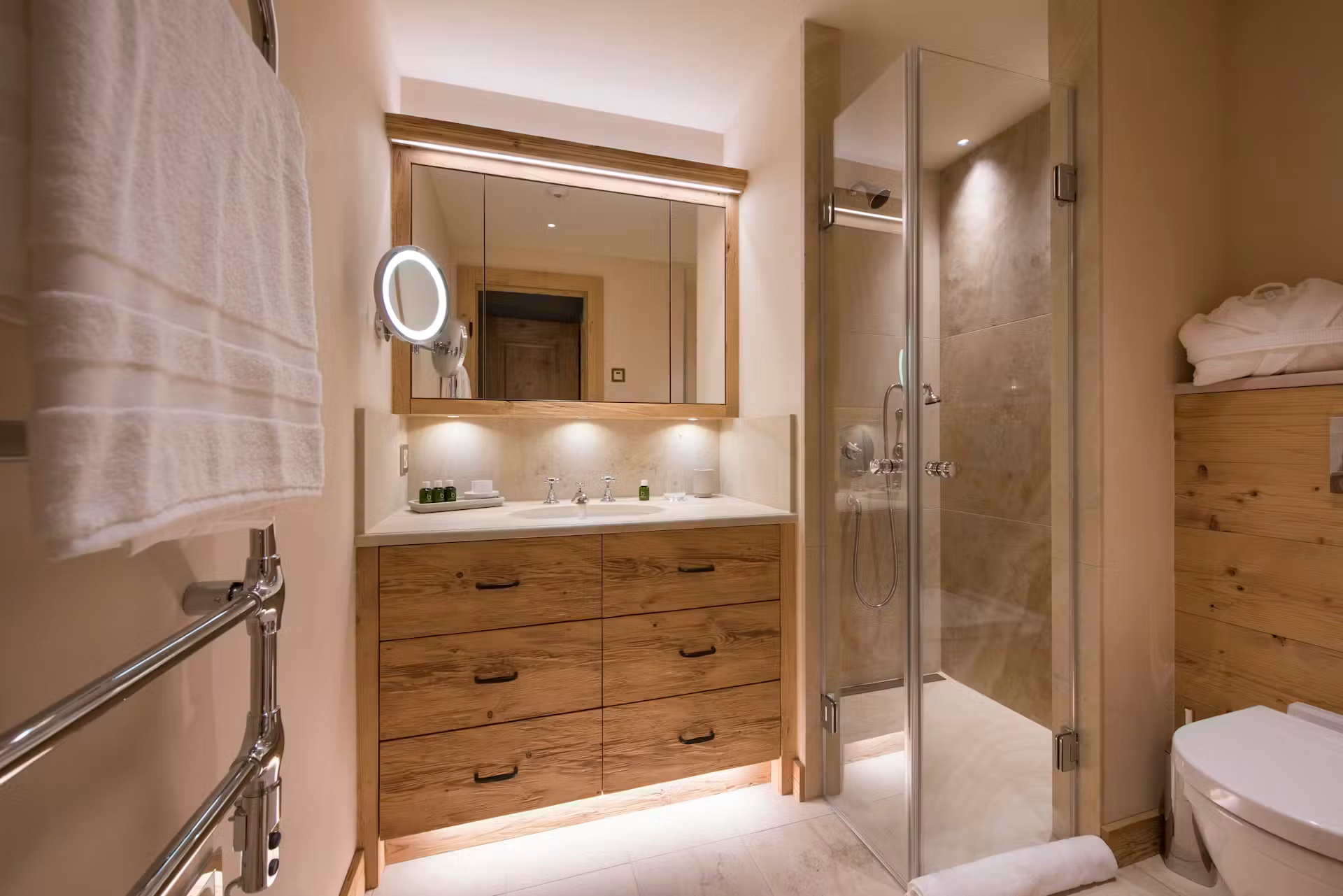 Found on the first floor of the chalet, you will find two cozy, elegant sitting rooms. Perhaps most reminiscent of a country manor house, with some more alpine features to one of them, these rooms provide ample comfortable, designer furniture to gather around the open stone fireplaces. A formal dining room offers a sophisticated space for gourmet dining. These living and dining spaces are surrounded by windows that offer picture postcard views towards the stunning mountain vistas. To further enjoy the incredible views, on warmer spring evenings or crisp bluebird days, head outside to the expansive sun terrace.
