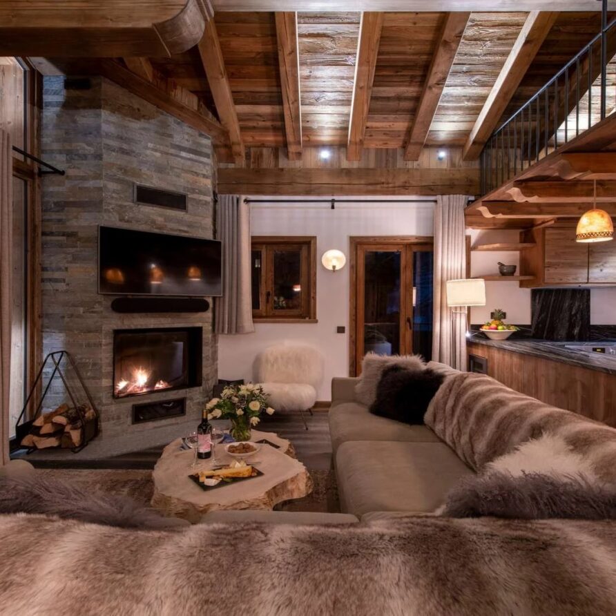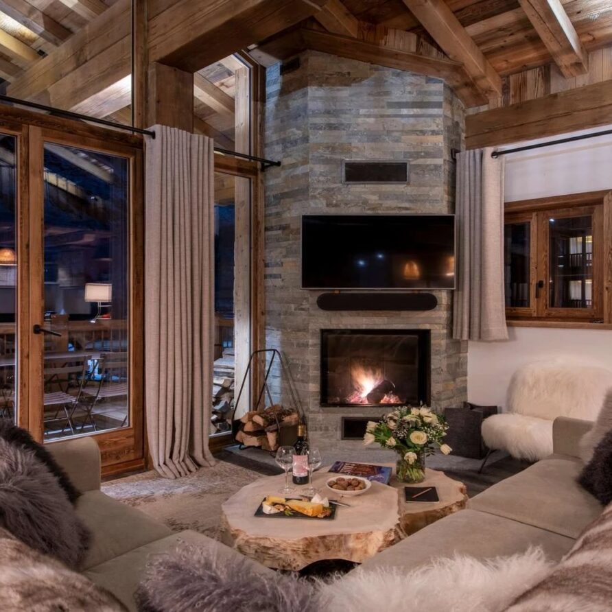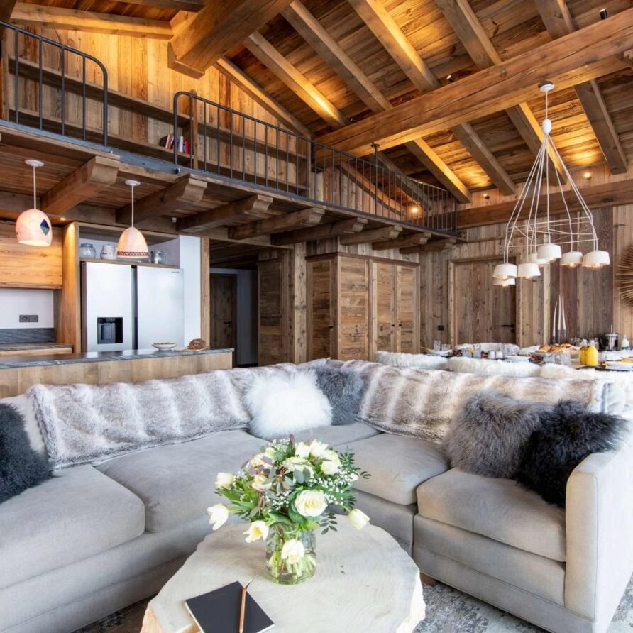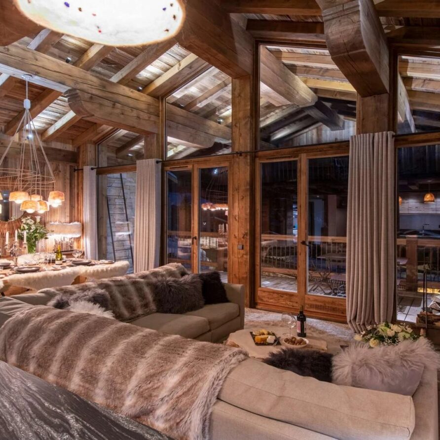 The chalet offer a private ski room equipped with boot warmers is located directly next to the main door. The living area is found on your left as you walk through the hallway. It is a beautiful space, with a sense of grandeur created by floor to ceiling windows reaching up to the dramatic double-height roof.