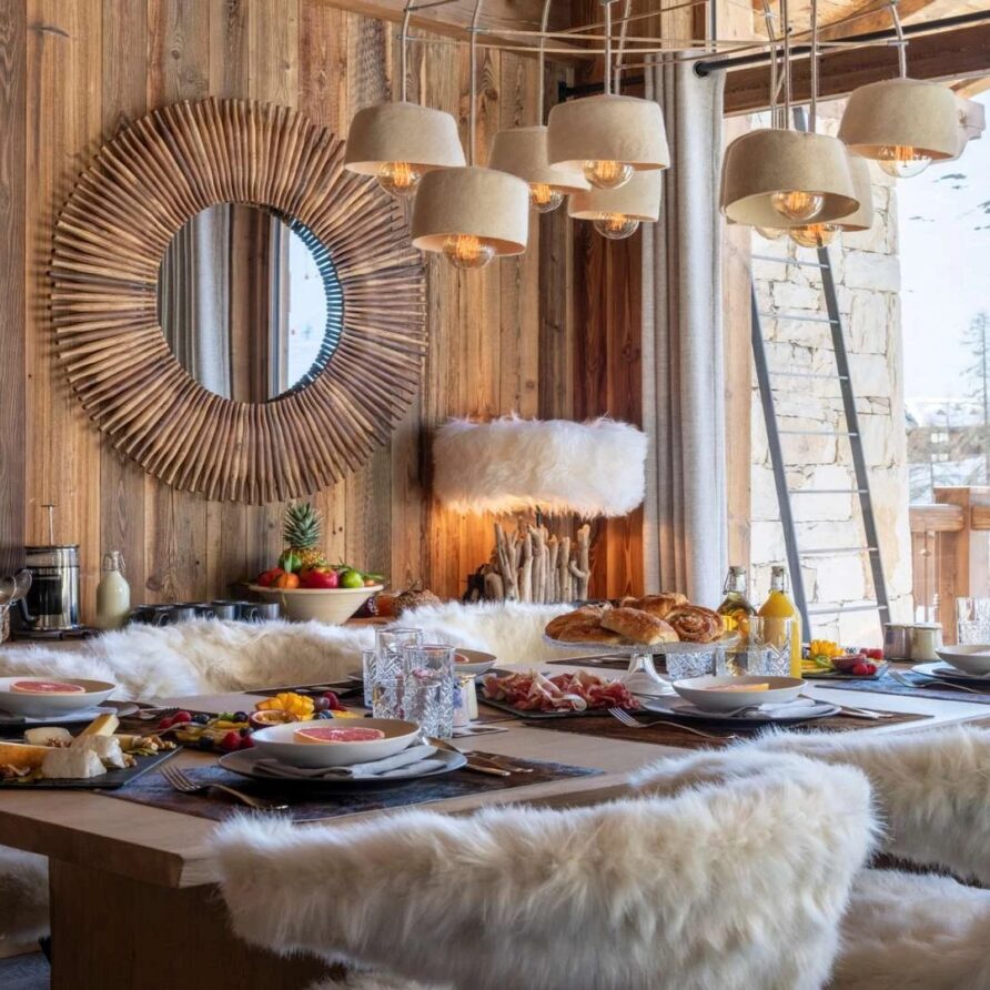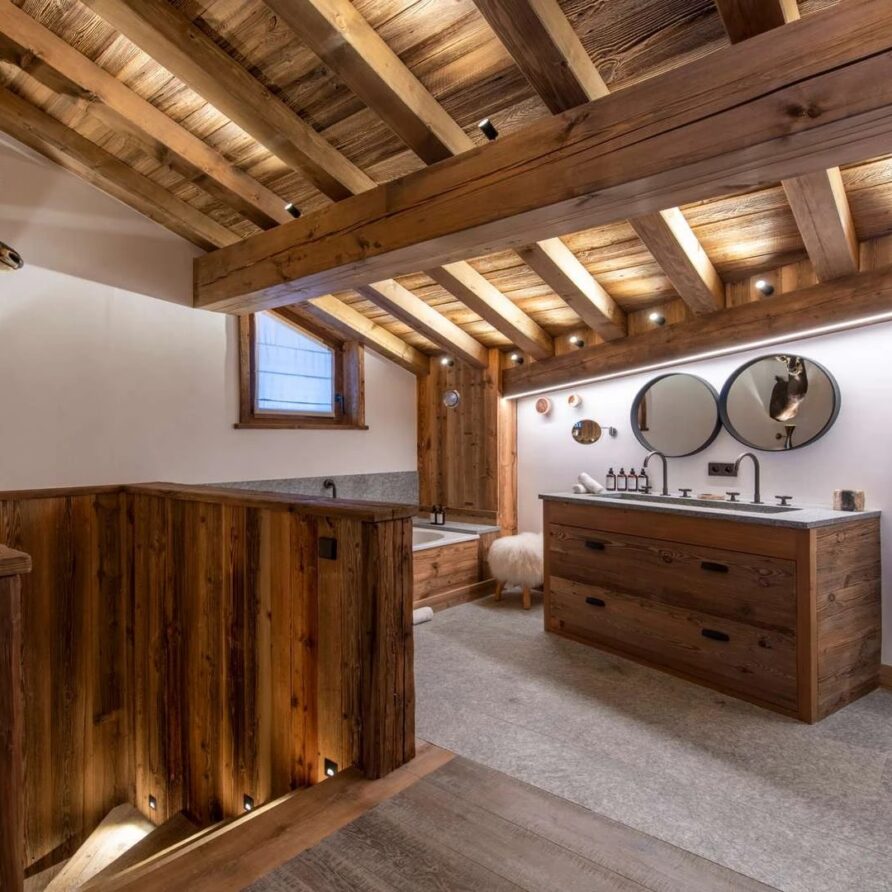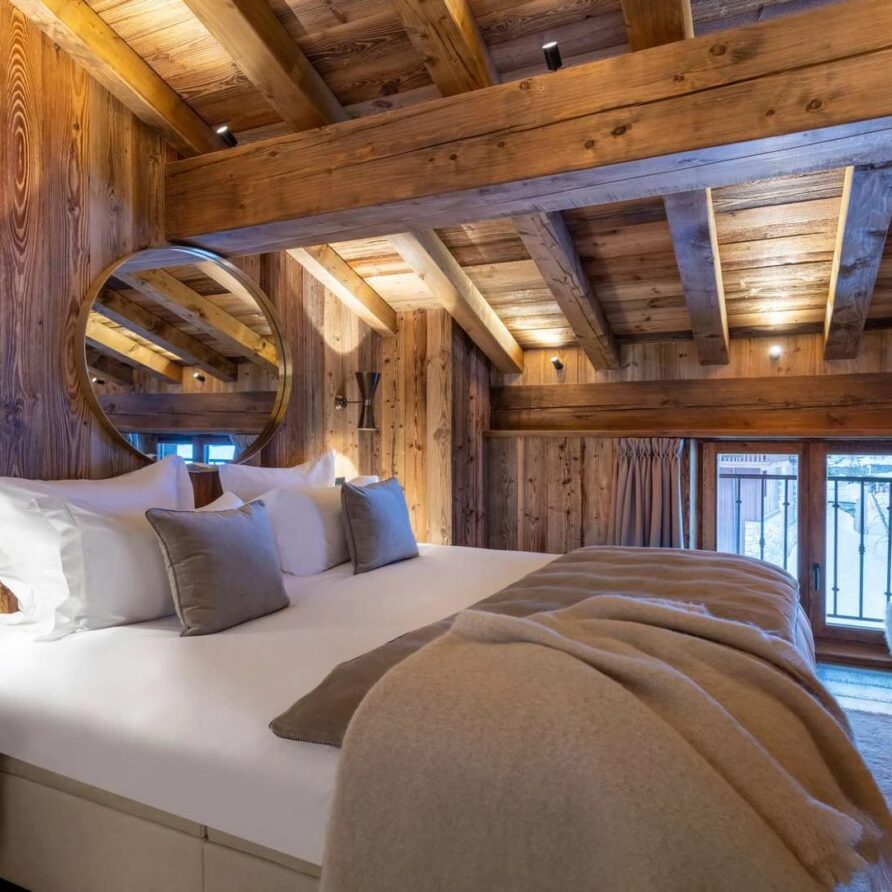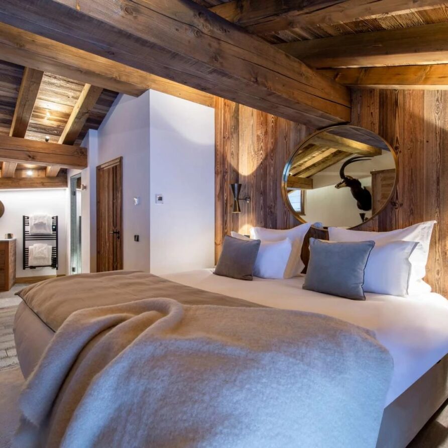 Double doors take you to the sun-drenched west-facing balcony featuring lounge chairs and a dining table, where you can drink in the breath-taking mountain views. Generous use of reclaimed wood ensures that the space feels traditional and homely, while elegant, modern decor and high-end furnishings ensure a luxurious finish. A large wood-burning fireplace forms the focal point of the living area.
