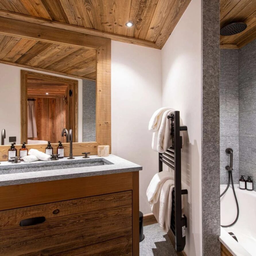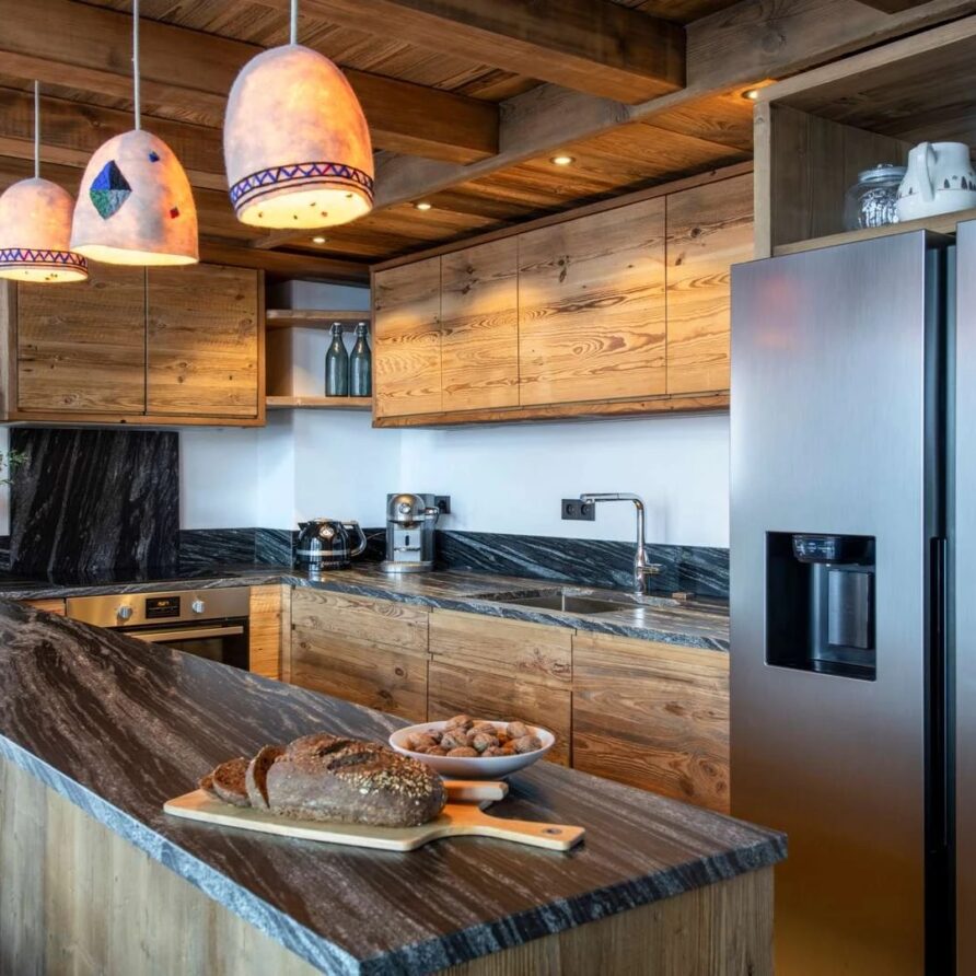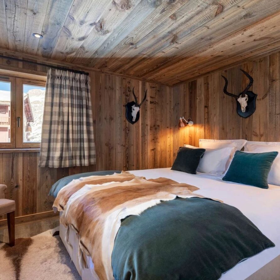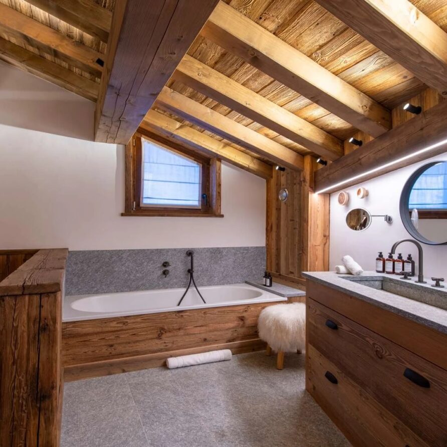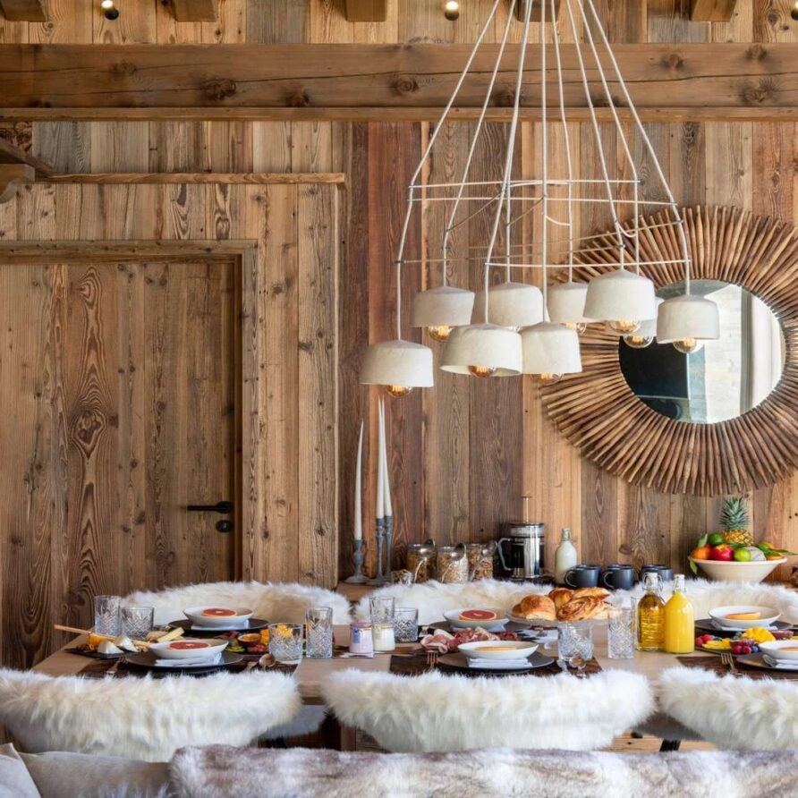 Double doors take you to the sun-drenched west-facing balcony featuring lounge chairs and a dining table, where you can drink in the breath-taking mountain views. Generous use of reclaimed wood ensures that the space feels traditional and homely, while elegant, modern decor and high-end furnishings ensure a luxurious finish. A large wood-burning fireplace forms the focal point of the living area.