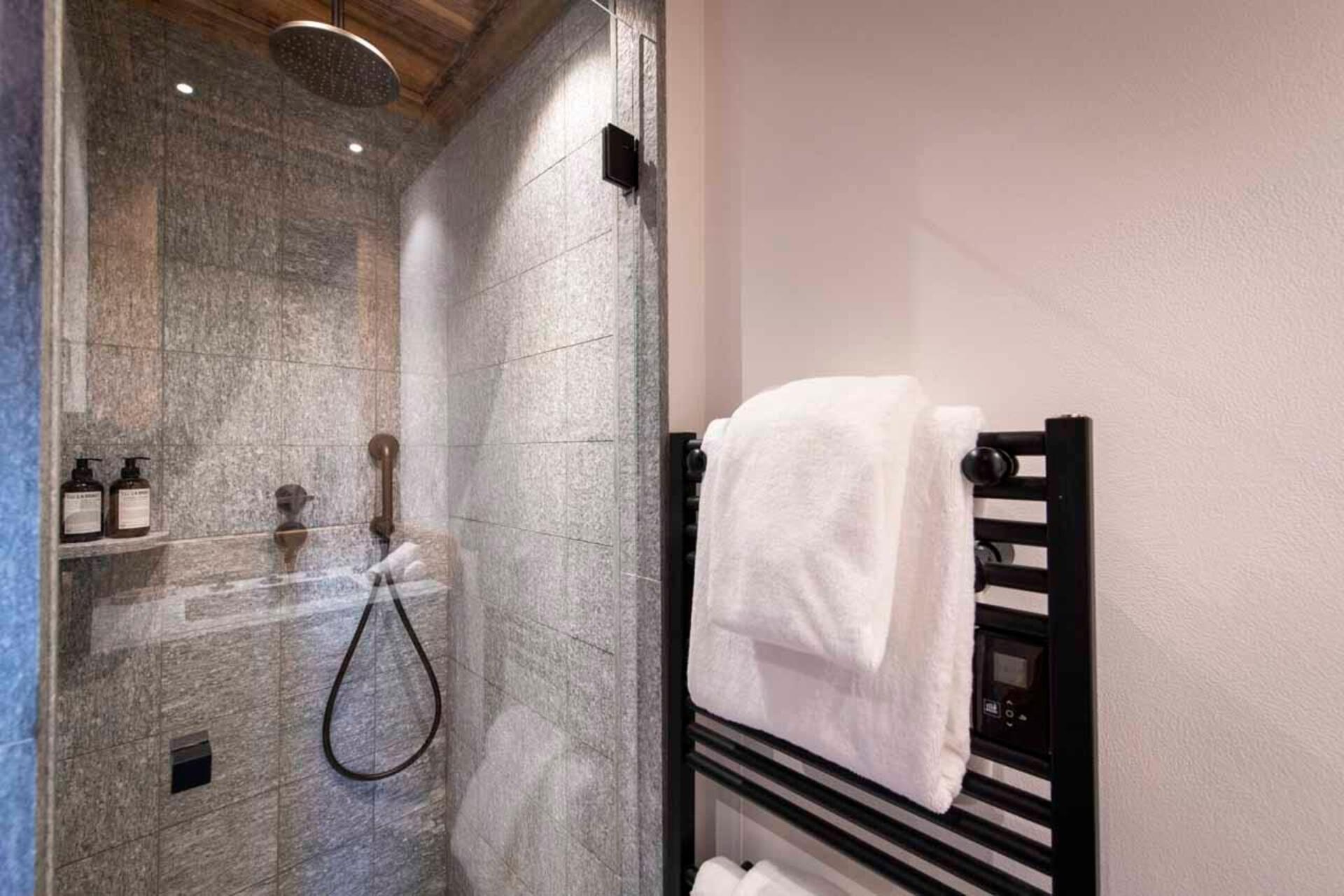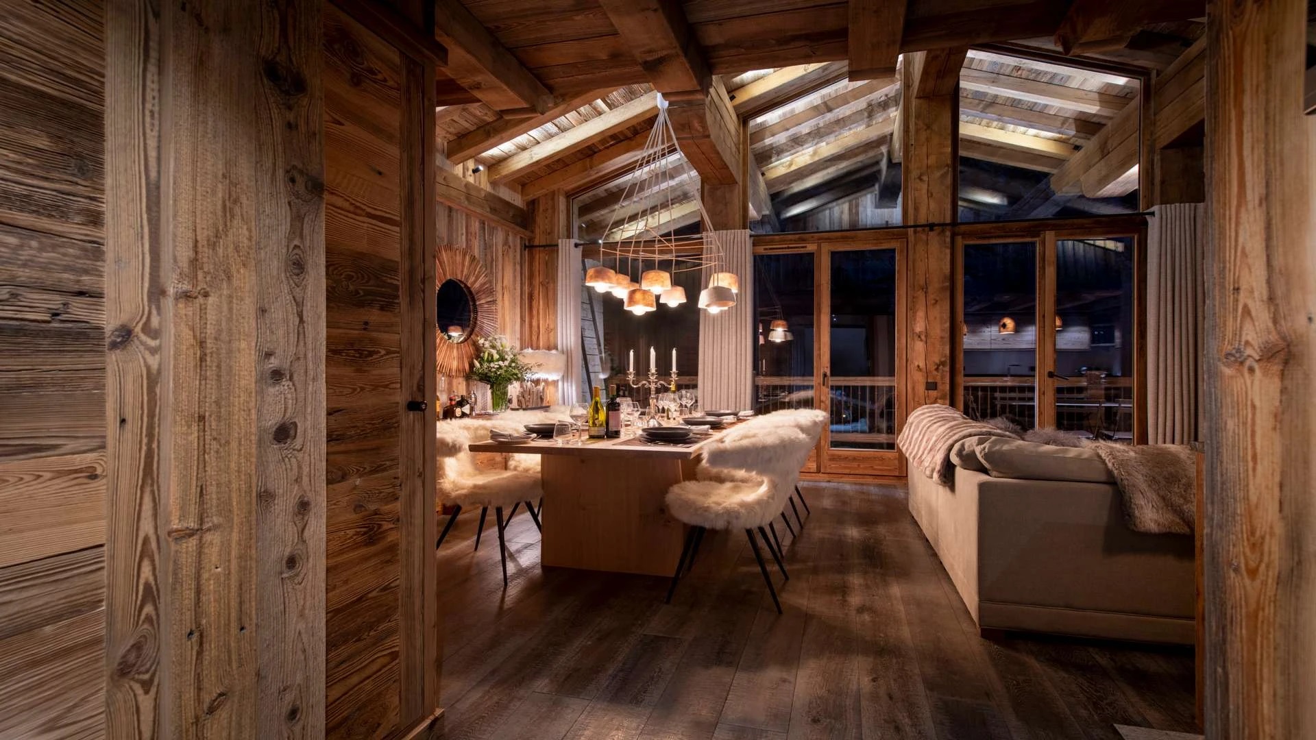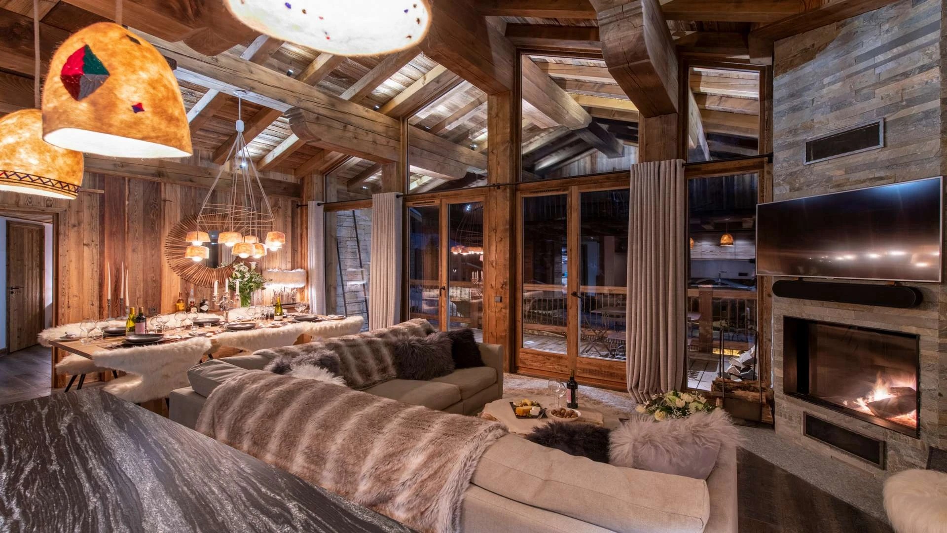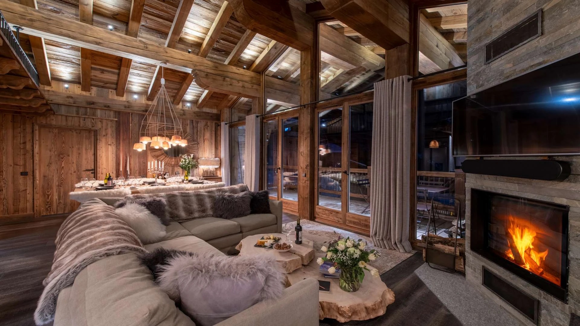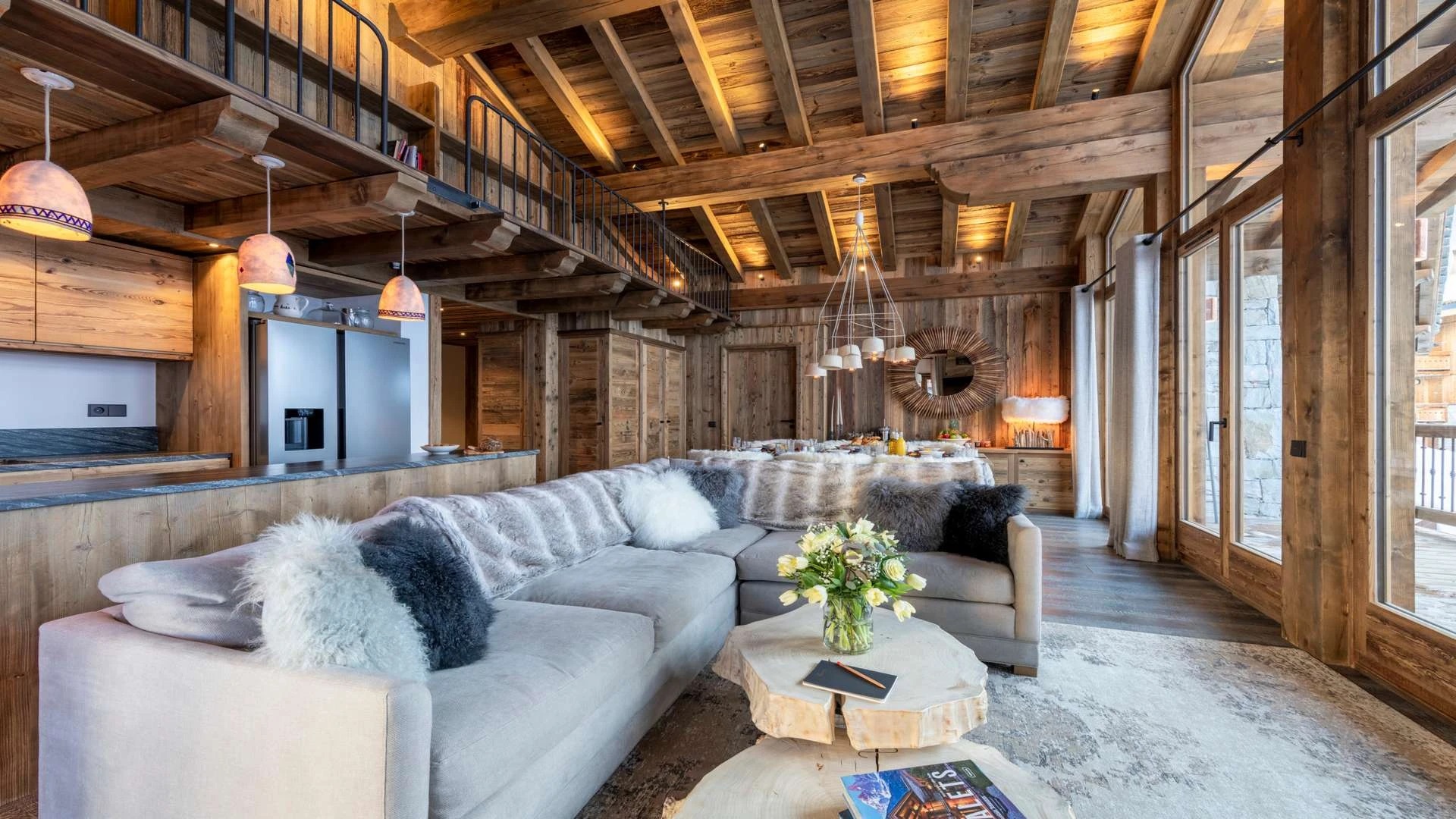 The chalet offer a private ski room equipped with boot warmers is located directly next to the main door. The living area is found on your left as you walk through the hallway. It is a beautiful space, with a sense of grandeur created by floor to ceiling windows reaching up to the dramatic double-height roof.