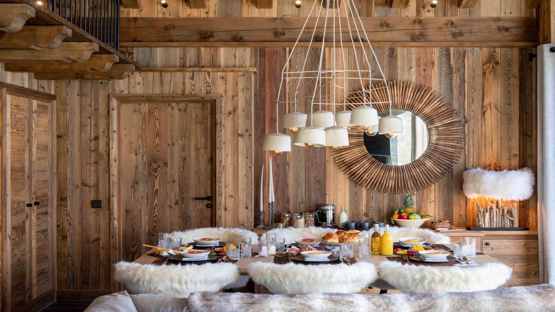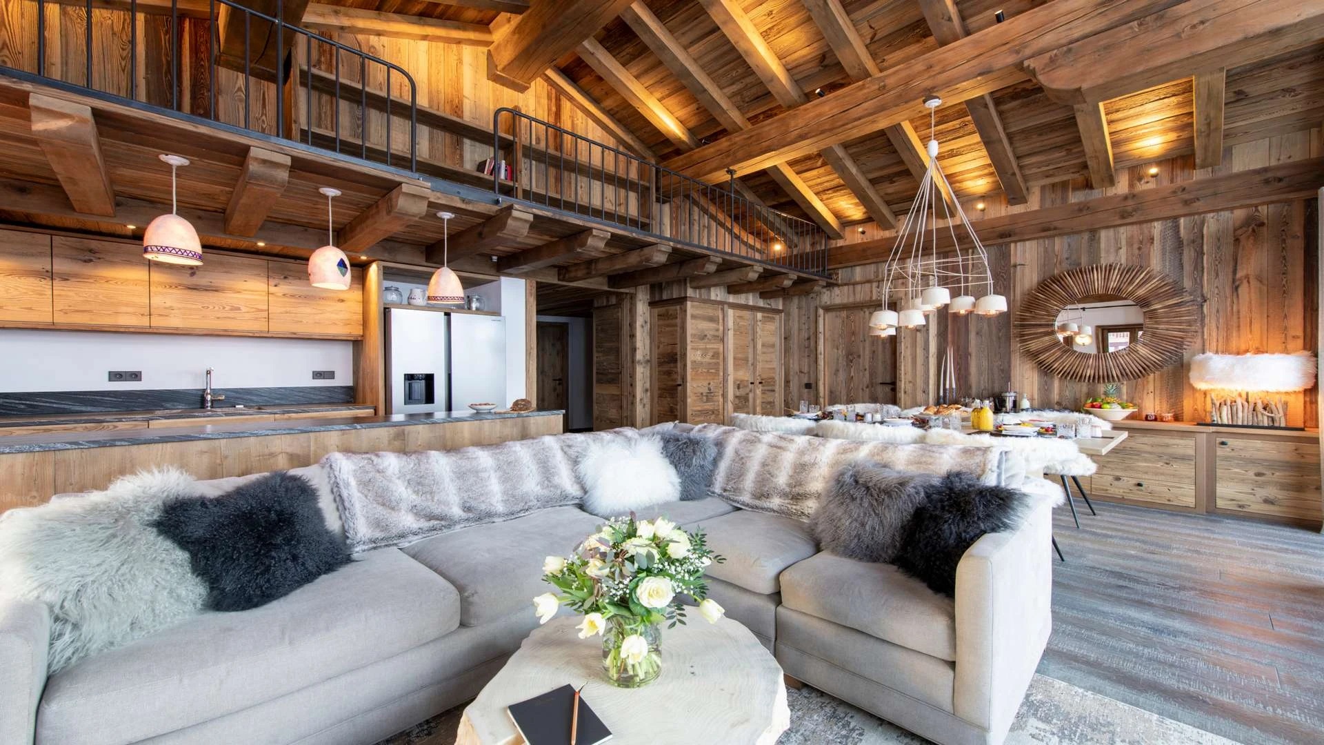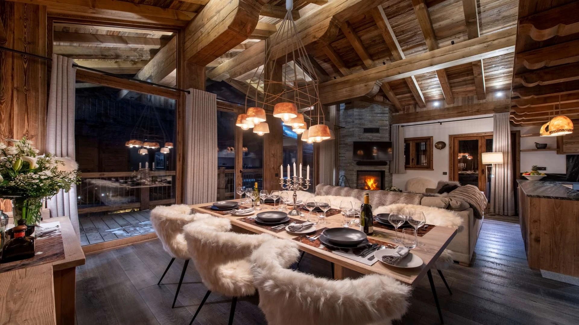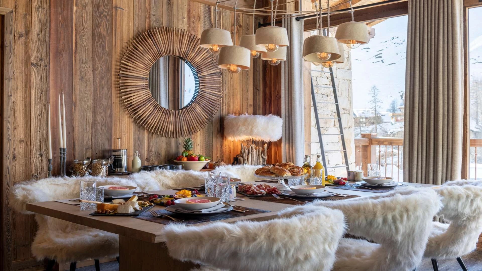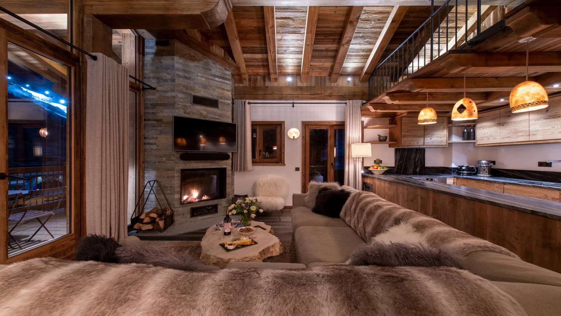 Double doors take you to the sun-drenched west-facing balcony featuring lounge chairs and a dining table, where you can drink in the breath-taking mountain views. Generous use of reclaimed wood ensures that the space feels traditional and homely, while elegant, modern decor and high-end furnishings ensure a luxurious finish. A large wood-burning fireplace forms the focal point of the living area.