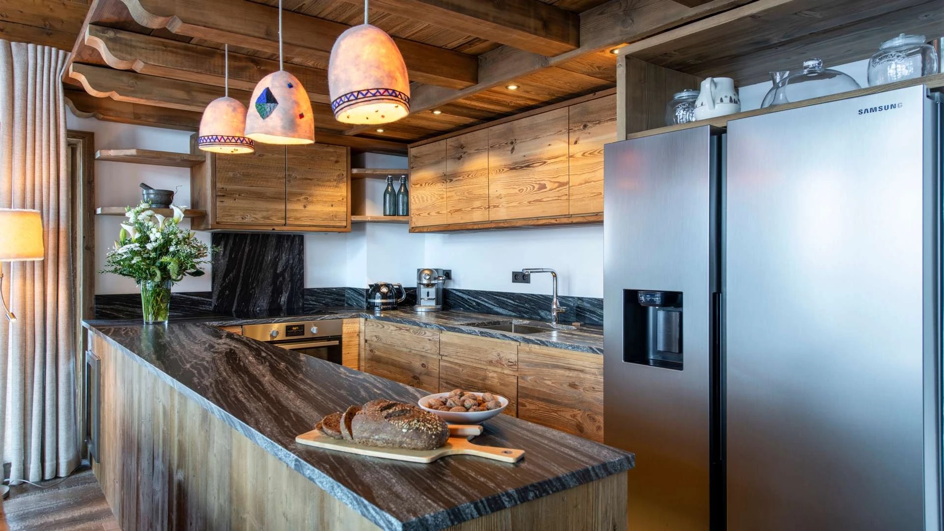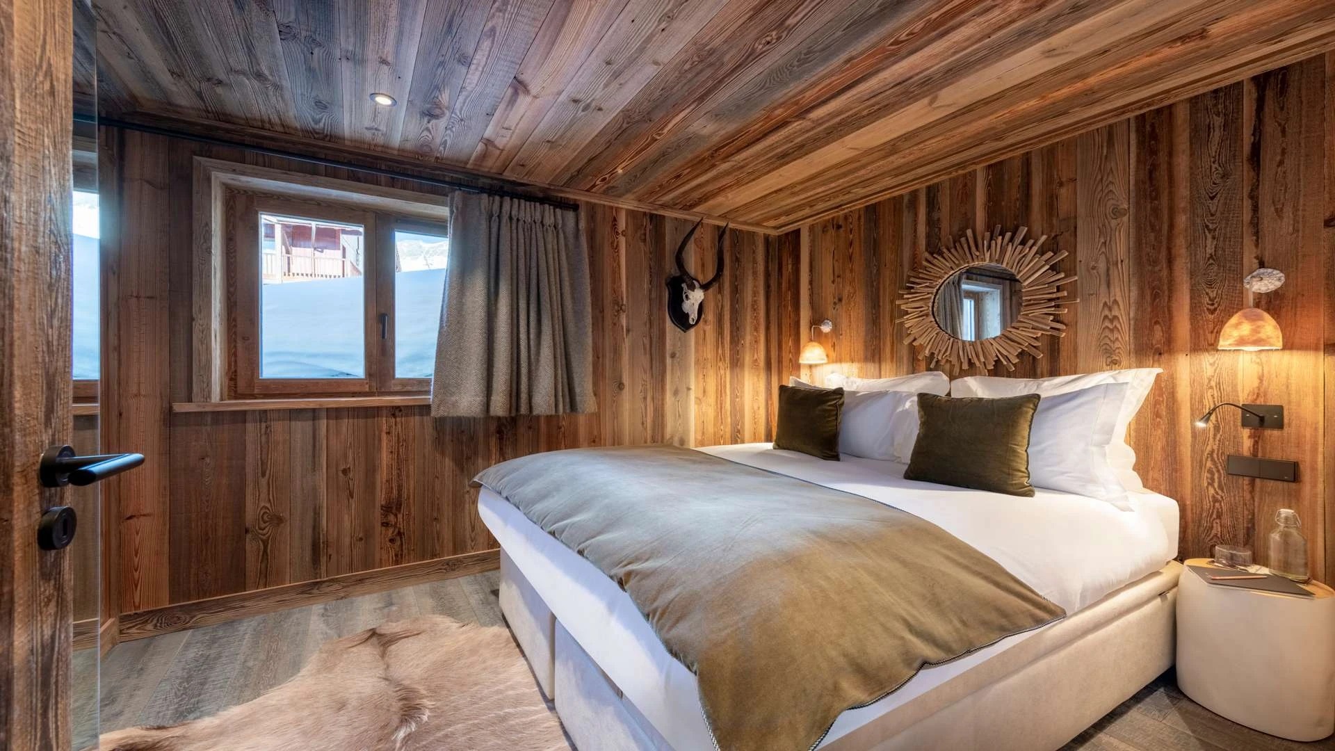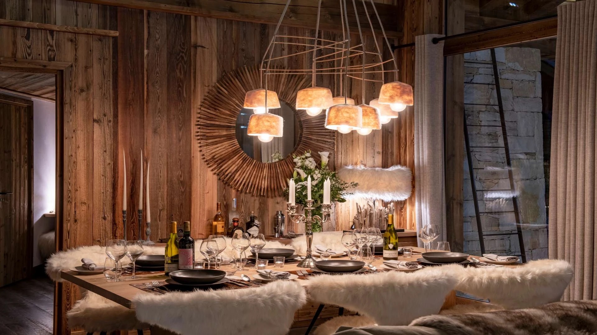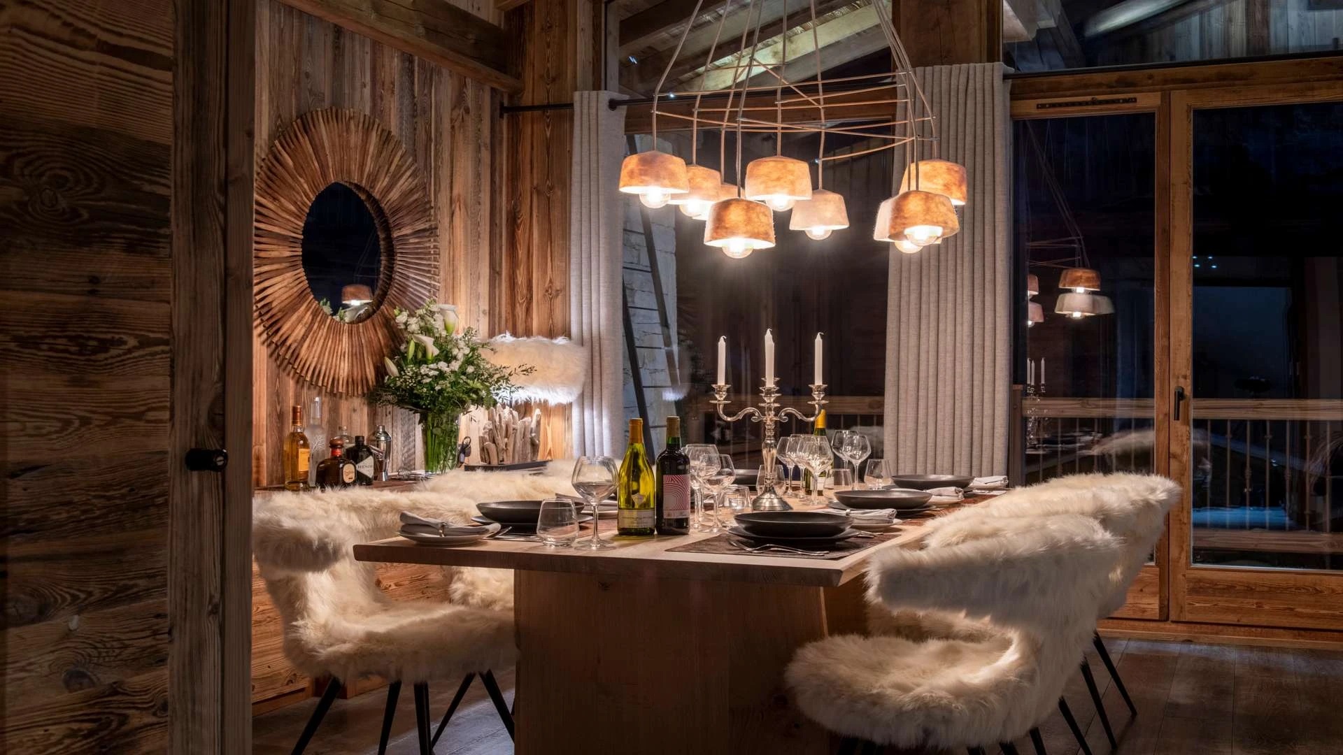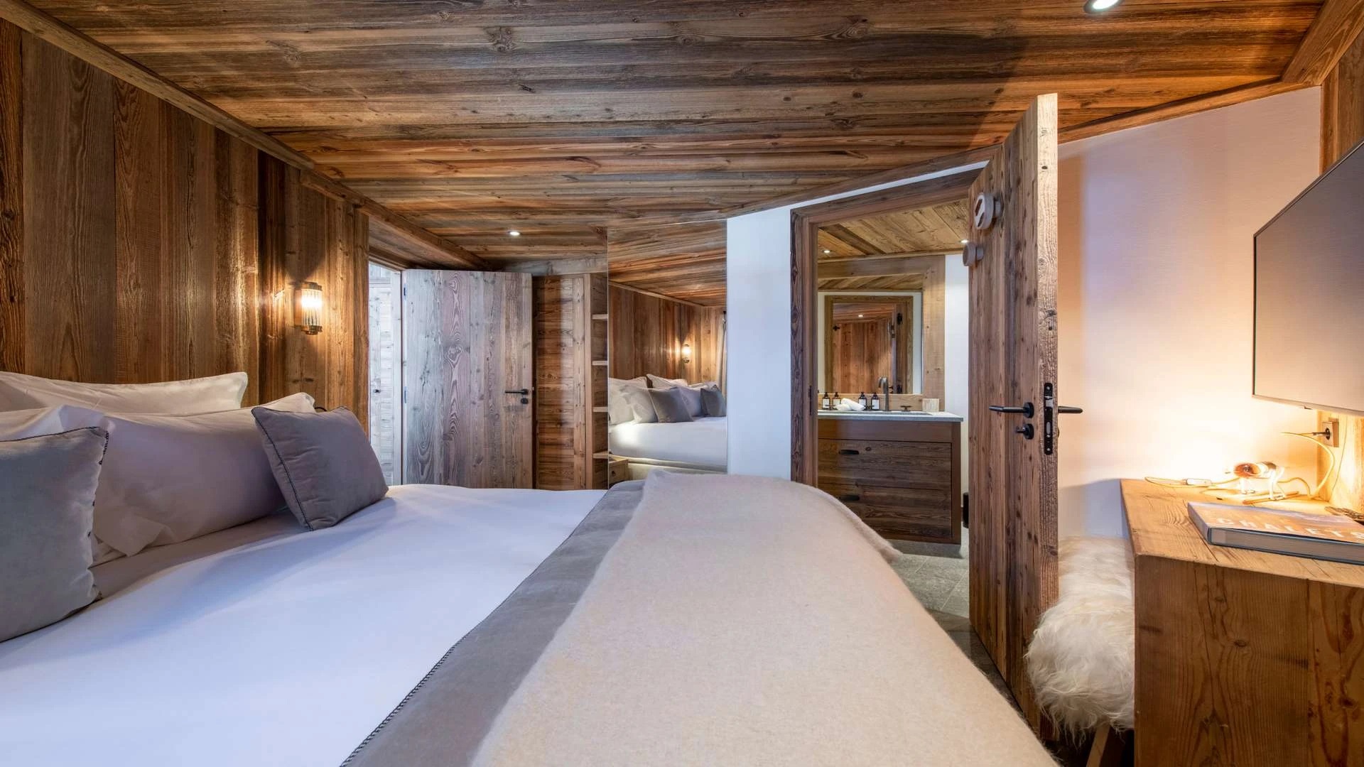 Double doors take you to the sun-drenched west-facing balcony featuring lounge chairs and a dining table, where you can drink in the breath-taking mountain views. Generous use of reclaimed wood ensures that the space feels traditional and homely, while elegant, modern decor and high-end furnishings ensure a luxurious finish. A large wood-burning fireplace forms the focal point of the living area.