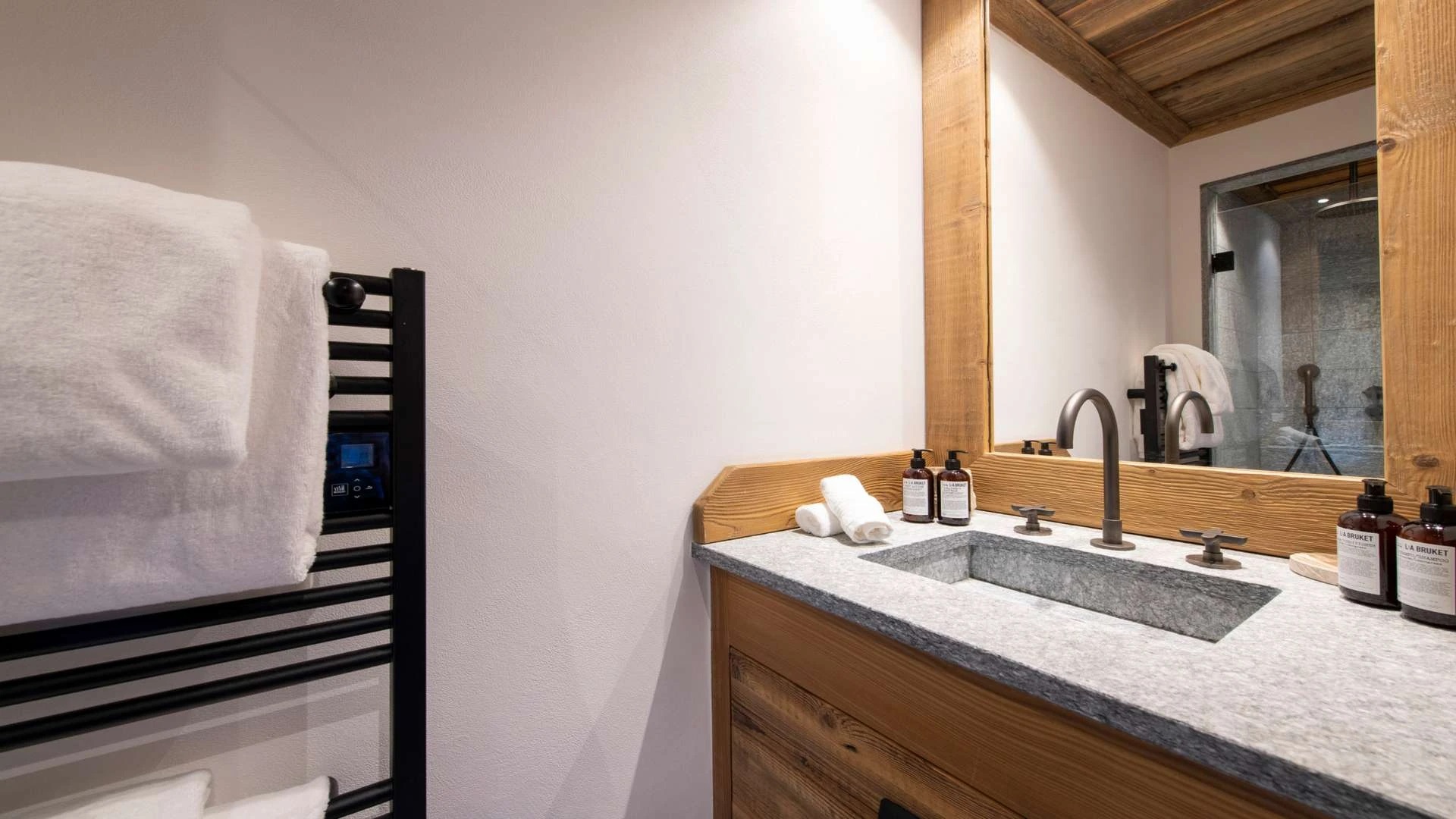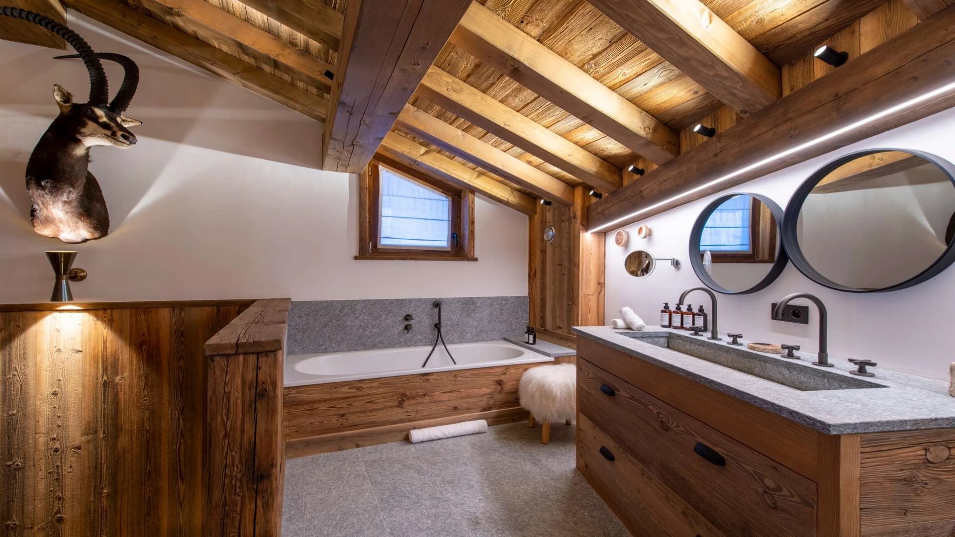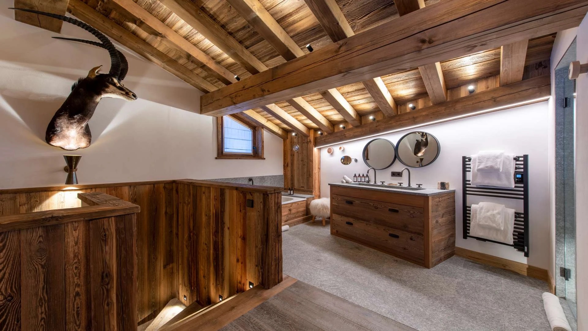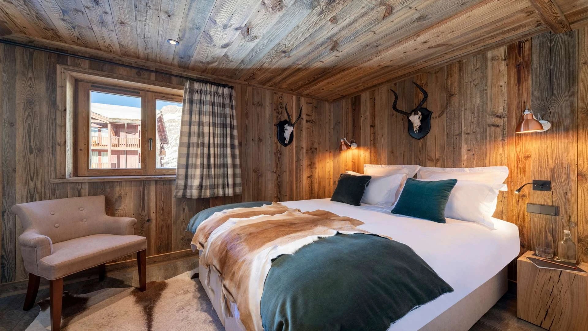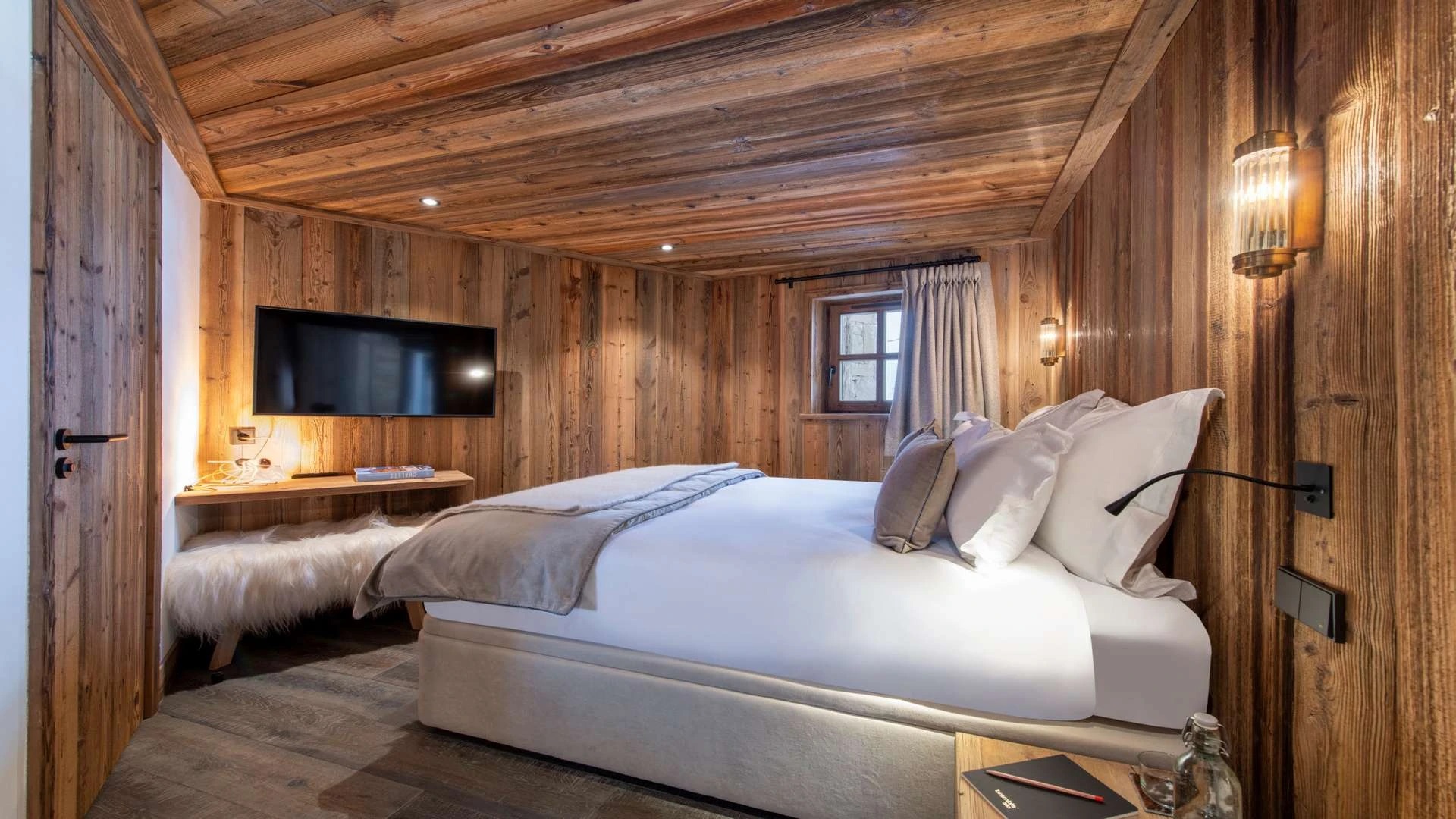 Double doors take you to the sun-drenched west-facing balcony featuring lounge chairs and a dining table, where you can drink in the breath-taking mountain views. Generous use of reclaimed wood ensures that the space feels traditional and homely, while elegant, modern decor and high-end furnishings ensure a luxurious finish. A large wood-burning fireplace forms the focal point of the living area.
