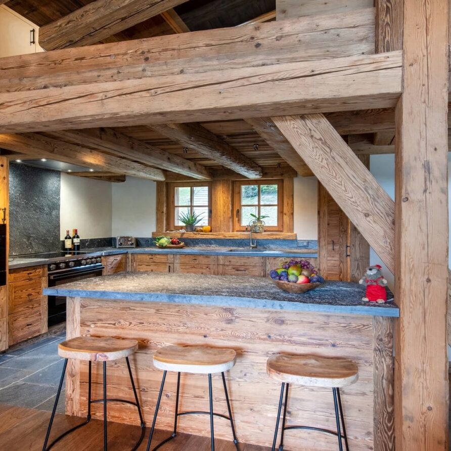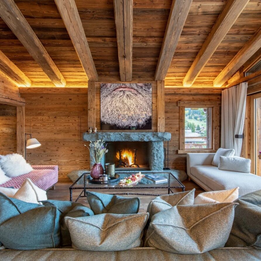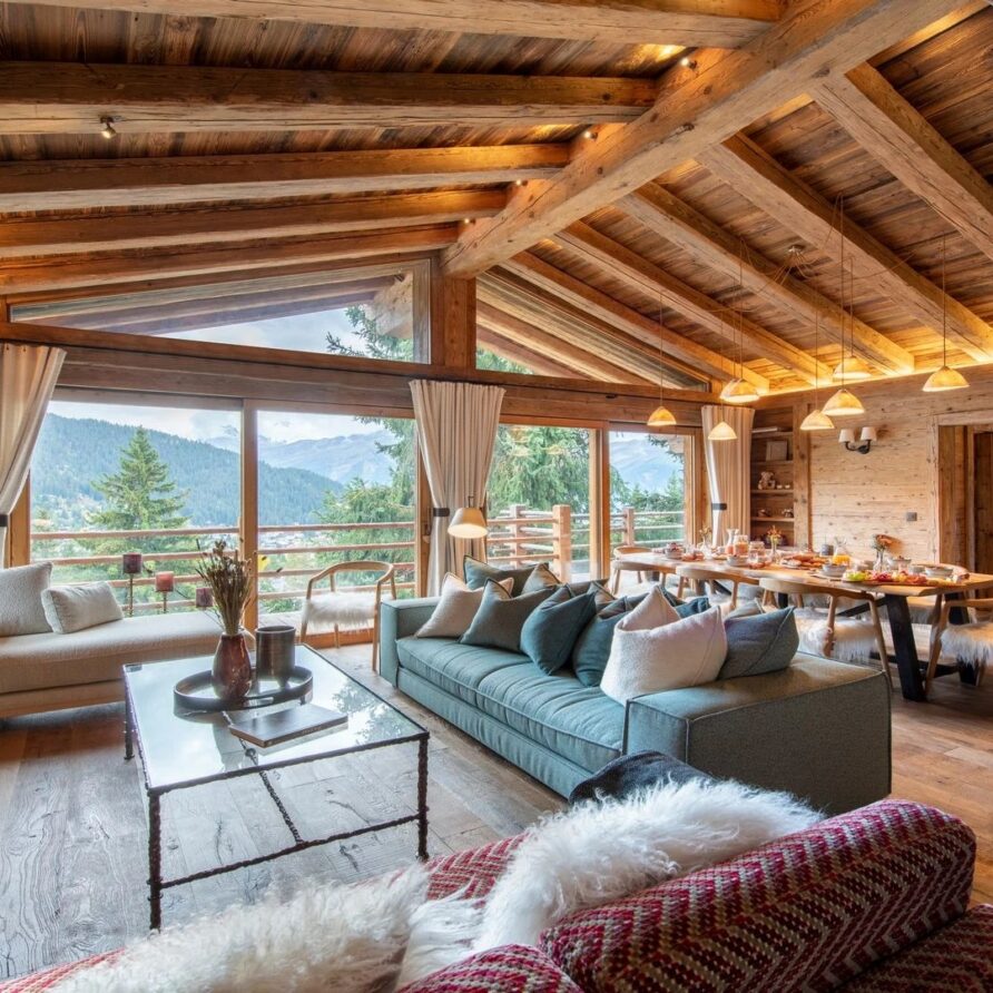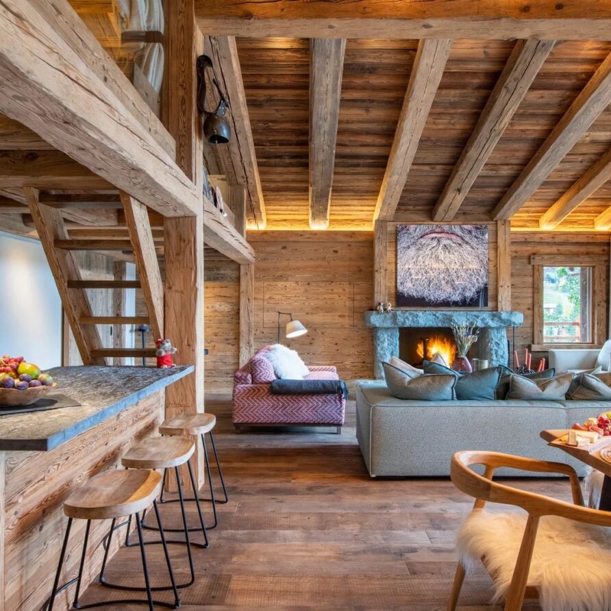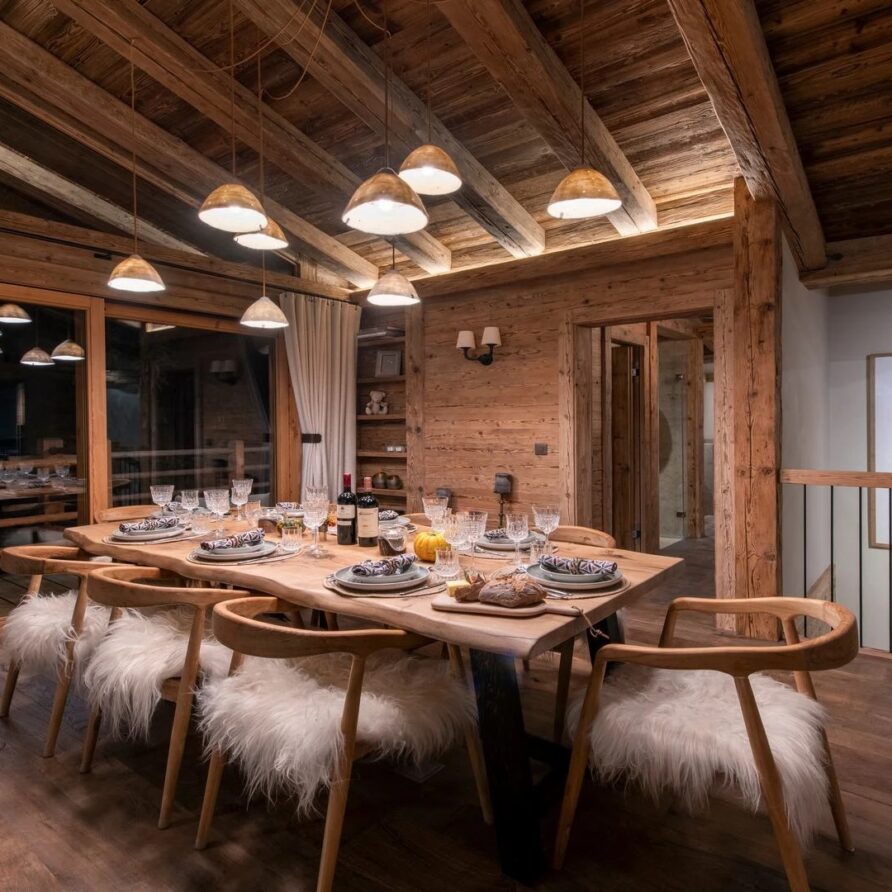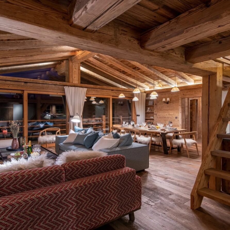 The welcoming living space on the top floor is open-plan and features a double-height vaulted ceiling, making for a wonderful airy feel, with a cozy chalet atmosphere thanks to the exposed timber throughout. The stylish interior design includes a dining table seating eight with lovely scandinavian style wishbone chairs, and plush sofas arranged around the rustic stone fireplace. The staggered pendant lampshades add a warm ambience to the dining area, perfect for memorable dinners together, with a convenient guest WC/shower room on this level making it ideal for entertaining.
