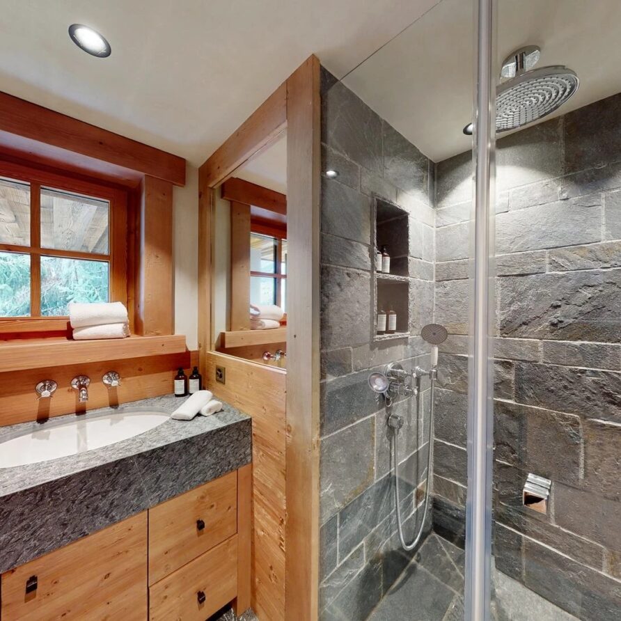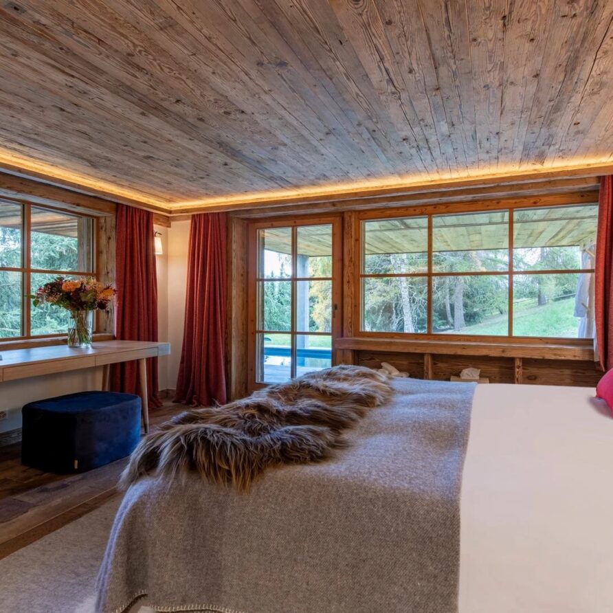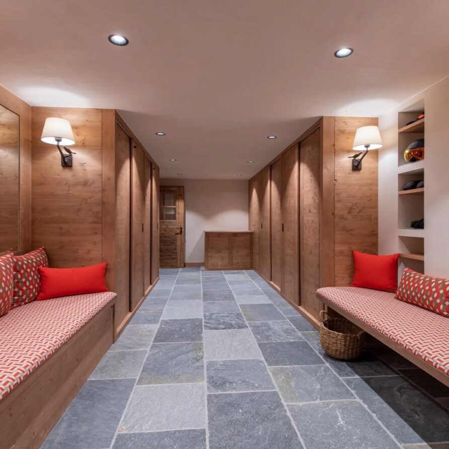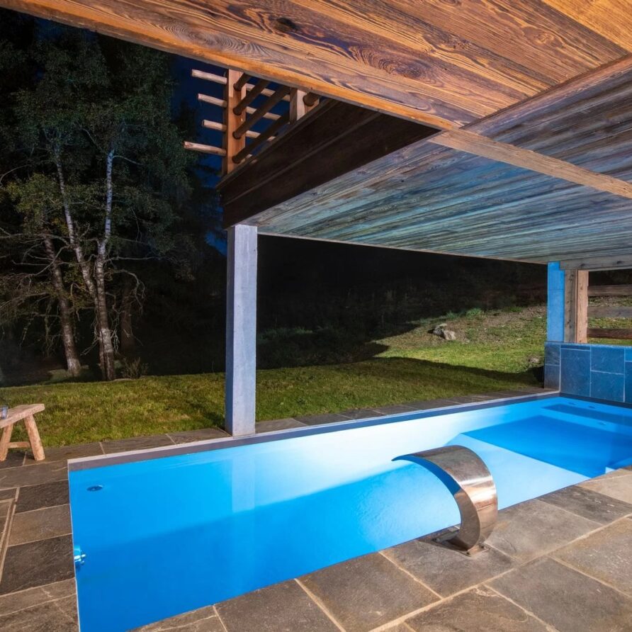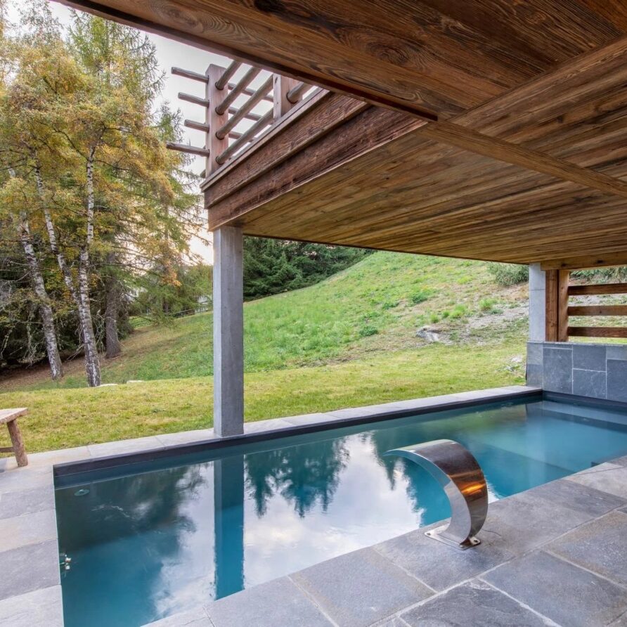 Outside on the ground level, is the fantastic heated outdoor swimming pool. Under partial cover yet open to the elements on all sides, it is magical to take a dip here as the snow falls all around and the steam rises into the chilly air. With trees all around this is a private and peaceful space to unwind in after active ski days. There is also a ski room on this floor, with plenty of storage space.