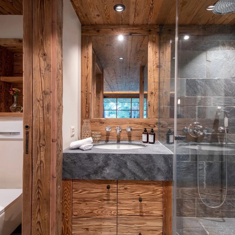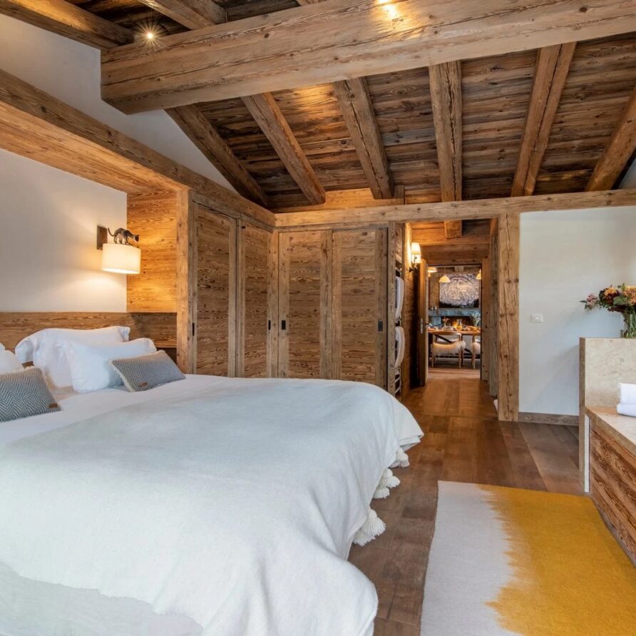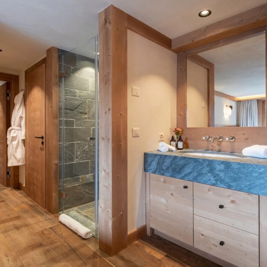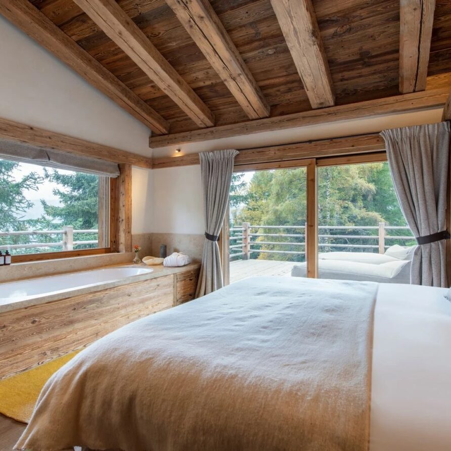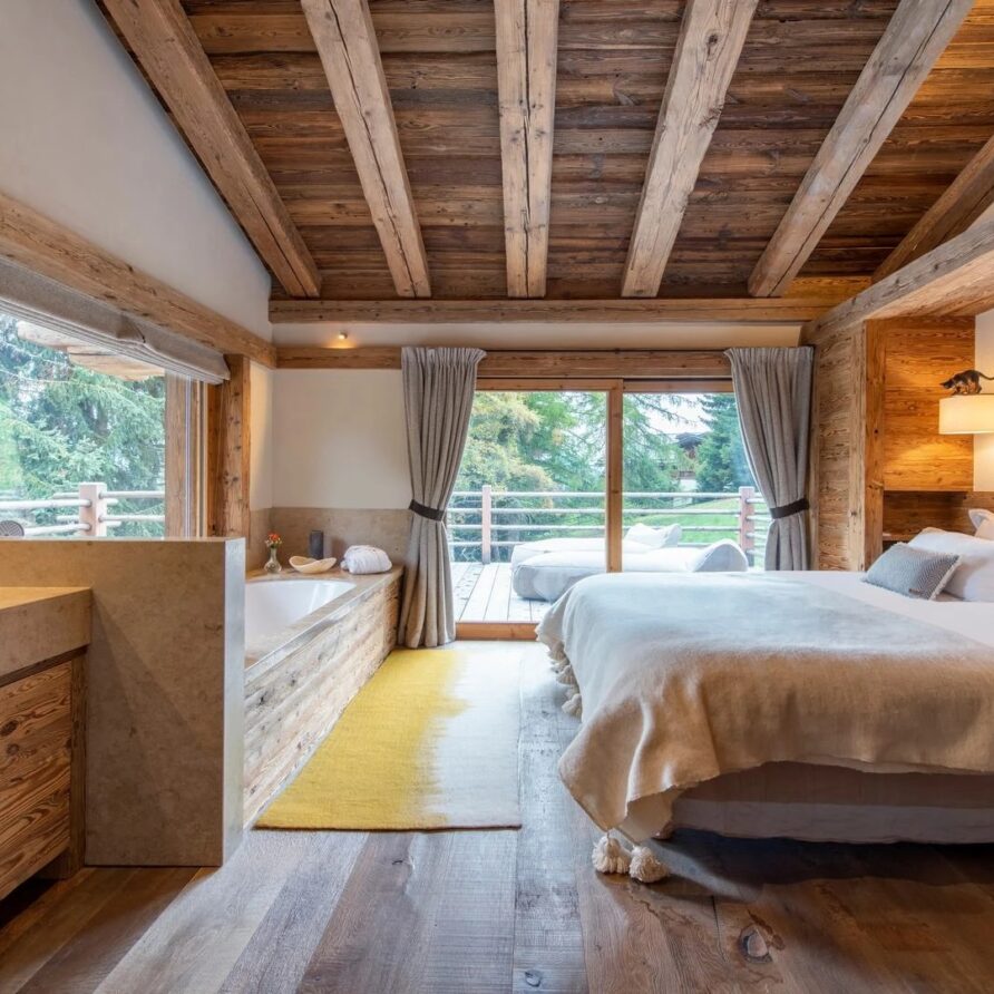 Also on the this floor is the gorgeous master suite, complete with a beautiful bathtub surrounded by windows out to the mountains, a separate shower, WC and shared balcony. Finished in cool neutral tones and wood, it is the perfect calming space to unwind in.