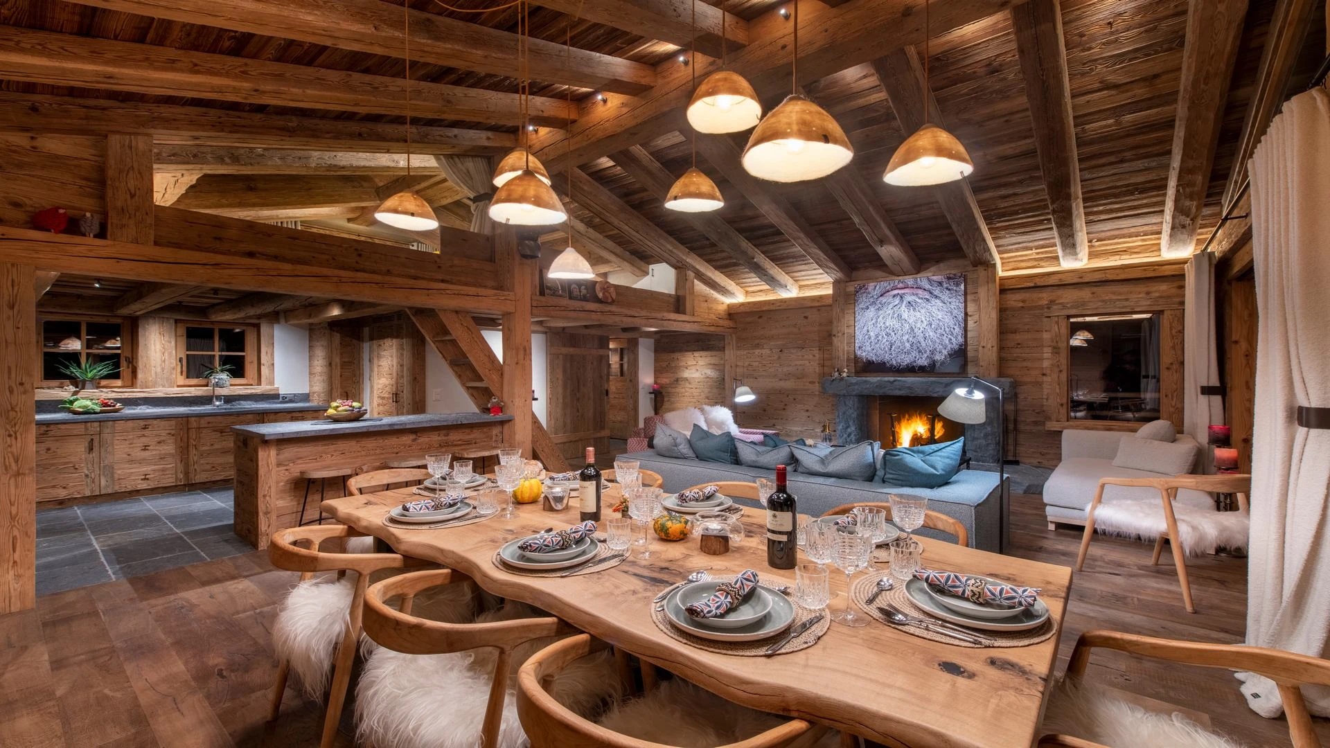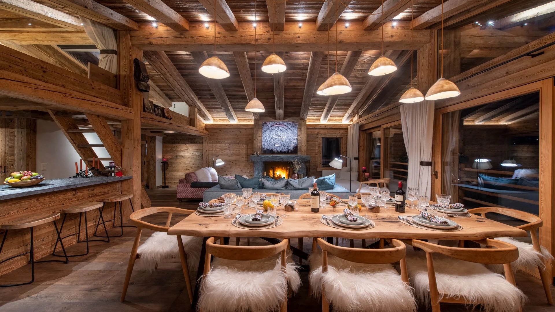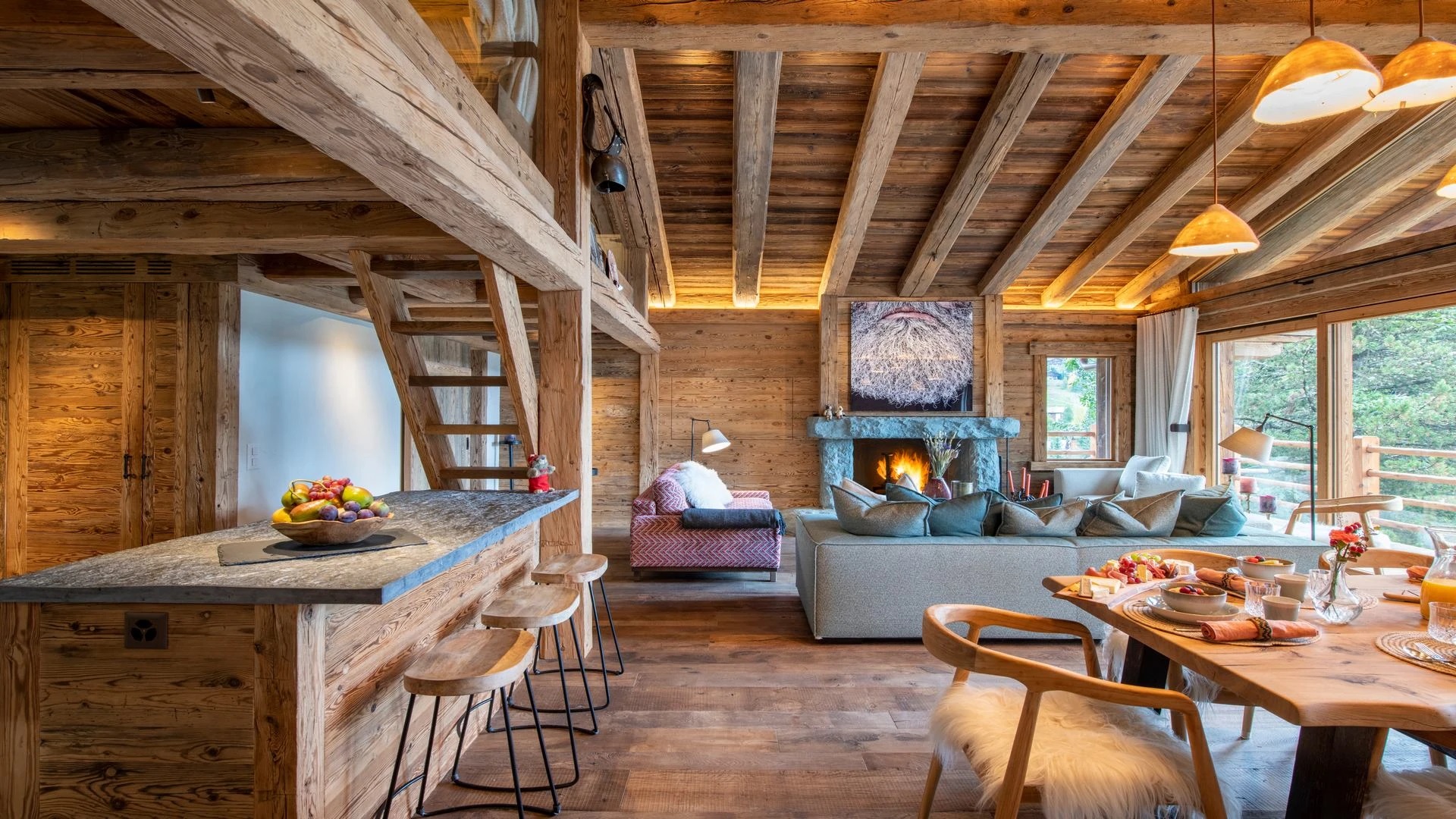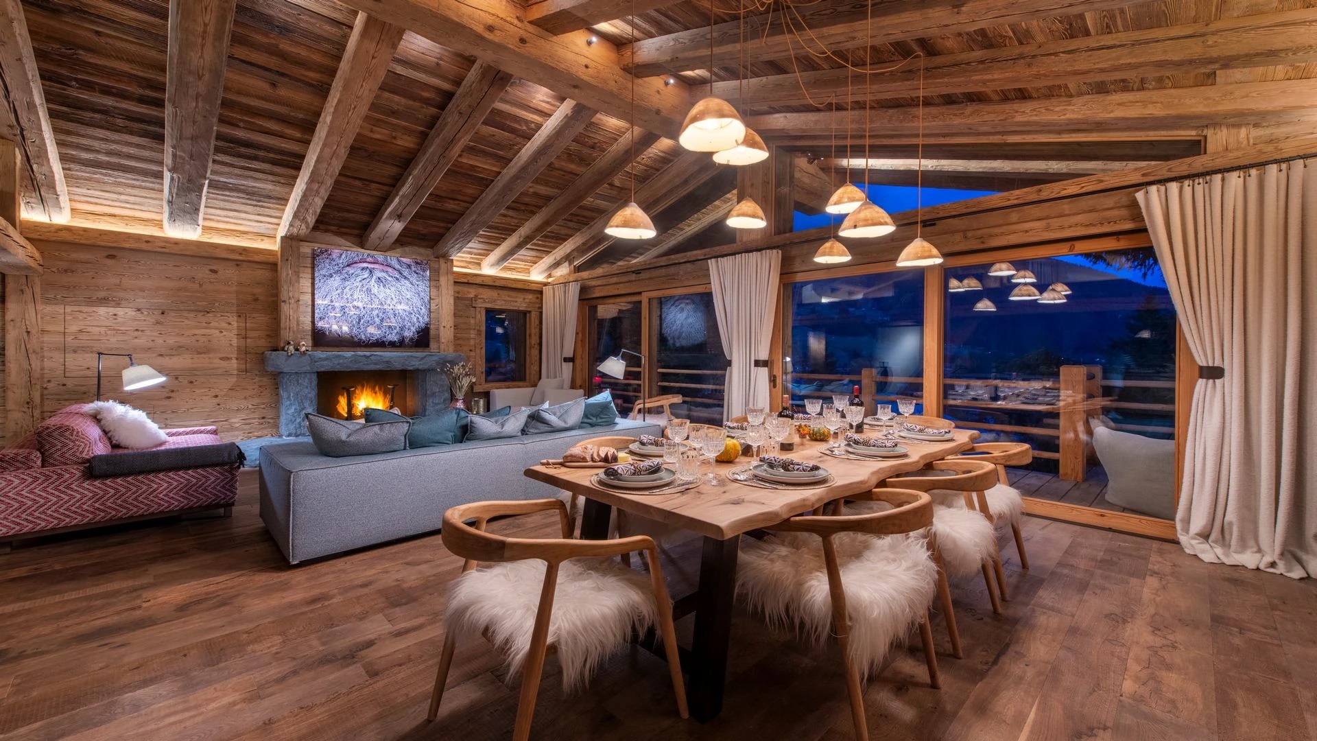 The welcoming living space on the top floor is open-plan and features a double-height vaulted ceiling, making for a wonderful airy feel, with a cozy chalet atmosphere thanks to the exposed timber throughout. The stylish interior design includes a dining table seating eight with lovely scandinavian style wishbone chairs, and plush sofas arranged around the rustic stone fireplace. The staggered pendant lampshades add a warm ambience to the dining area, perfect for memorable dinners together, with a convenient guest WC/shower room on this level making it ideal for entertaining.
