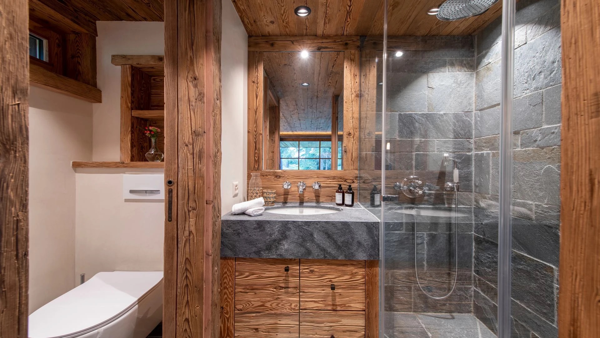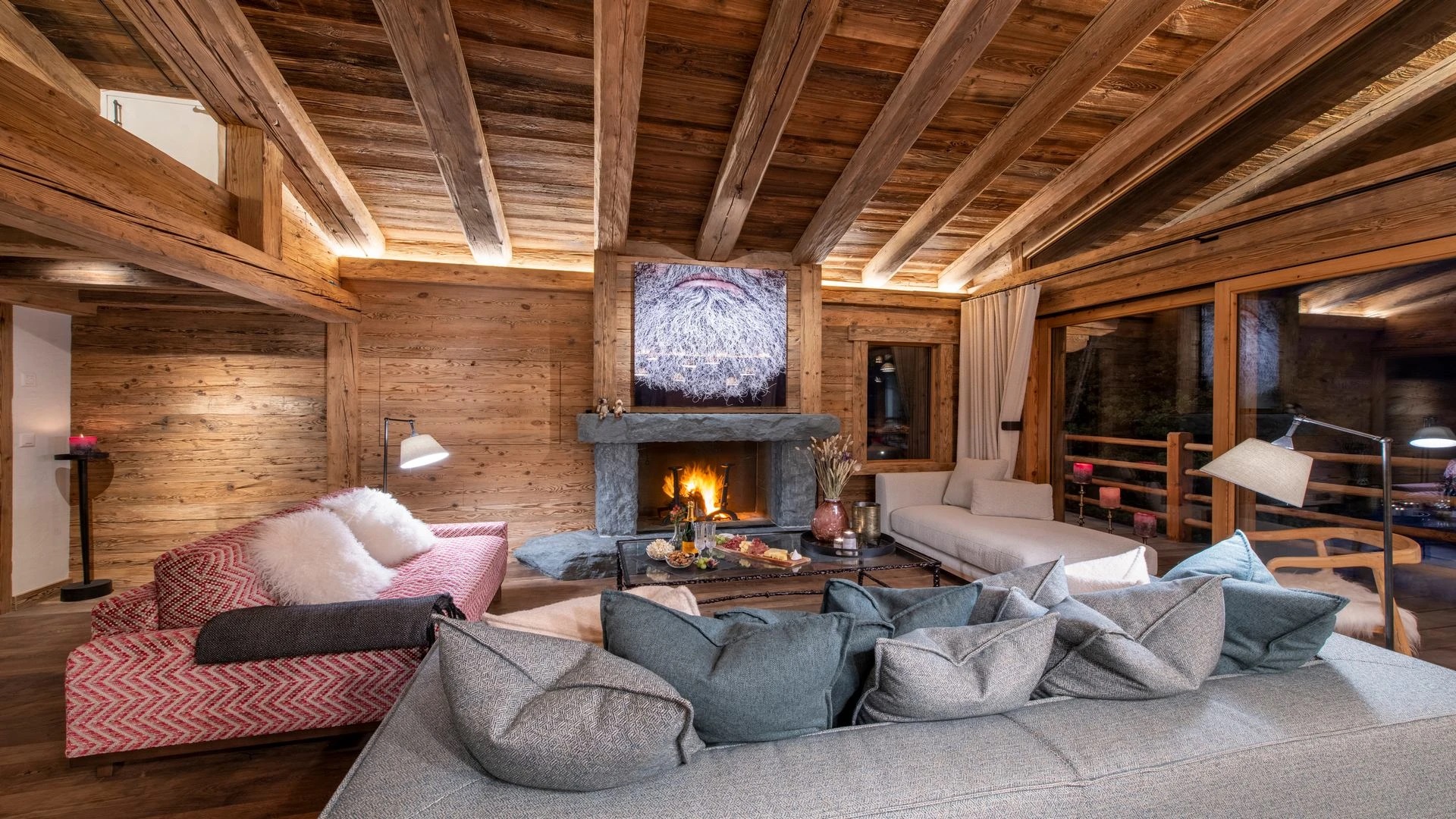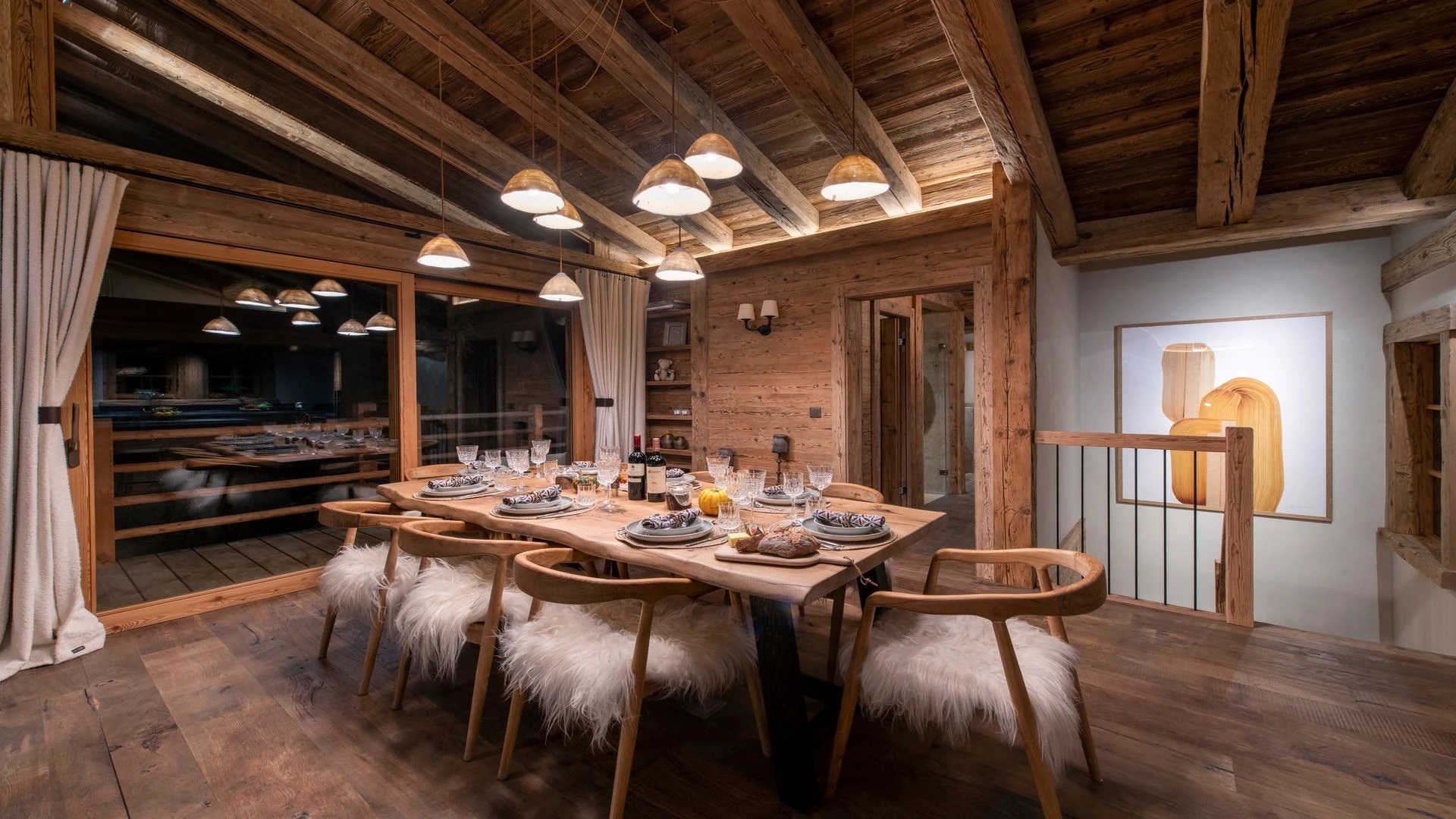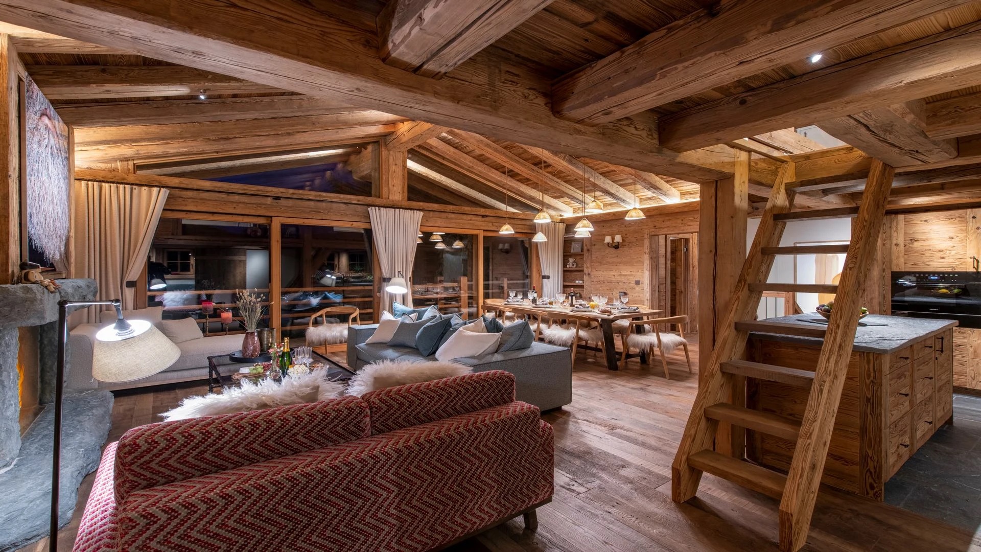 The welcoming living space on the top floor is open-plan and features a double-height vaulted ceiling, making for a wonderful airy feel, with a cozy chalet atmosphere thanks to the exposed timber throughout. The stylish interior design includes a dining table seating eight with lovely scandinavian style wishbone chairs, and plush sofas arranged around the rustic stone fireplace. The staggered pendant lampshades add a warm ambience to the dining area, perfect for memorable dinners together, with a convenient guest WC/shower room on this level making it ideal for entertaining.