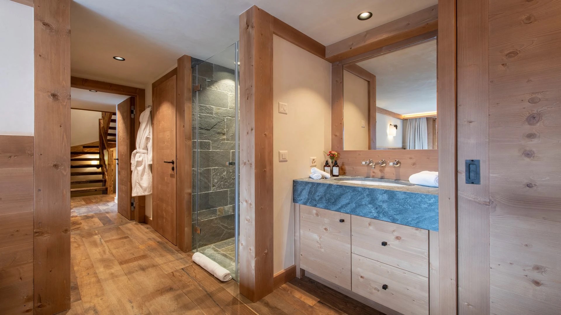 Also on the this floor is the gorgeous master suite, complete with a beautiful bathtub surrounded by windows out to the mountains, a separate shower, WC and shared balcony. Finished in cool neutral tones and wood, it is the perfect calming space to unwind in.