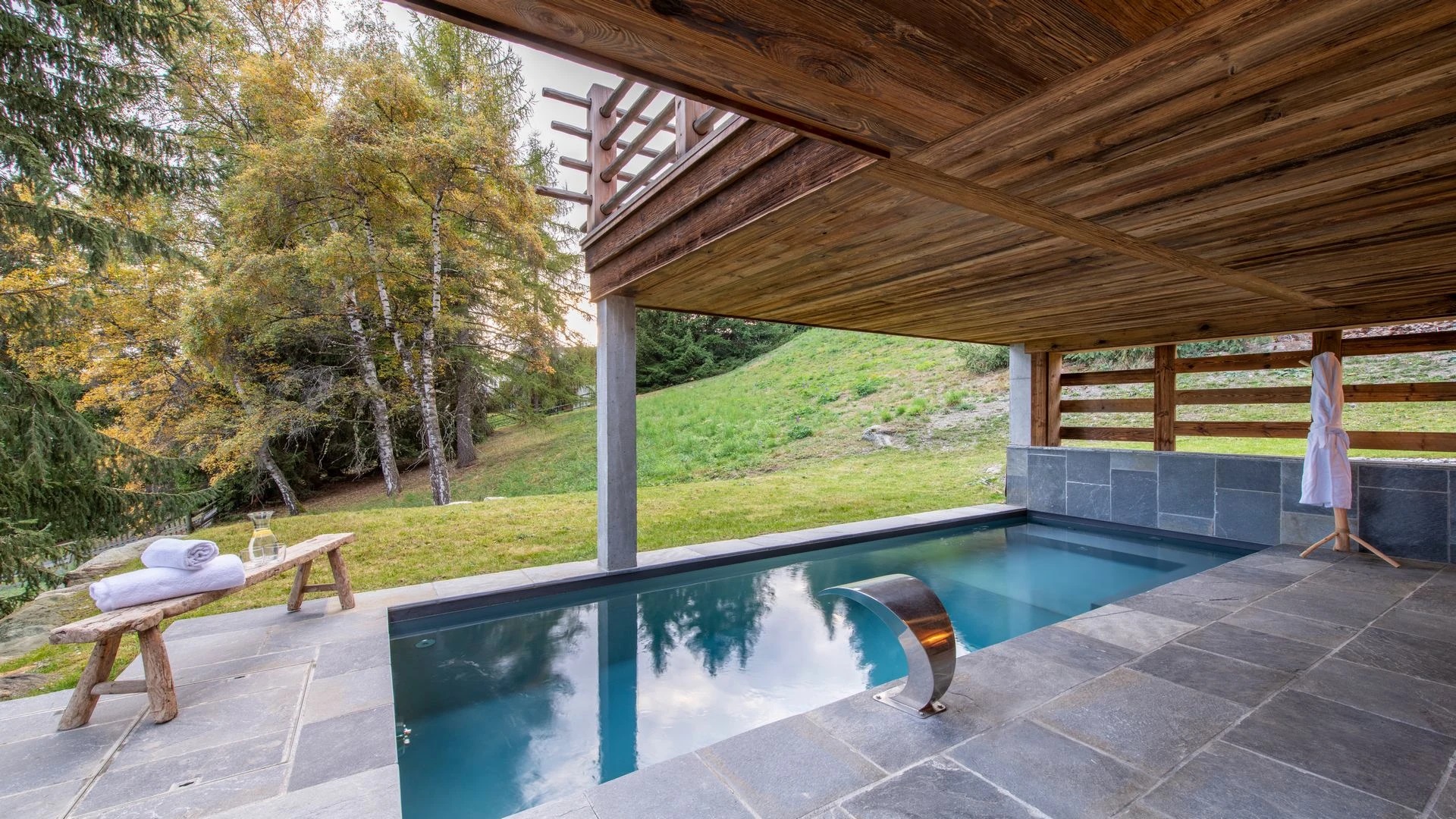 Outside on the ground level, is the fantastic heated outdoor swimming pool. Under partial cover yet open to the elements on all sides, it is magical to take a dip here as the snow falls all around and the steam rises into the chilly air. With trees all around this is a private and peaceful space to unwind in after active ski days. There is also a ski room on this floor, with plenty of storage space.