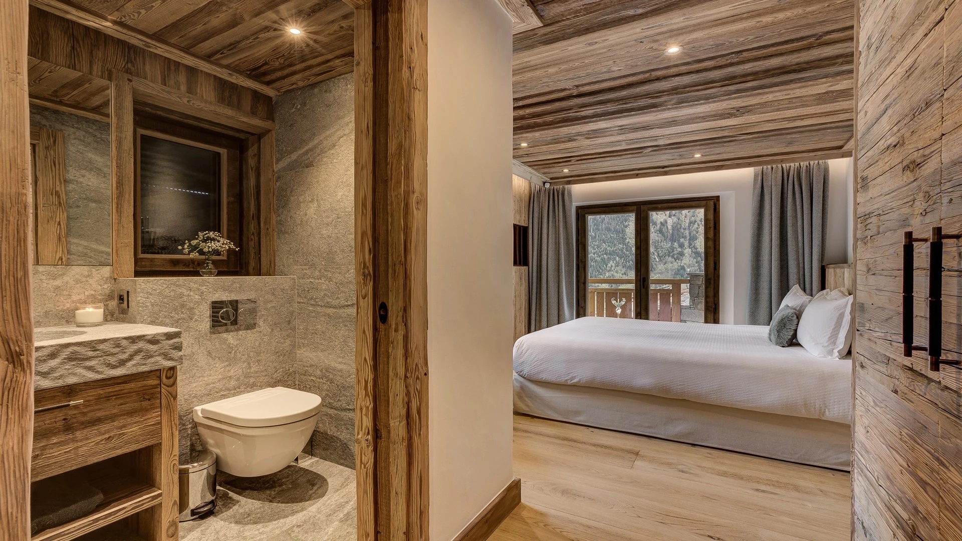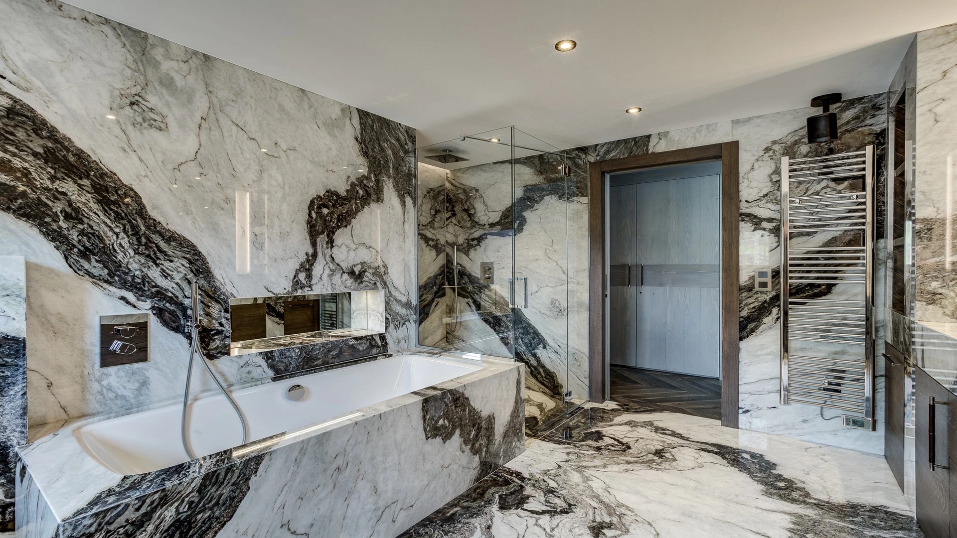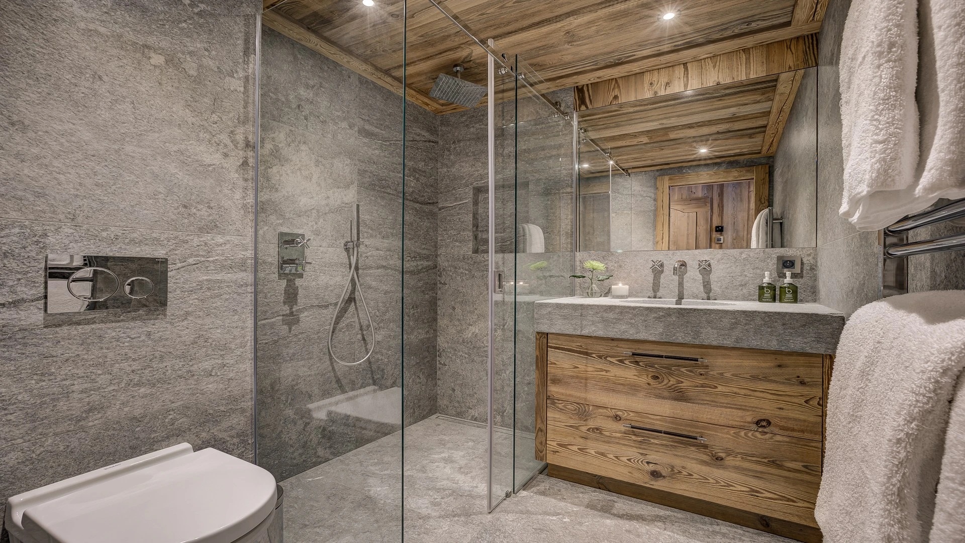 Sleeping quarters span both floors, offering a haven of tranquillity. The master Suite boasts a lavish marble en-suite bathroom, while four double bedrooms each feature en-suite facilities, exuding alpine charm with a modern twist. A children’s bunk bedroom accommodating up to six guests with its cozy ambiance and en-suite convenience.
