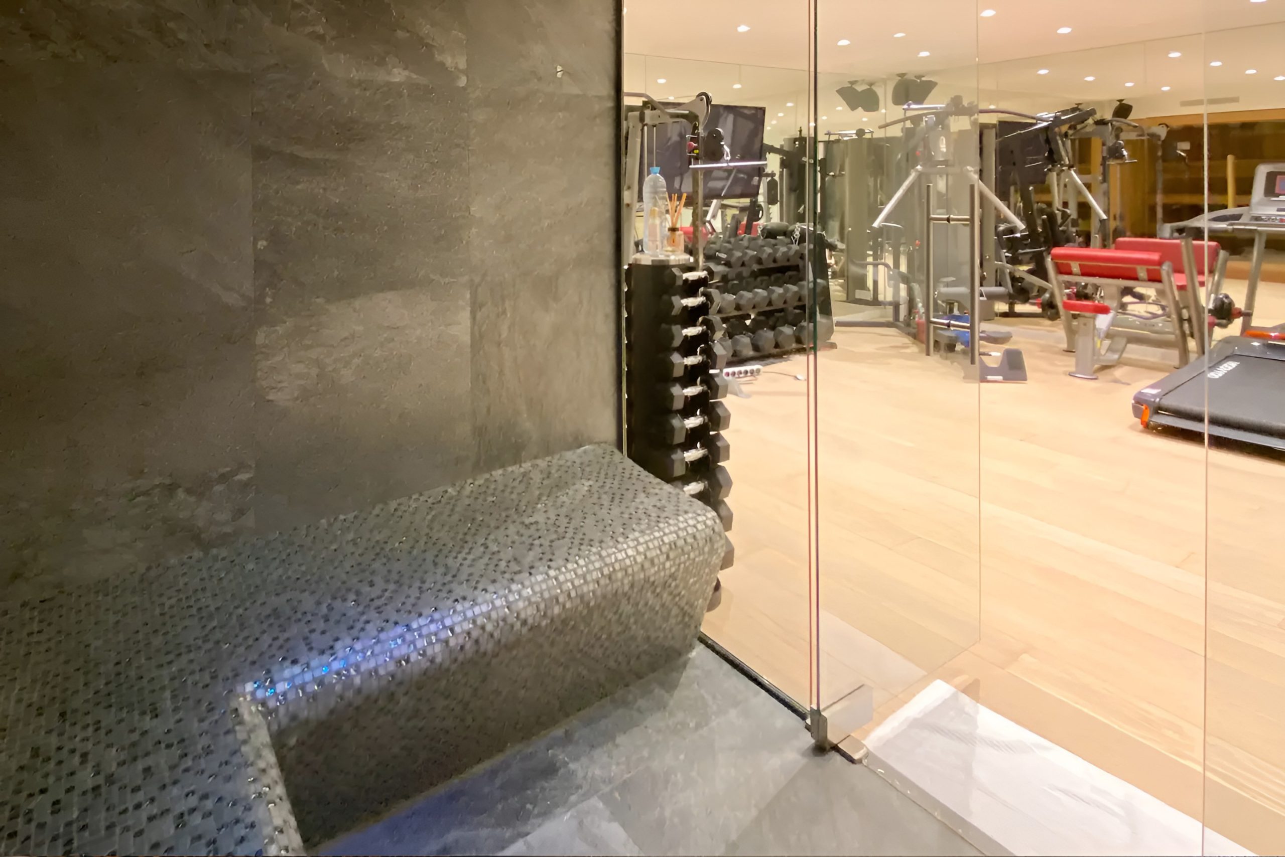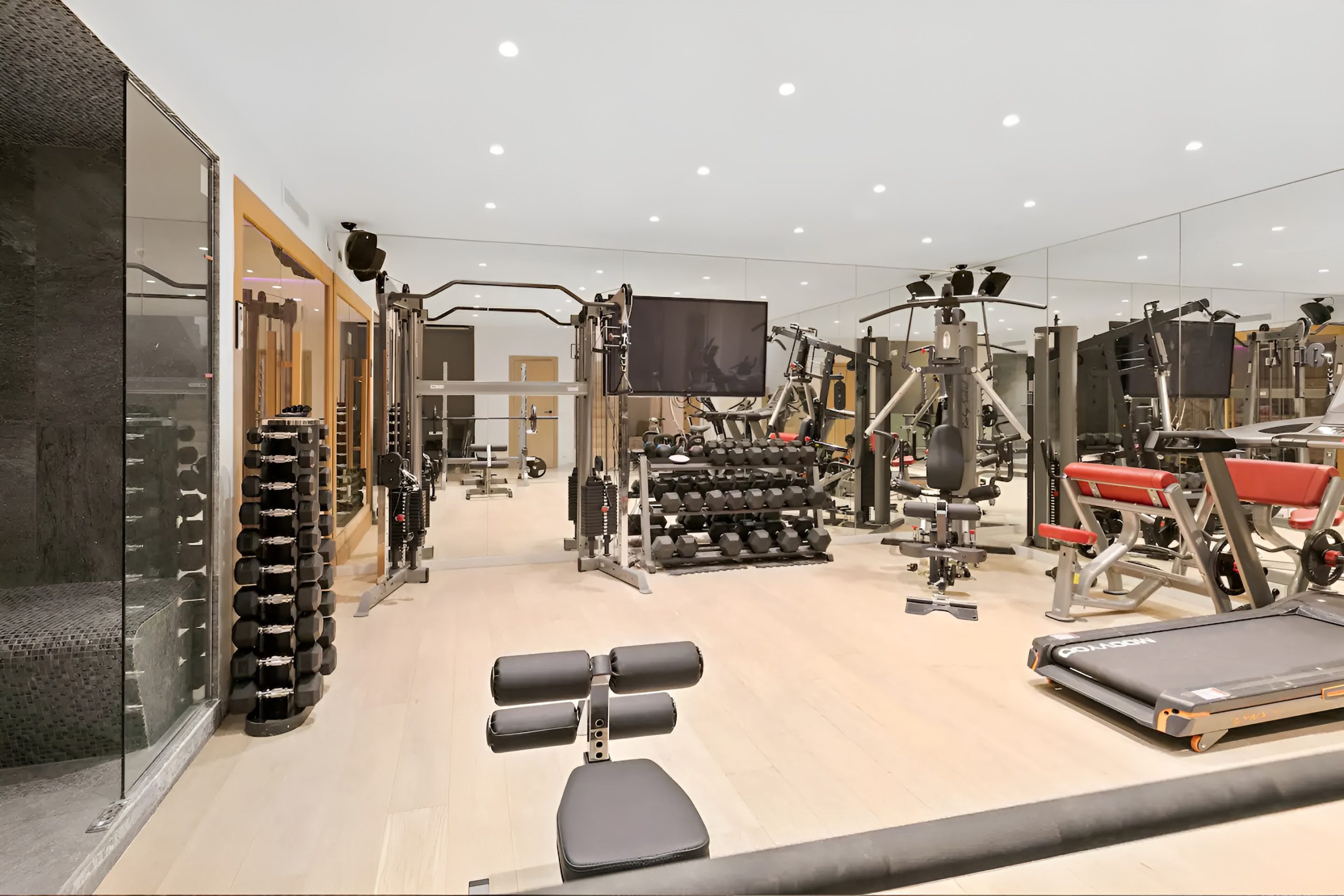 Inside, the sleek gourmet kitchen features an onyx bar and glass-encased wine rack, and serves an open-concept living/dining area opening to the pool. Luminous white walls play host to gallery-worthy artwork in a vibrant contemporary style. An elevator offers easy access to the fully equipped fitness center, cinema room and sauna. Gorgeous natural materials throughout the home include French oak, American walnut, and Burmese teak.