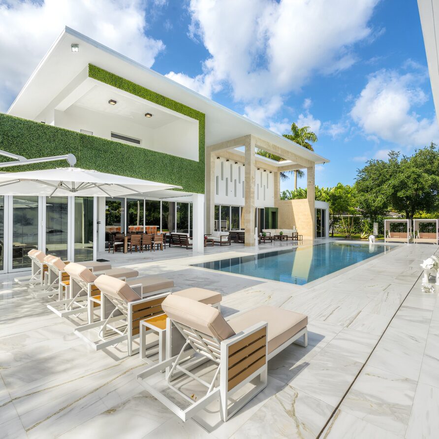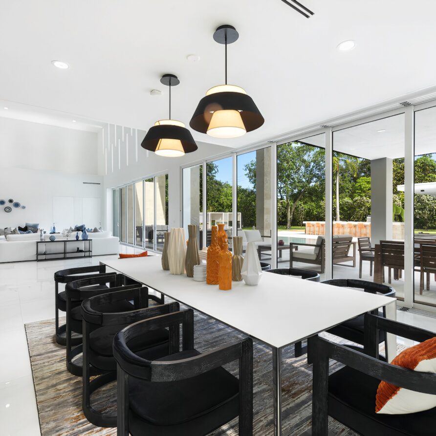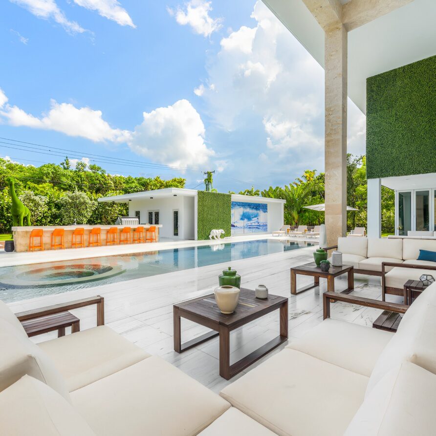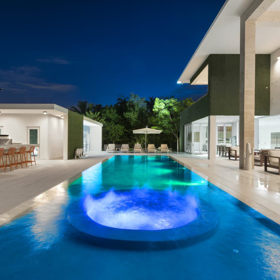 Experience seamless indoor/outdoor living with sliding glass doors opening to a lovely pool and integrated Jacuzzi. This outdoor space has it all with covered and open living rooms, a dedicated cabana bath and with an incredible lighting that ties in modern flair and nature.