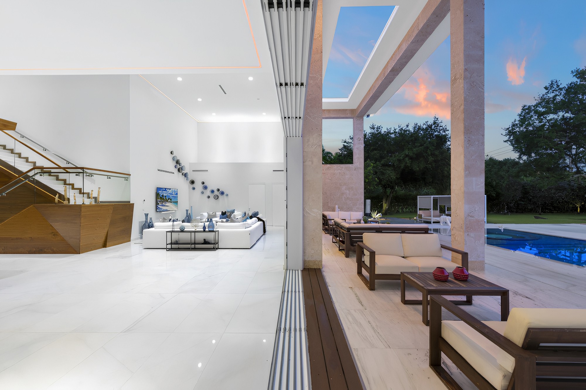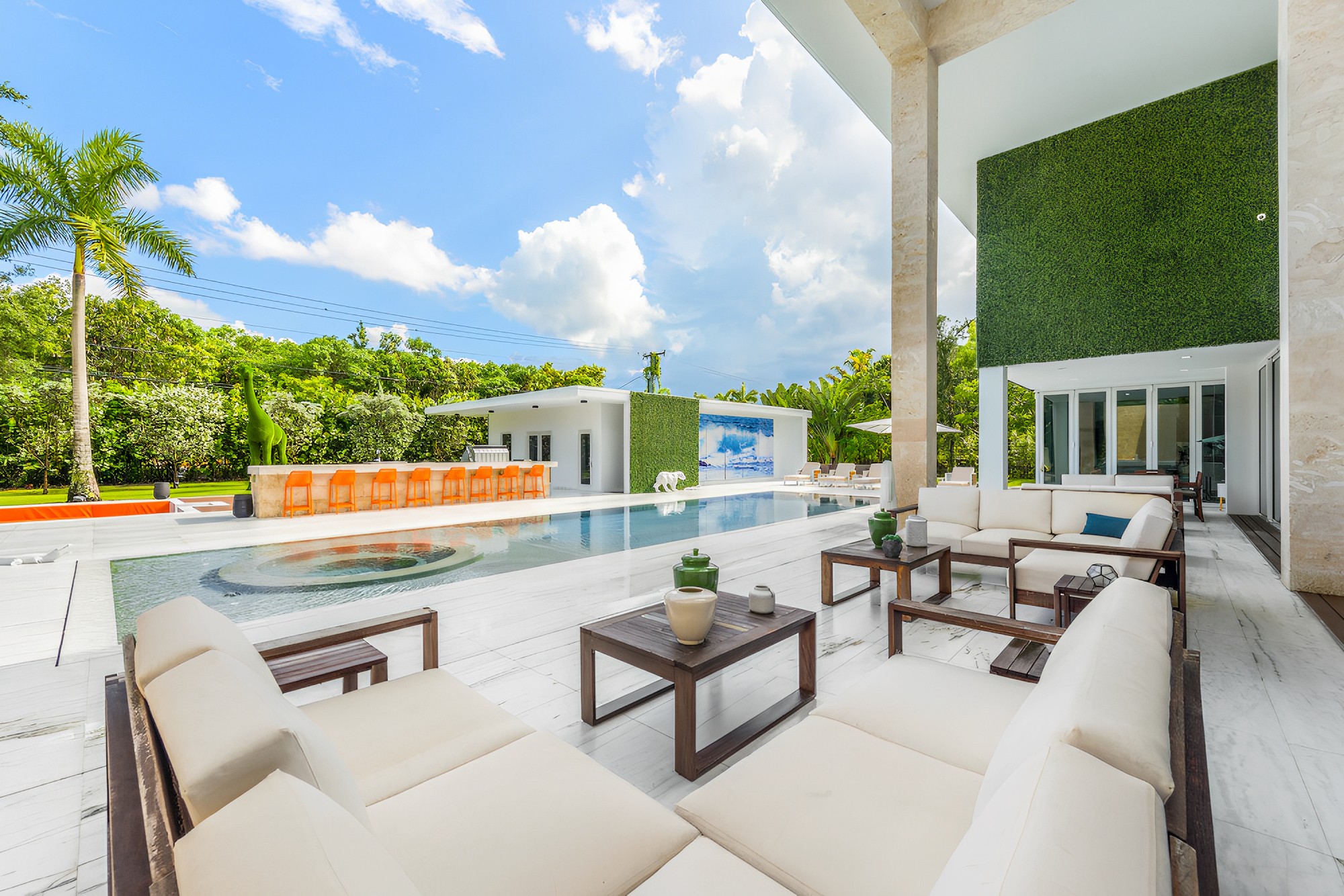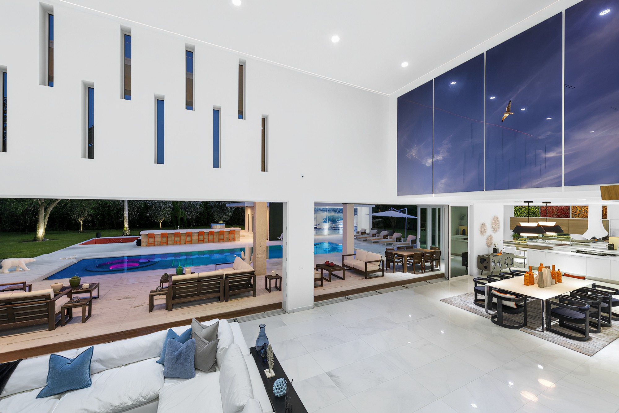 Experience seamless indoor/outdoor living with sliding glass doors opening to a lovely pool and integrated Jacuzzi. This outdoor space has it all with covered and open living rooms, a dedicated cabana bath and with an incredible lighting that ties in modern flair and nature.