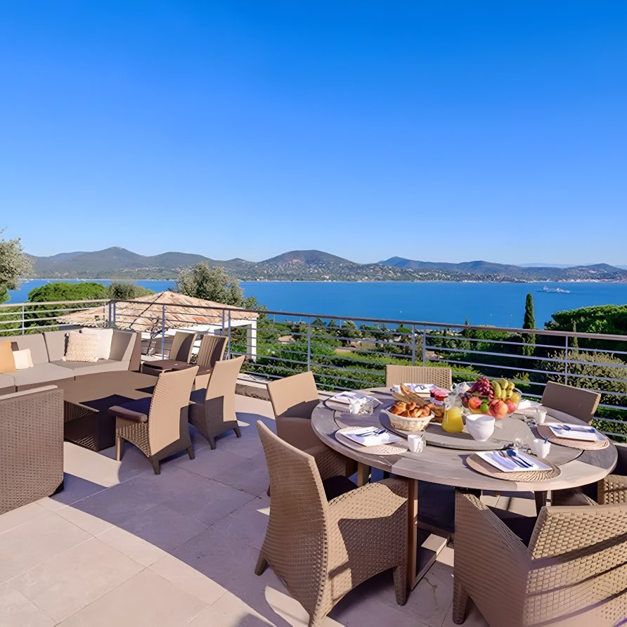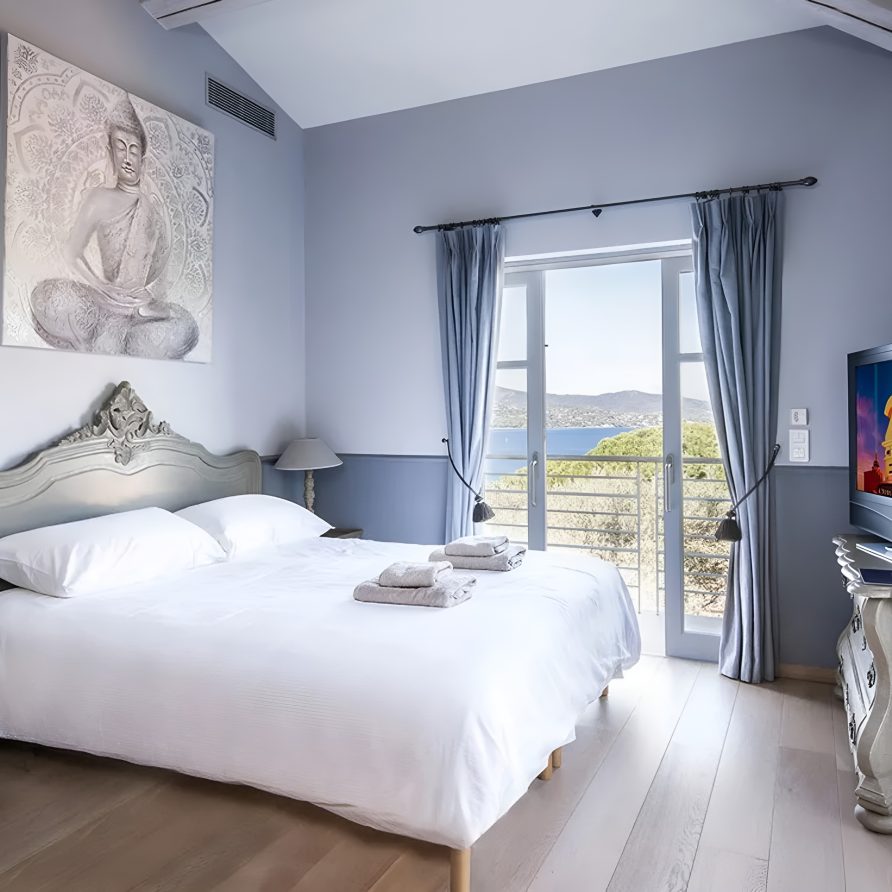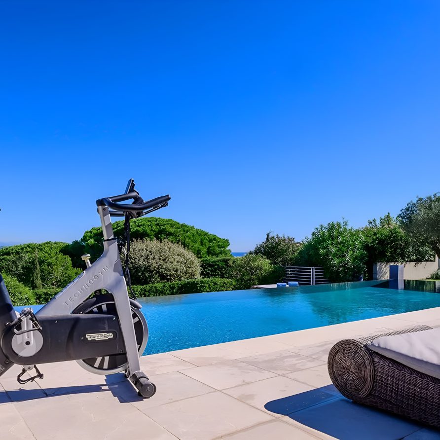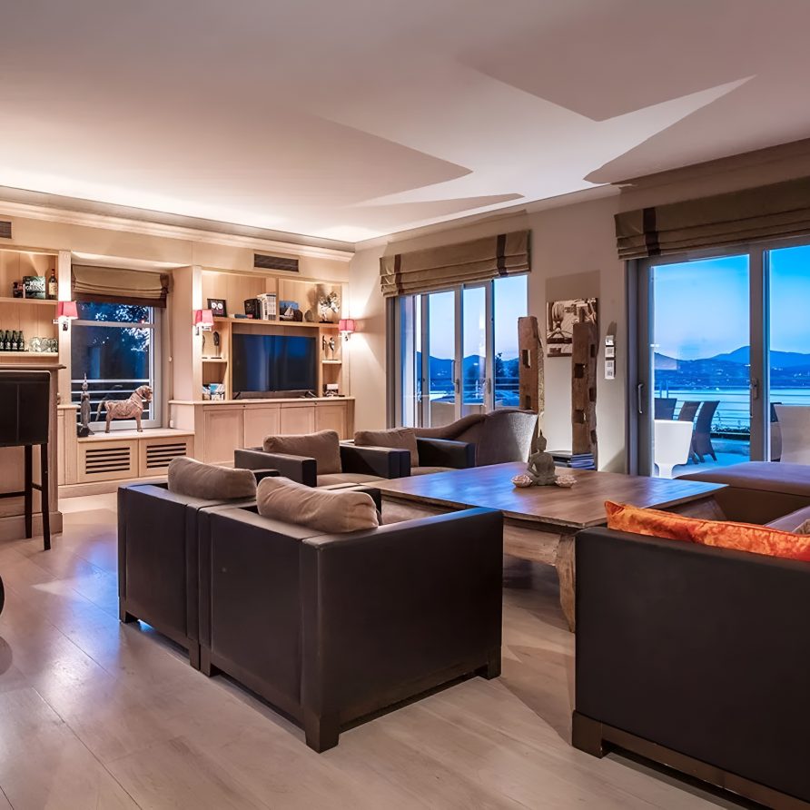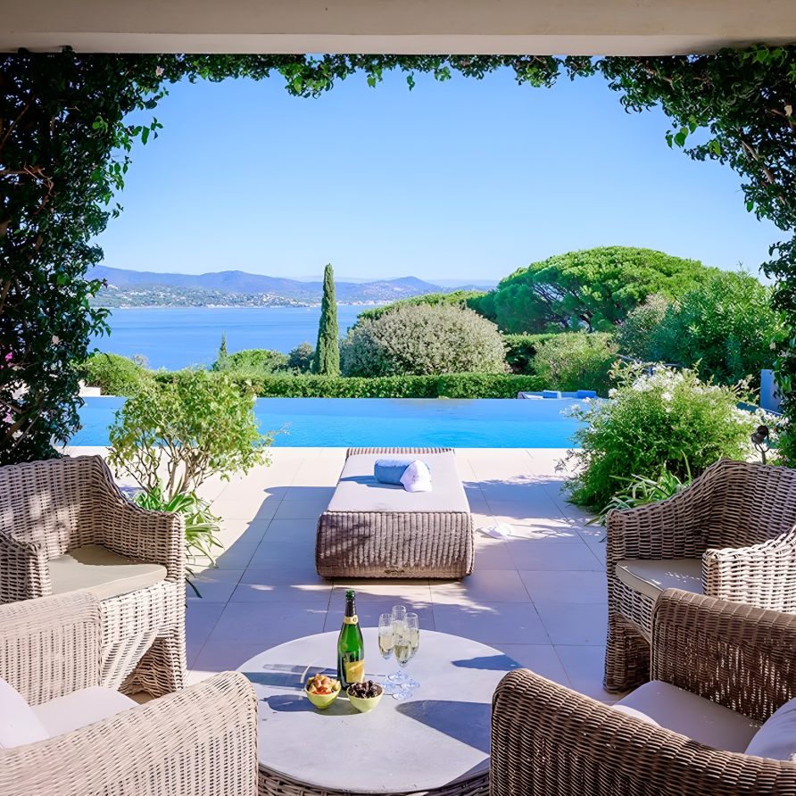 Outside, villa offers something for everyone. A haven for relaxation, the heavenly infinity swimming pool is something to be desired and is the perfect place to cool down after soaking up the sun on the loungers. St. Tropez bay, port and town, in all their alluring beauty, can be surveyed from the bubbles of the outdoor hot tub, complimented with a sip of something nice or afternoon snack from the nearby pool house. The pool house comes complete with a Hammam, shower and kitchenette, saving you the short trip inside the villa. The peace and tranquillity of the private gardens, complete with palm and olive trees, contribute to the overall calming environment radiated by the outside space. Shady terraces and a boules court can also be found out here, in addition to a fire-pit which enables you to stargaze across the St. Tropez bay long after the sun has set.