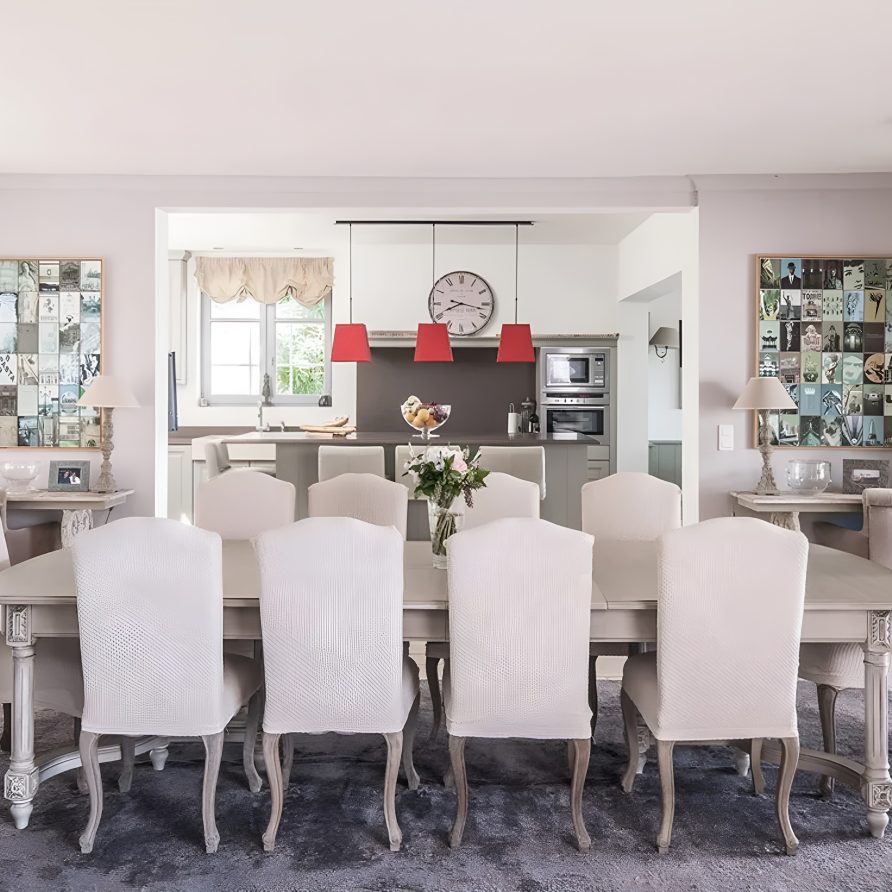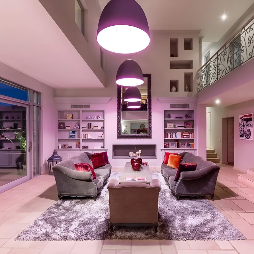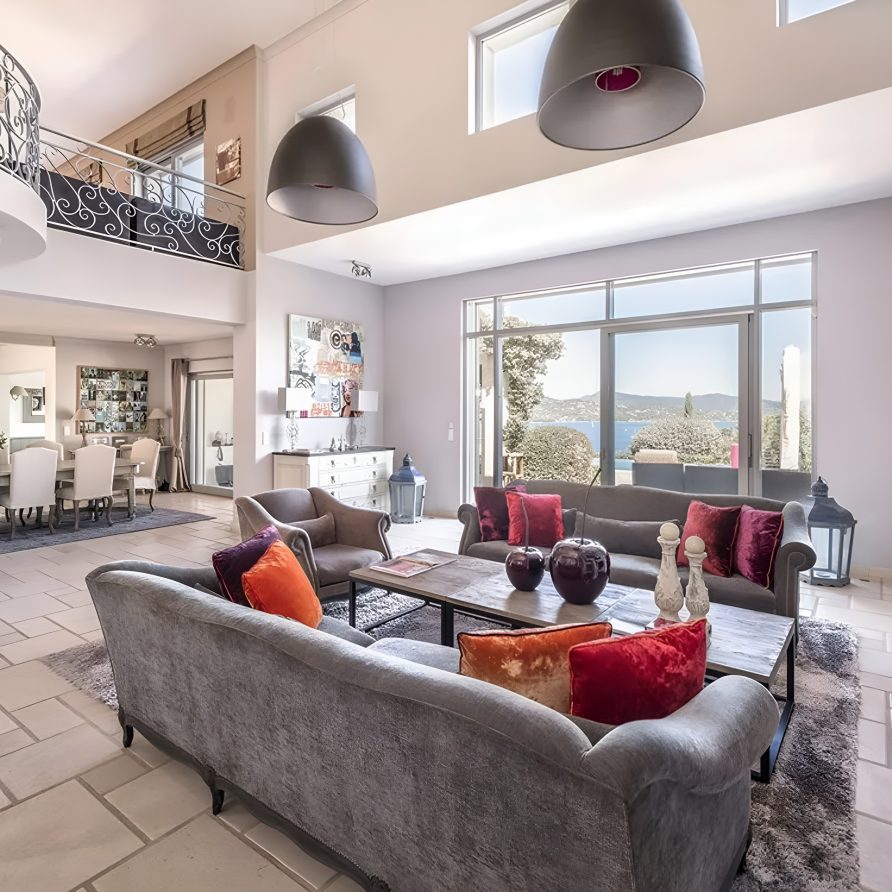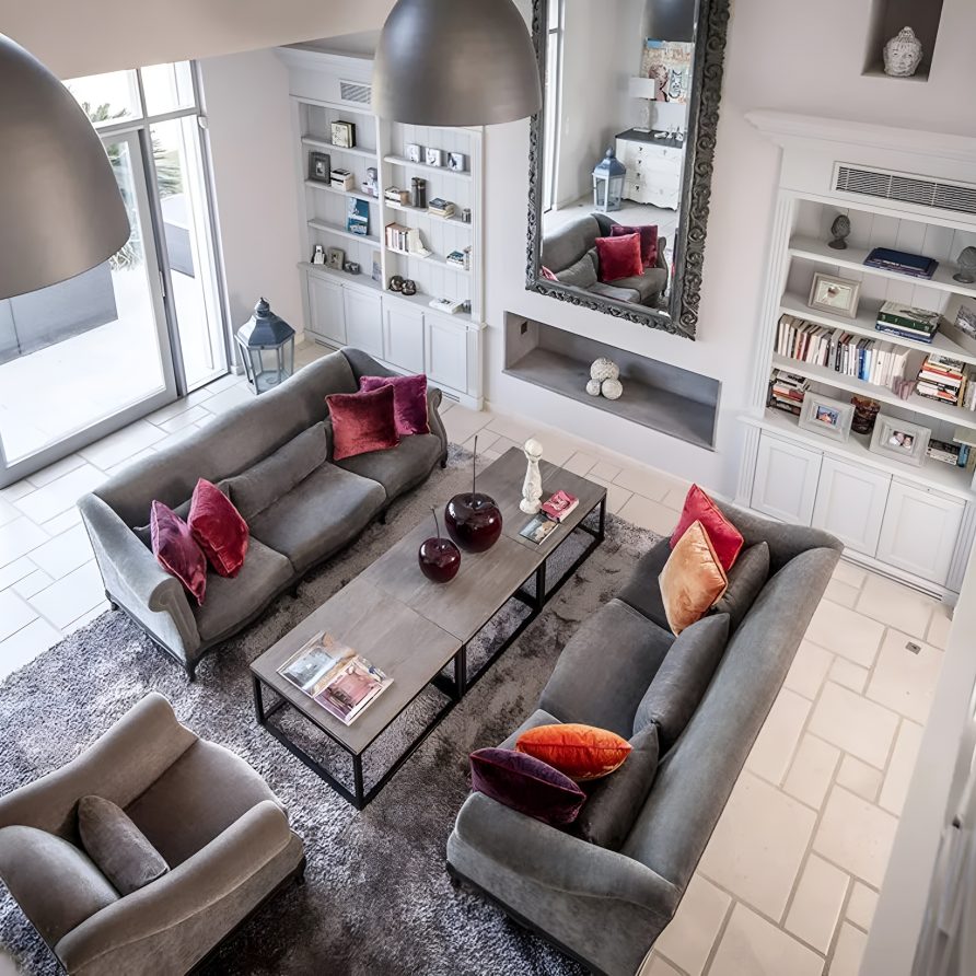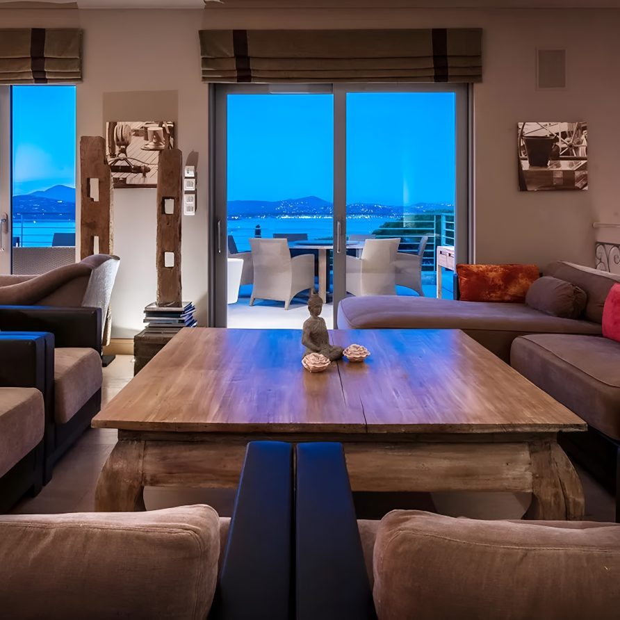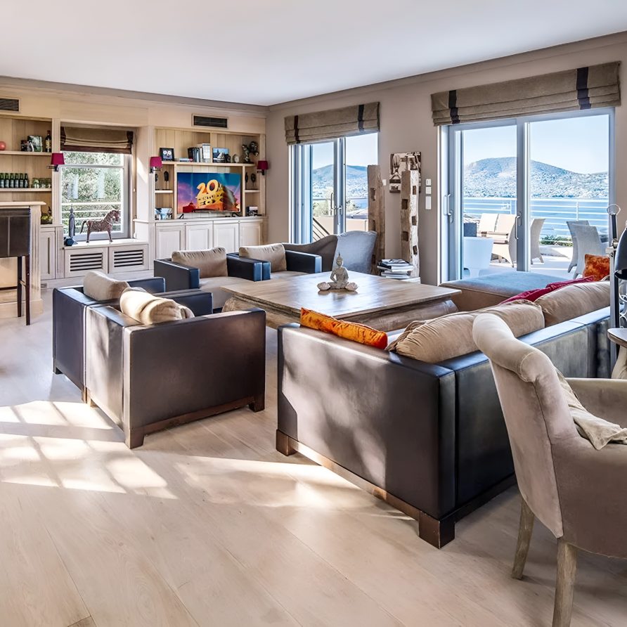Elegance and sophistication ooze out of villa de luxury interiors. Double-height ceilings feature, harmoniously contributing to the light and airy atmosphere. An ample amount of windows fill the room with natural light, as well as capturing the scenic landscape outside, with sumptuous sofas perfectly positioned to maximize these views. Dedicated to entertaining, the large dining table will comfortably host the whole group should you not wish to dine outside.