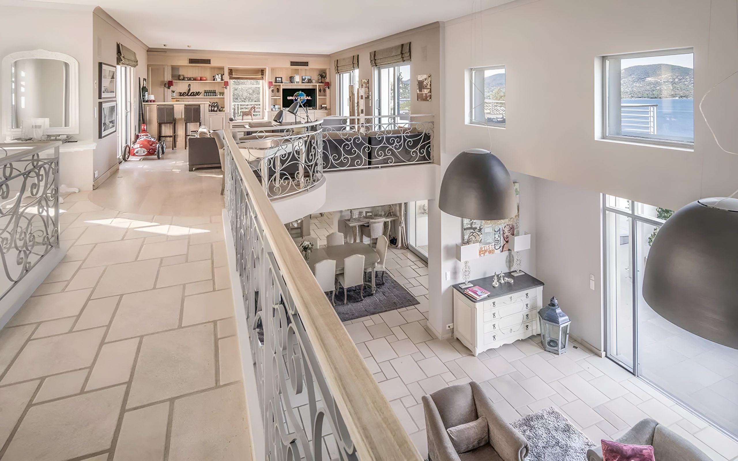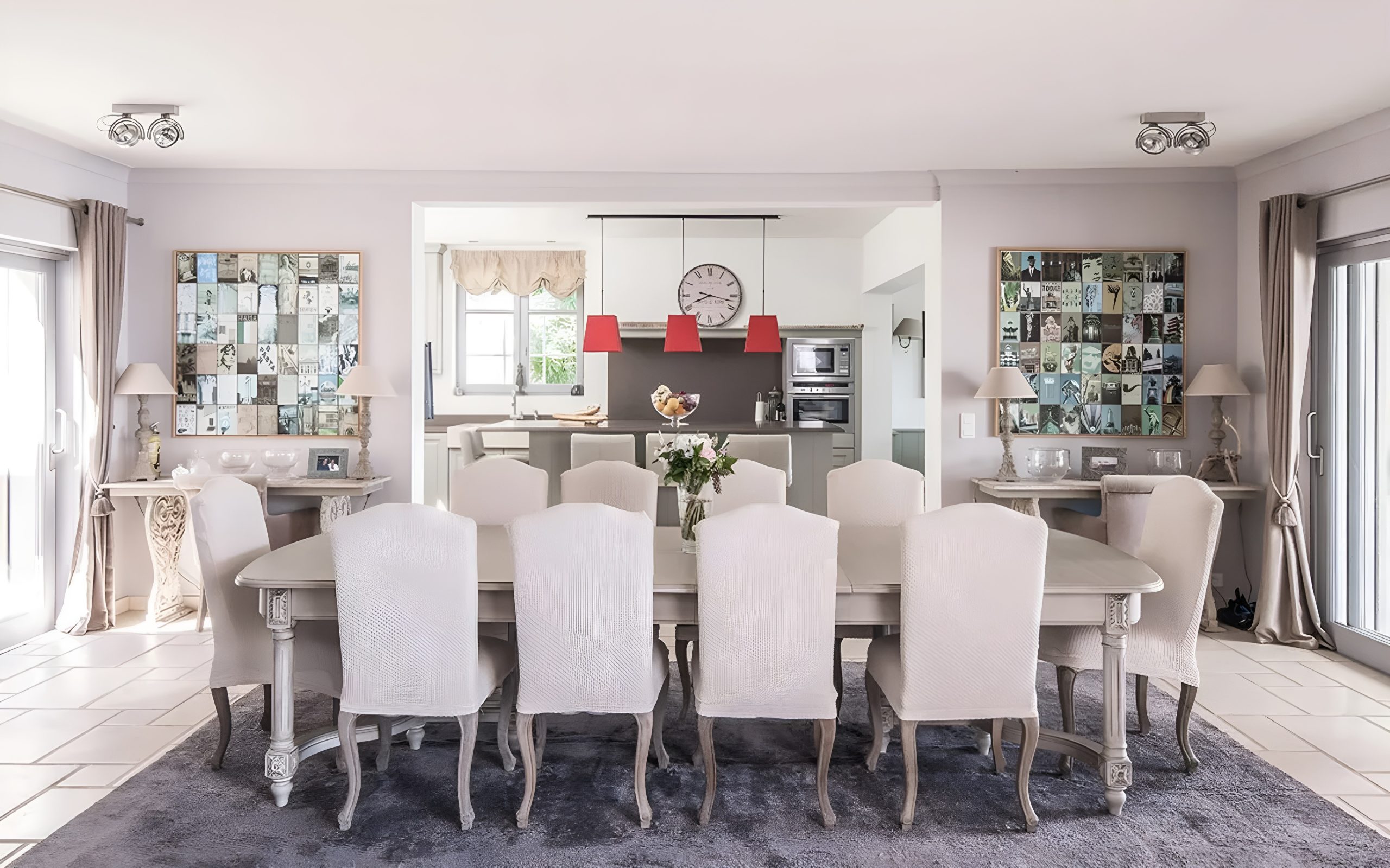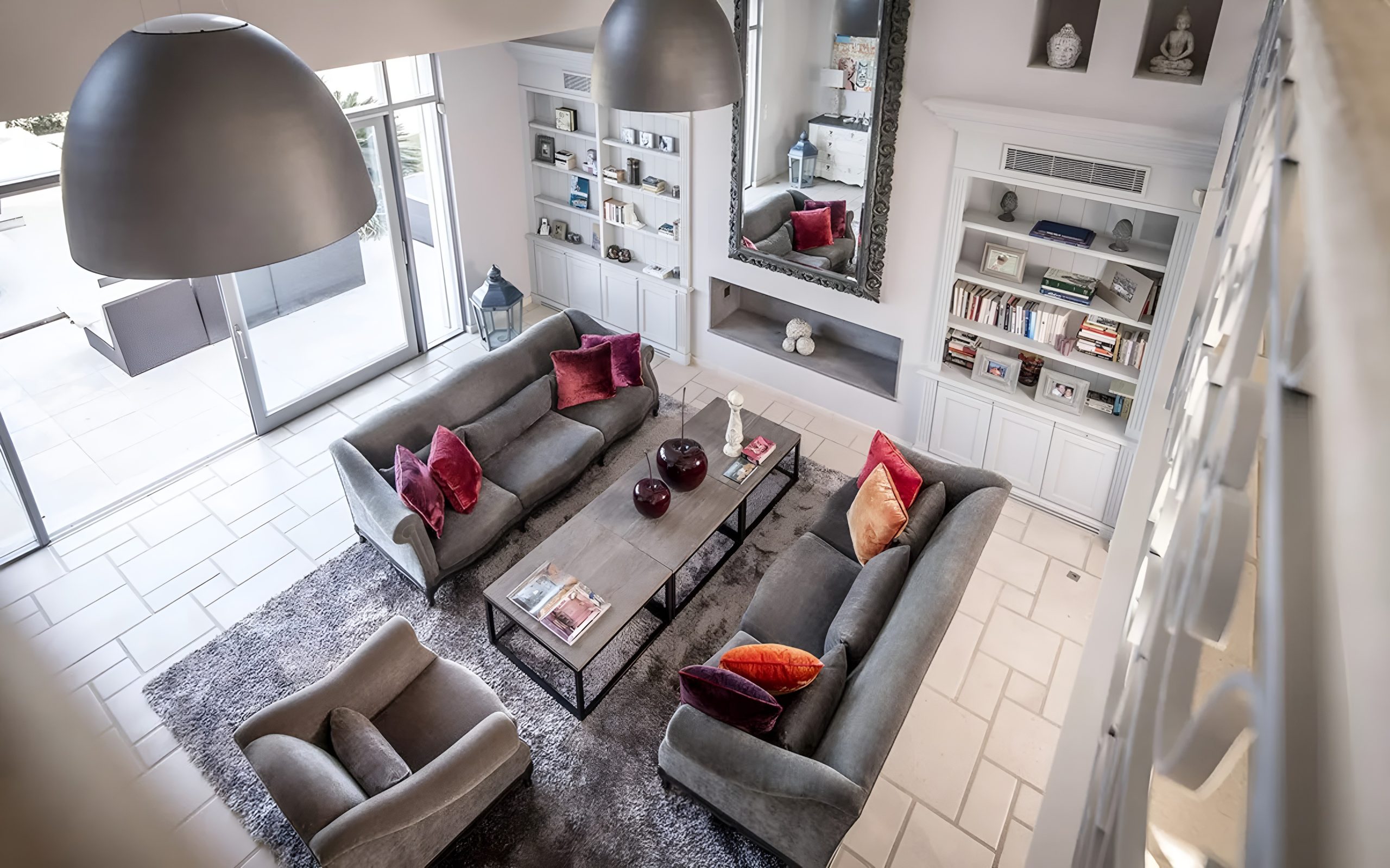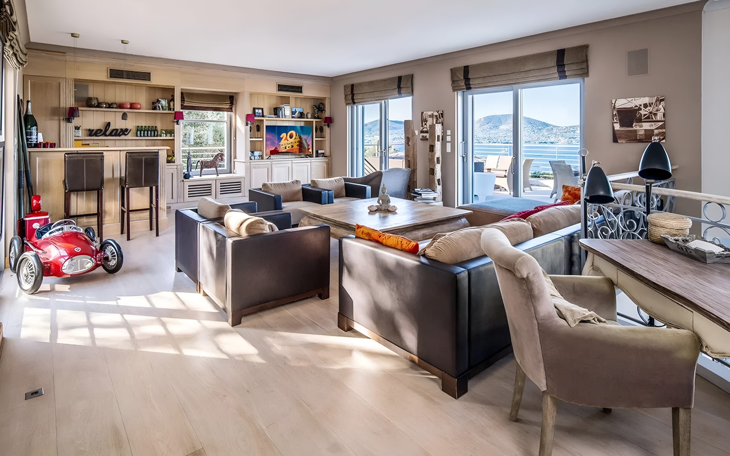 Elegance and sophistication ooze out of villa de luxury interiors. Double-height ceilings feature, harmoniously contributing to the light and airy atmosphere. An ample amount of windows fill the room with natural light, as well as capturing the scenic landscape outside, with sumptuous sofas perfectly positioned to maximize these views. Dedicated to entertaining, the large dining table will comfortably host the whole group should you not wish to dine outside.